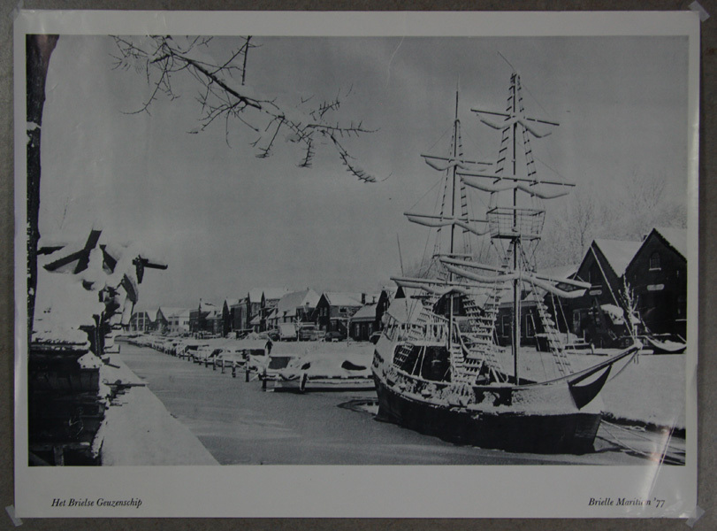 Poster in zwartwit van het Geuzenschip "De Prince Admirael" in de haven van Brielle en sneeuwlandschap.
