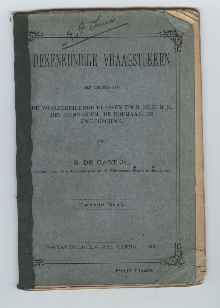 Boek, dun, voorzien van blauwe kaft getiteld: 'REKENKUNDIGE VRAAGSTUKKEN' door S. de Gast.