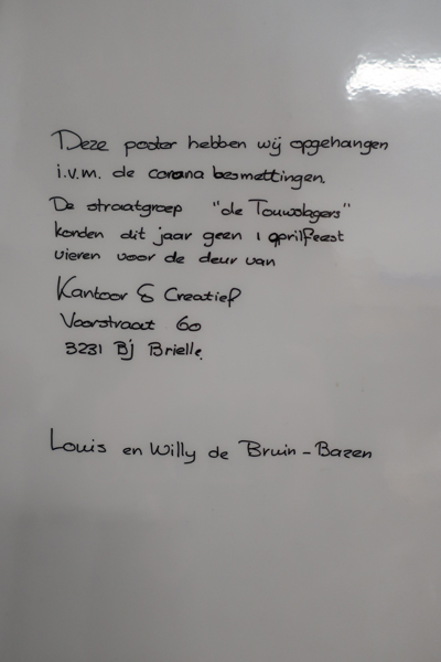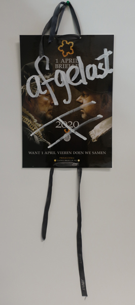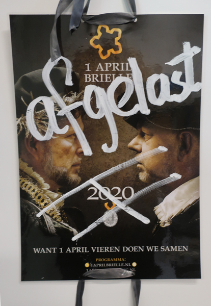 Geplastificeerde poster of affiche met daarop '1 April 2020' en opschrift 'afgelast' met kalk in verband met het coronavirus. Op het affiche twee portretten van een Spanjaard en een Geus en profile tegenover elkaar. Diverse opschriften. Affiche is aan bovenkant en onderkant voorzien van twee grijze linten om poster om een paal te hangen.