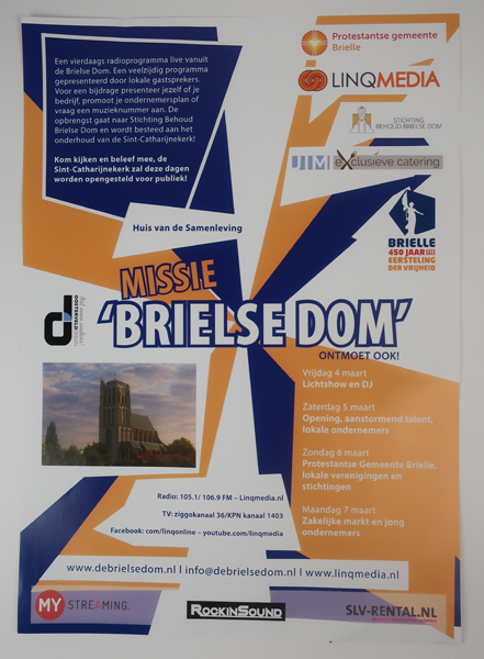 Affiche of poster getiteld: Missie 'Brielse Dom' in de kleuren van de geuzenvlag. Links in het midden een voorstelling van de Sint Catharijnekerk. Verspreid over de poster diverse opschriften.