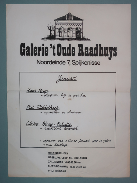 Affiche of poster van een expositie in de Galerie 't Oude Raadhuys te Spijkenisse met werken van Kees Roep, Middelhoek en Claire Stomp-Schutte.