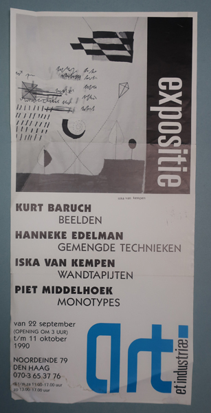 Affiche of poster van expositie Art et Industriae met werken van Kurt Baruch, Hanneke Edelman, Iska van Kempen en Piet Middelhoek (1930-2004). Poster is wit, bedrukt met zwarte en blauwe letters. Bovenaan een zwart/wit afbeelding van een werk van Iskia van Kempen.