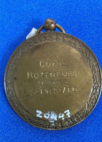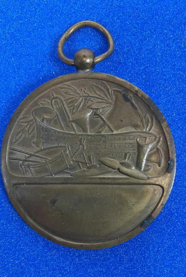 Eremedaille voor mziekconcours, met op voorkant afbeelding van muziekinstrumenten en bladmuziek. Uitgereikt aan Gemengde zangvereniging Excelsior, Zwartewaal.