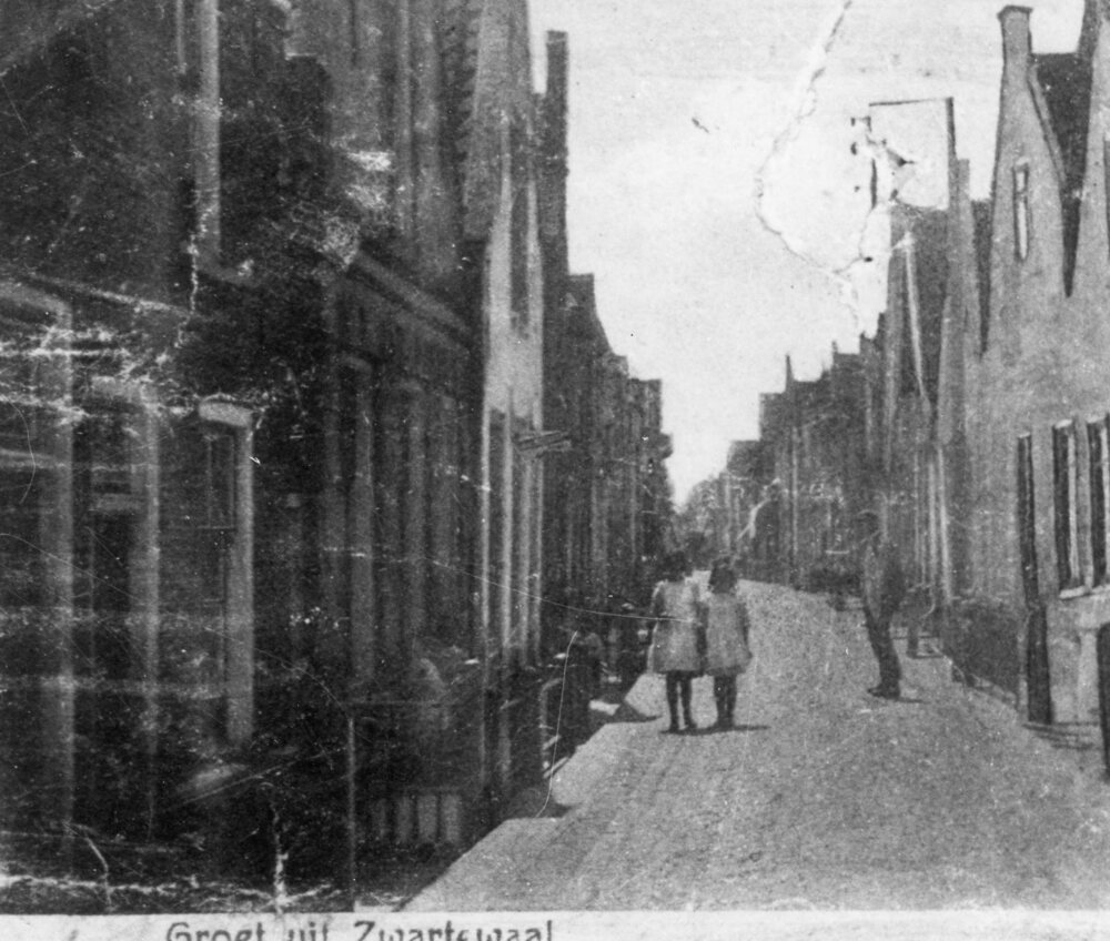 Foto zwart/wit. Groeten uit Zwartewaal: kijkje in de Dorpsstraat ca. 1925.
