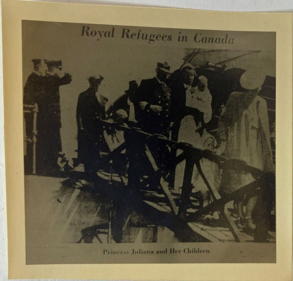 Foto van de aankomst van Prinses Juliana in Canada. Boven de foto de tekst"Royal Refugees in Canada". Onder de foto de tekst "Princess Juliana and Her Children".
