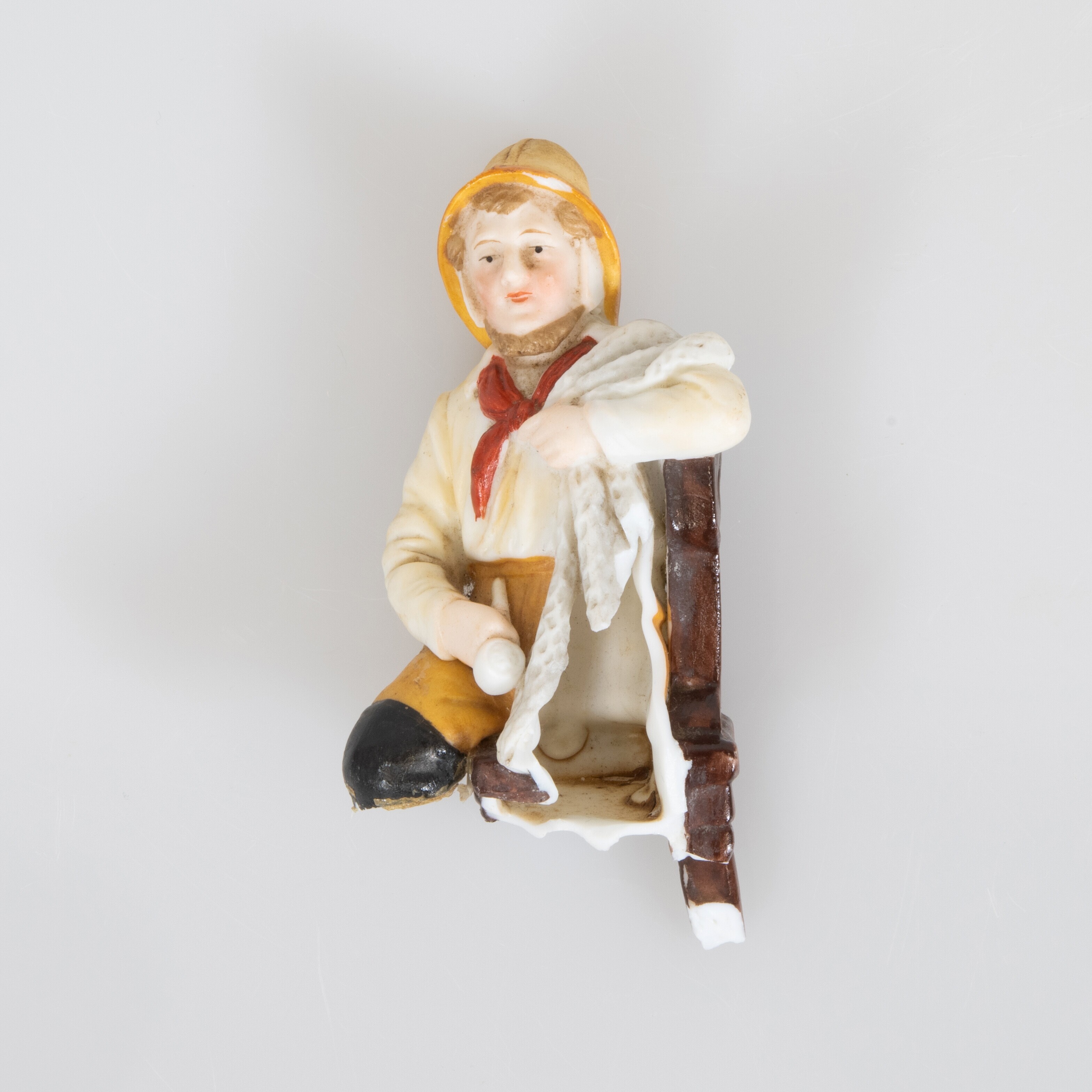 Beeldje; zittende visser op een stoel met in zijn rechterhand een pijp en over zijn linkerschouder een net; productieplaats: Duitsland