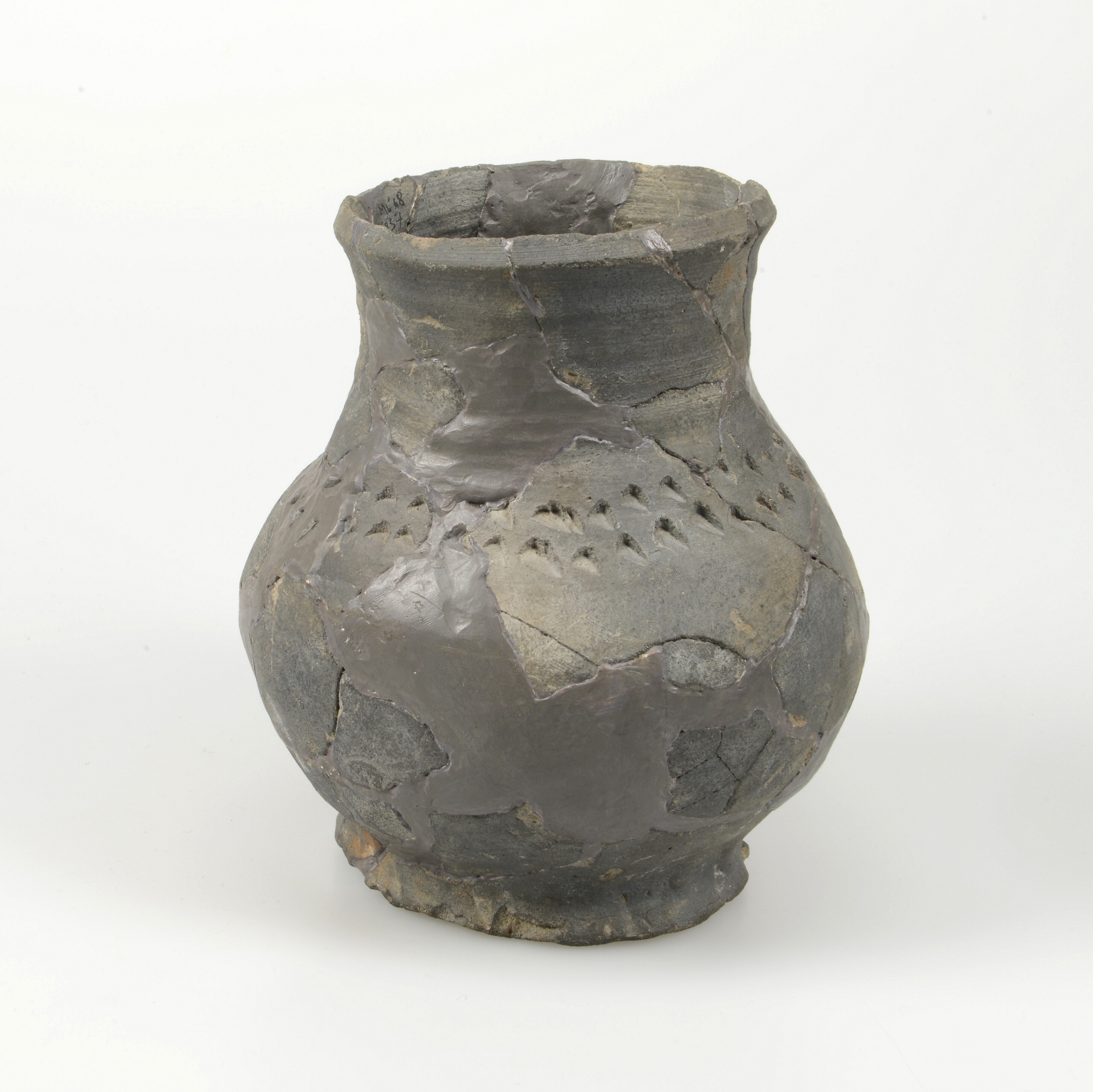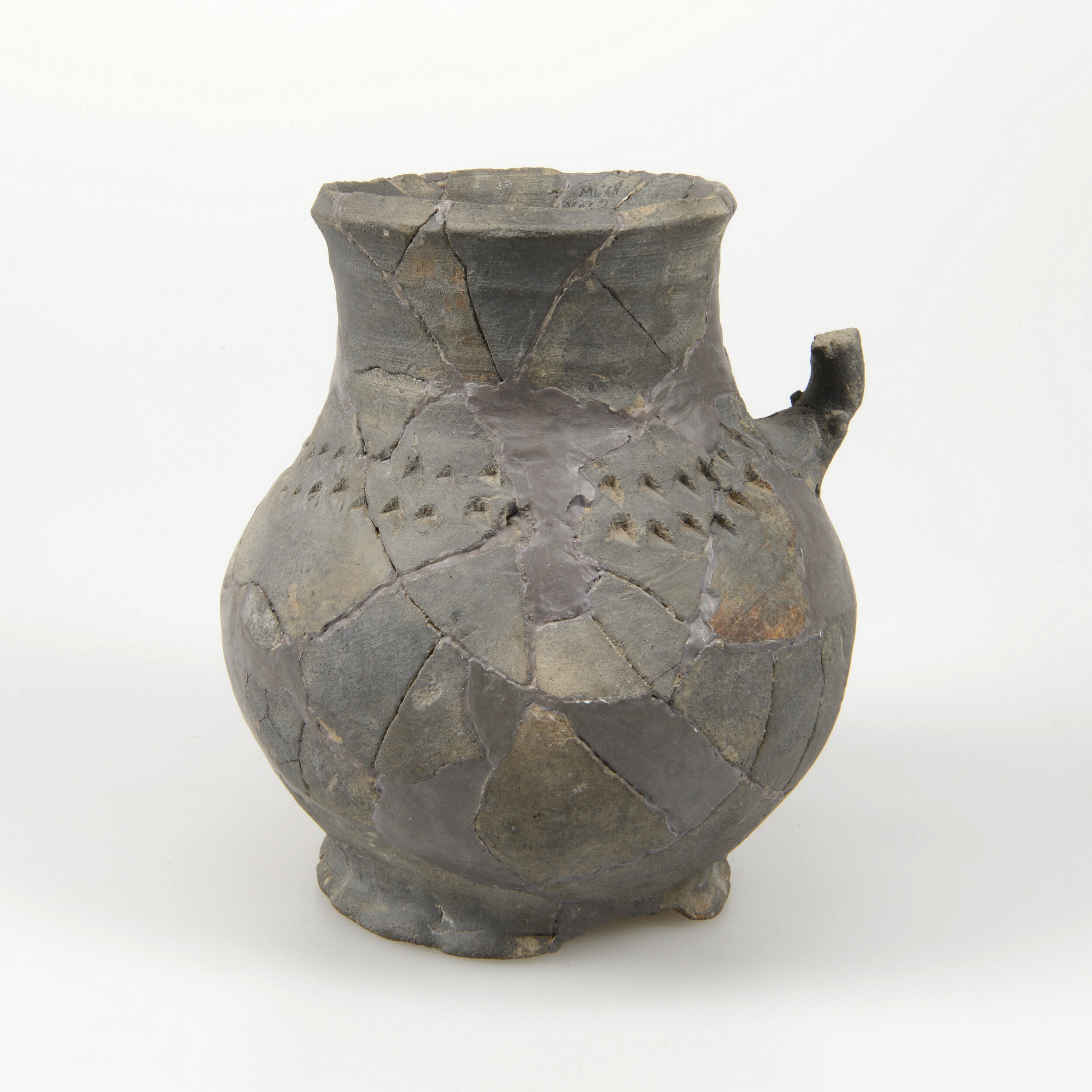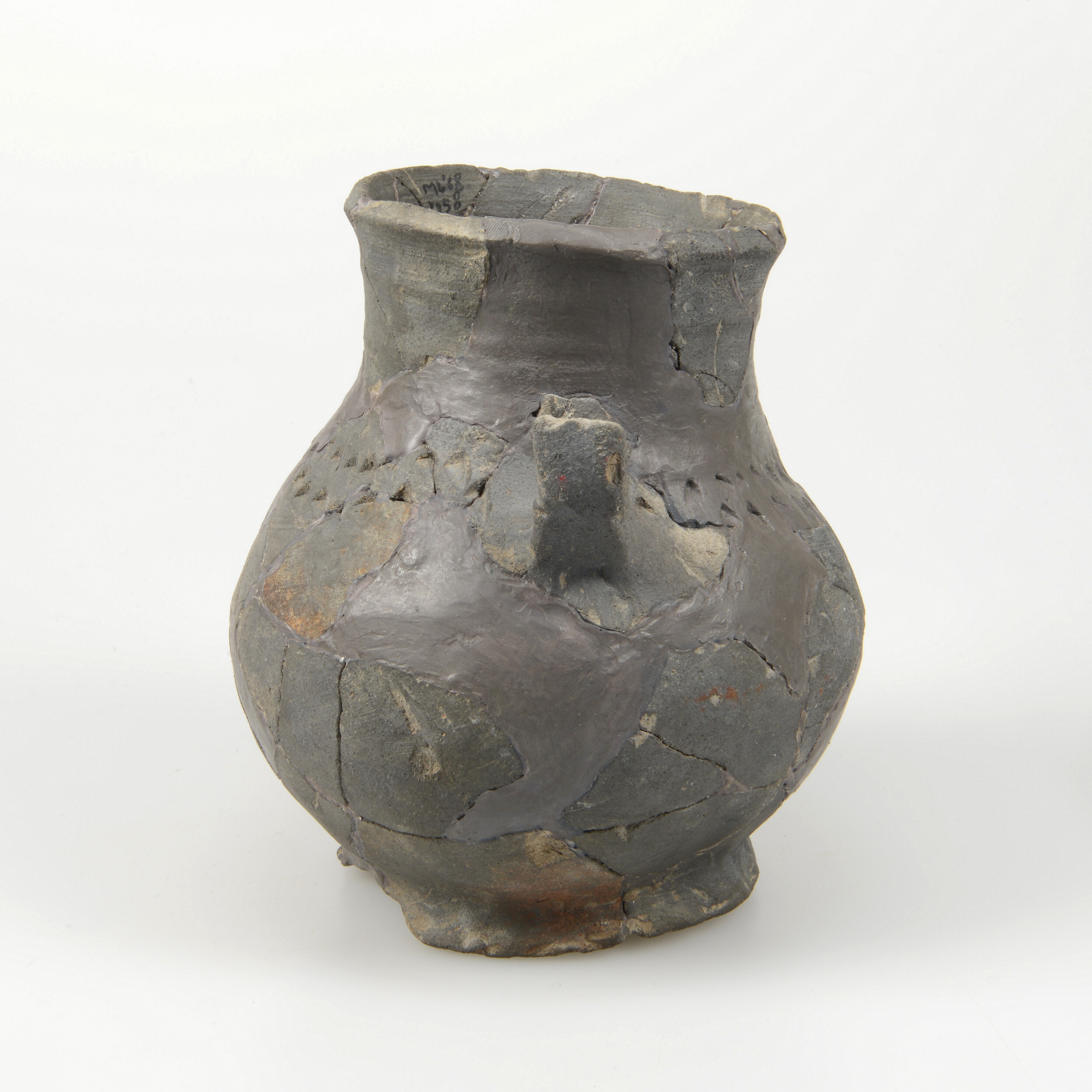 Kan; g-kan-16; grijsbakkend aardewerk; spatelindrukken op schouder; verticaal lintoor; ingeknepen standring