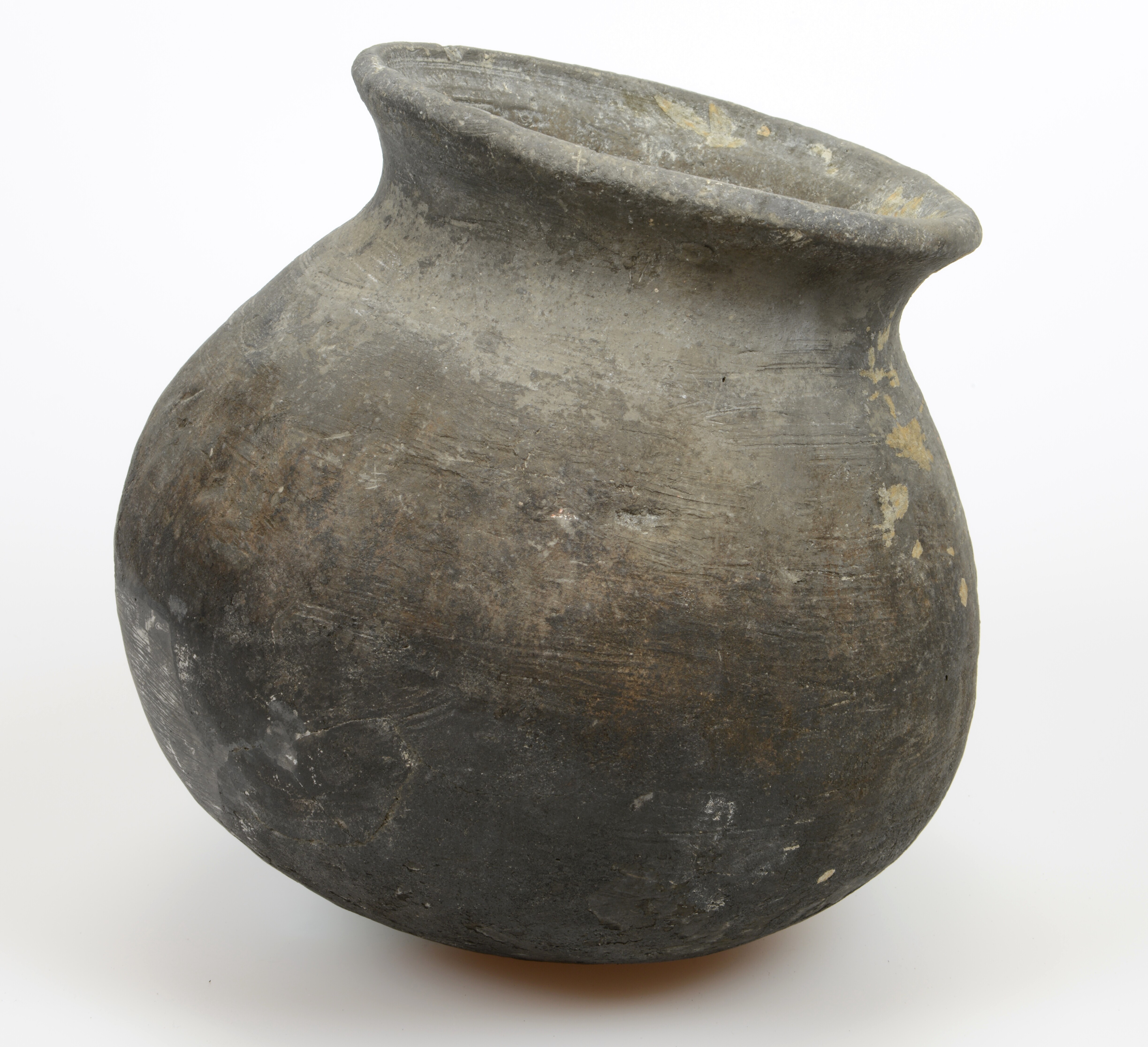 Kogelpot; kp-kog-2; kogelpot met driehoekig verdikte rand, lip aan de binnenzijde; kogelpotaardewerk; bezemstreekversiering op buik en schouder; herkomst: Noord/West-Nederland