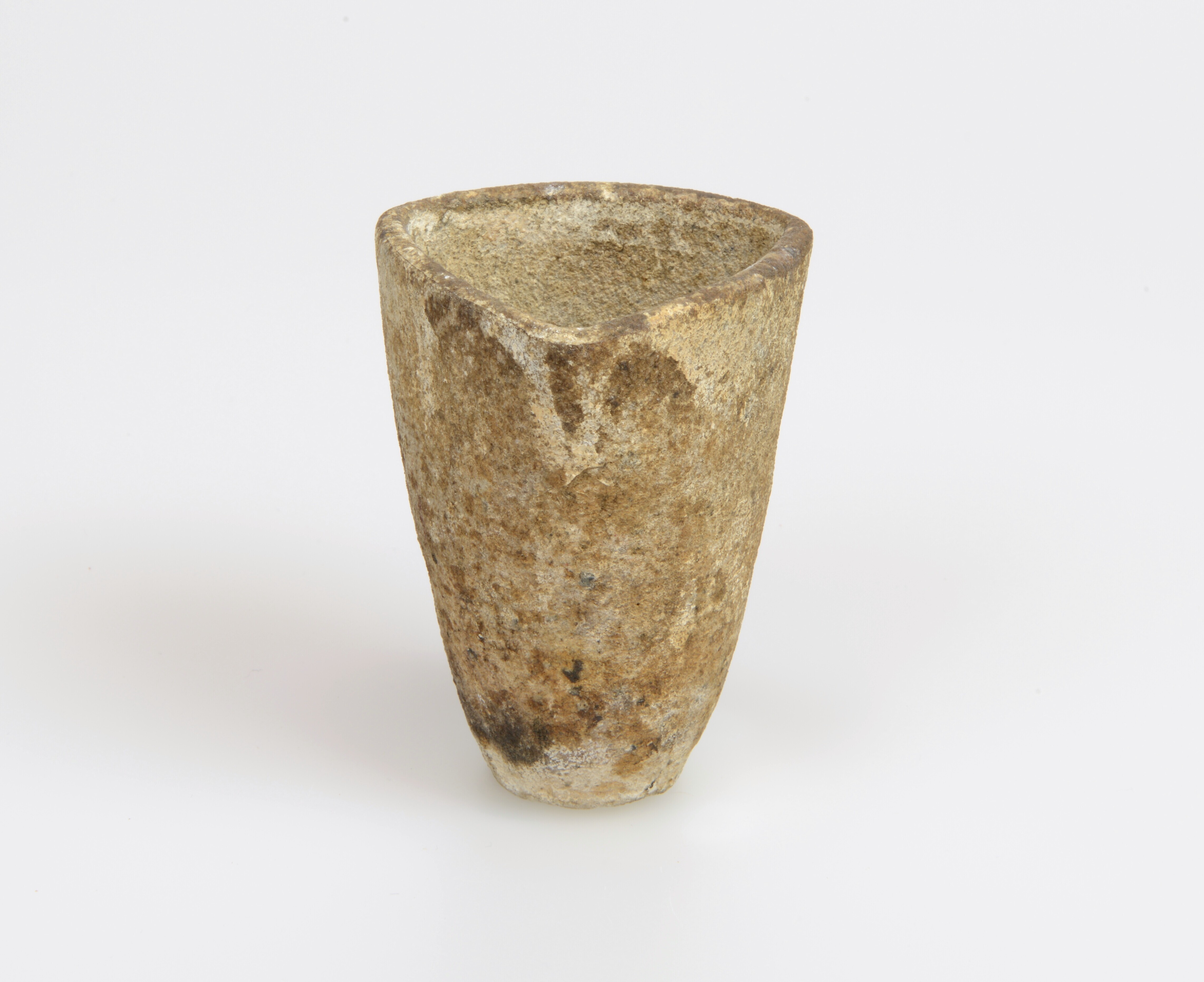 Smeltkroes; w-sme-2; conische driehoekige smeltkroes, standvlak; grof gemagerd witbakkend aardewerk; herkomst: Hessen, Duitsland