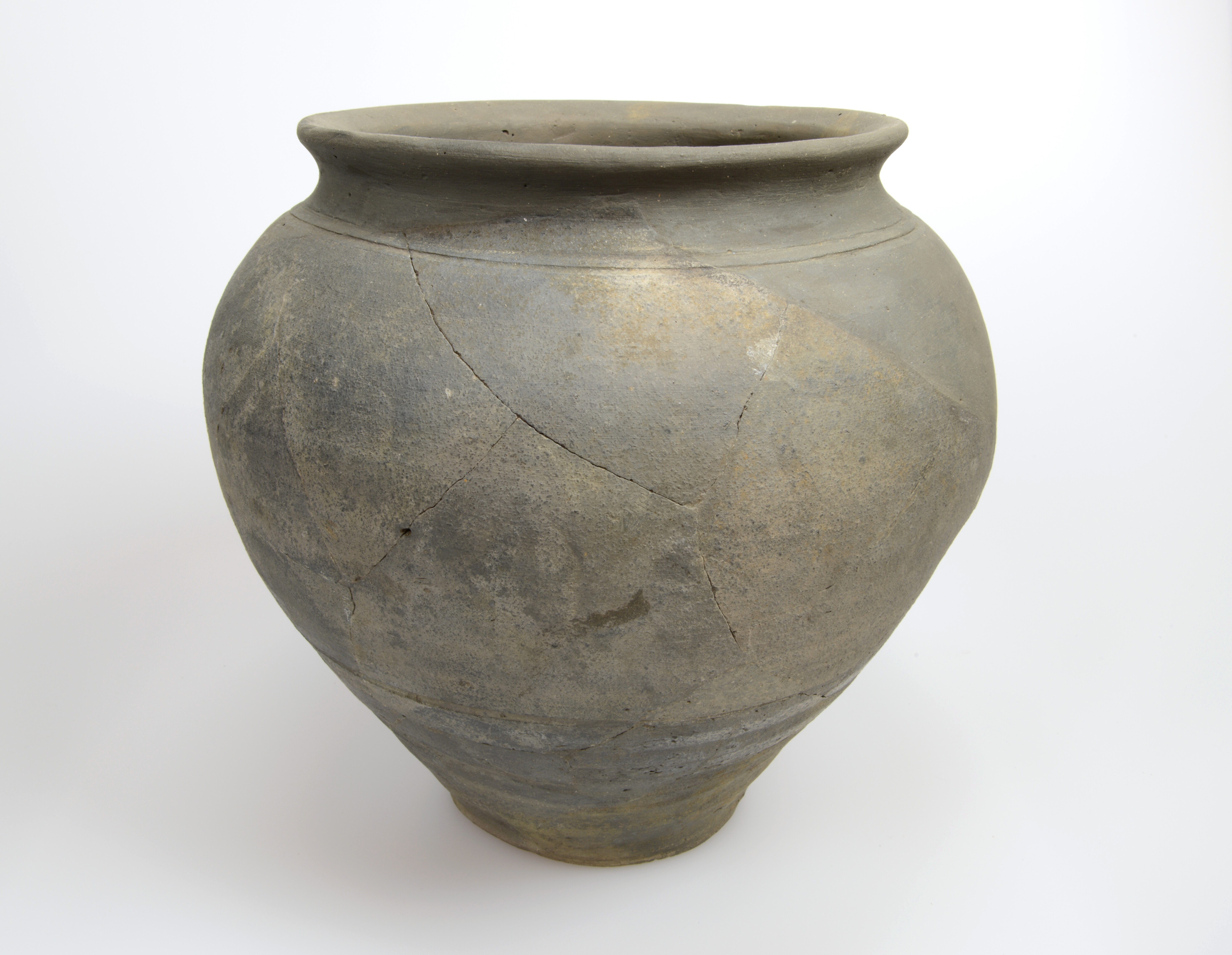 Kookpot; type Stuart 201a; ruwwandig aardewerk; bolvormige pot met afgeplatte rand en twee horizontale groeven op de schouder onder de hals; standvlak; vondstjaar: 1964