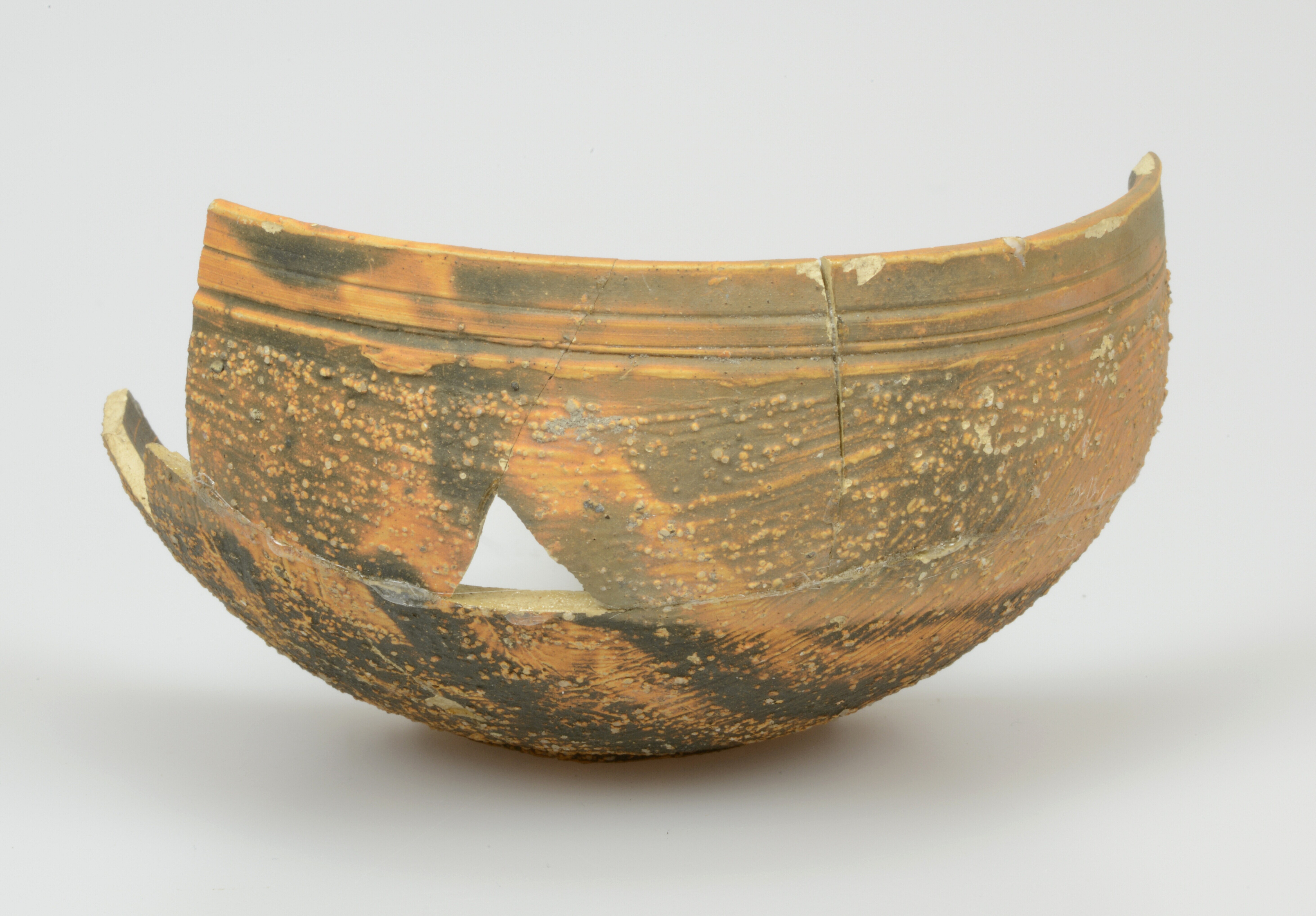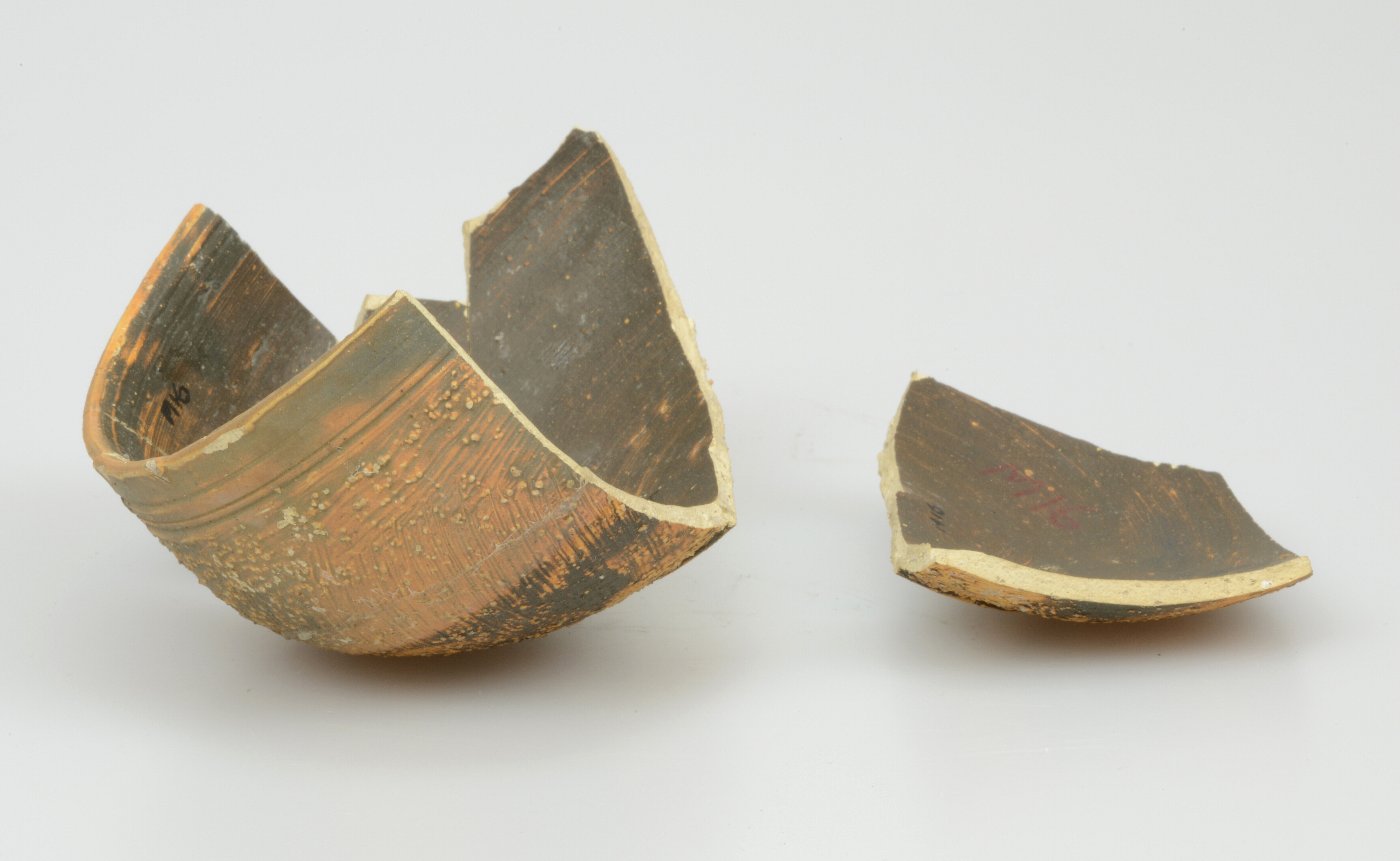 Kom; geverfd aardewerk; type Hofheim 22; halfbol kommetje op een lage standvoet; geprofileerde rand met horizontale groeven, zandbestrooiing op de wand; donkerbruine/zwarte engobe; herkomst: Lyon?; vondstgegevens: M16, 0-14