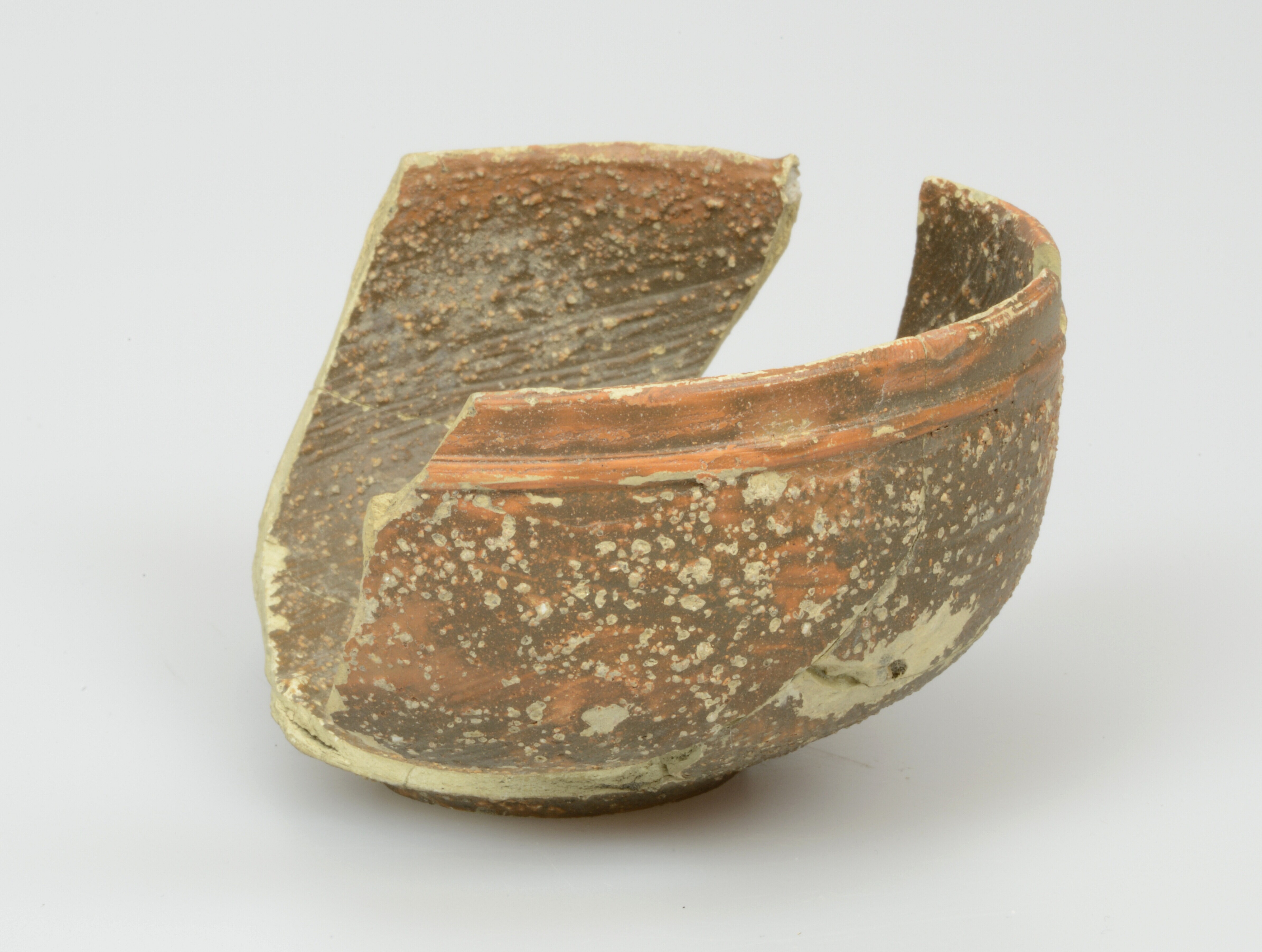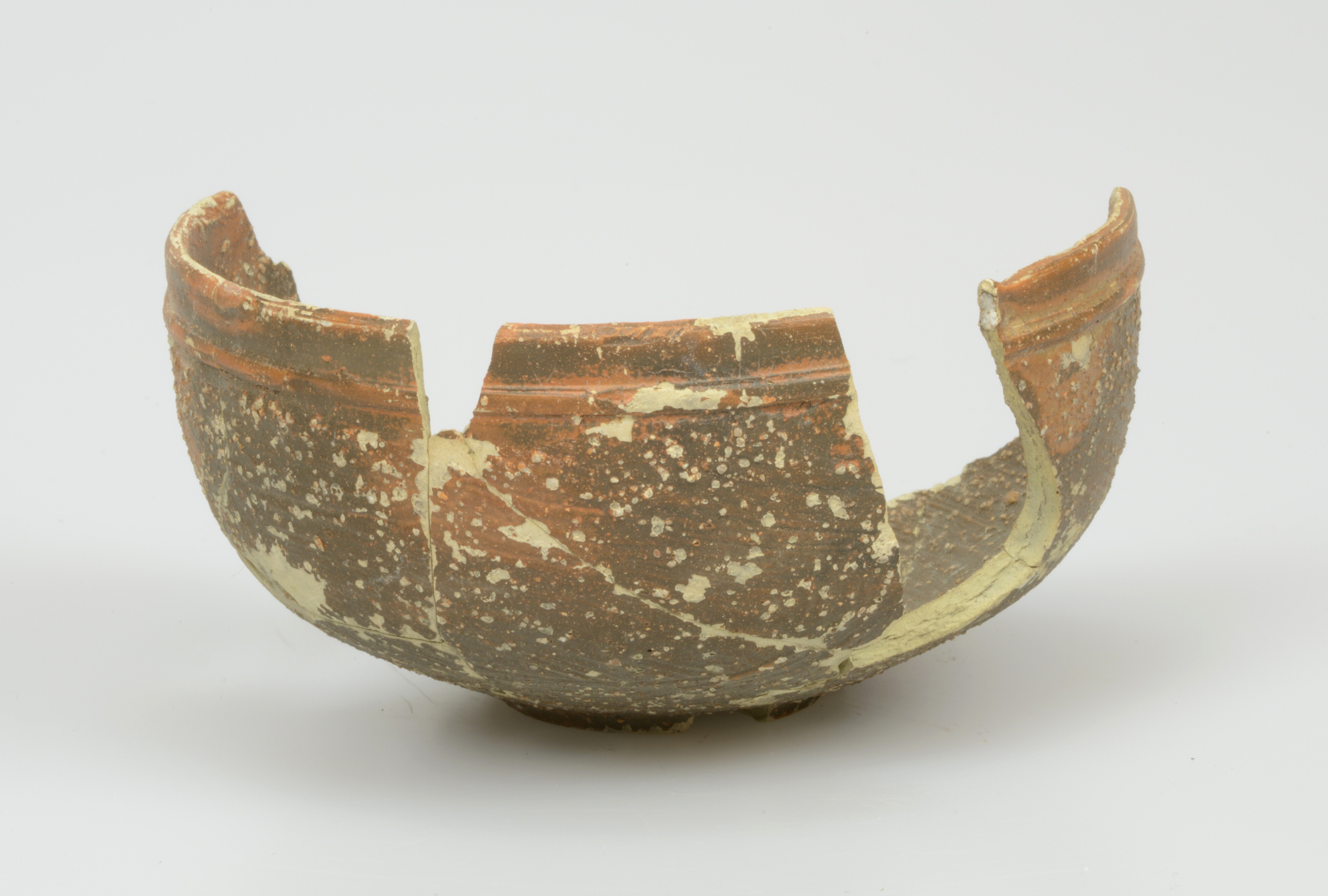 Kom; geverfd aardewerk; type Hofheim 22; halfbol kommetje op een lage standvoet; geprofileerde rand met horizontale groef, zandbestrooiing op de wand; donkerbruine/zwarte engobe; herkomst: Lyon?; vondstgegevens: M16, 0-4