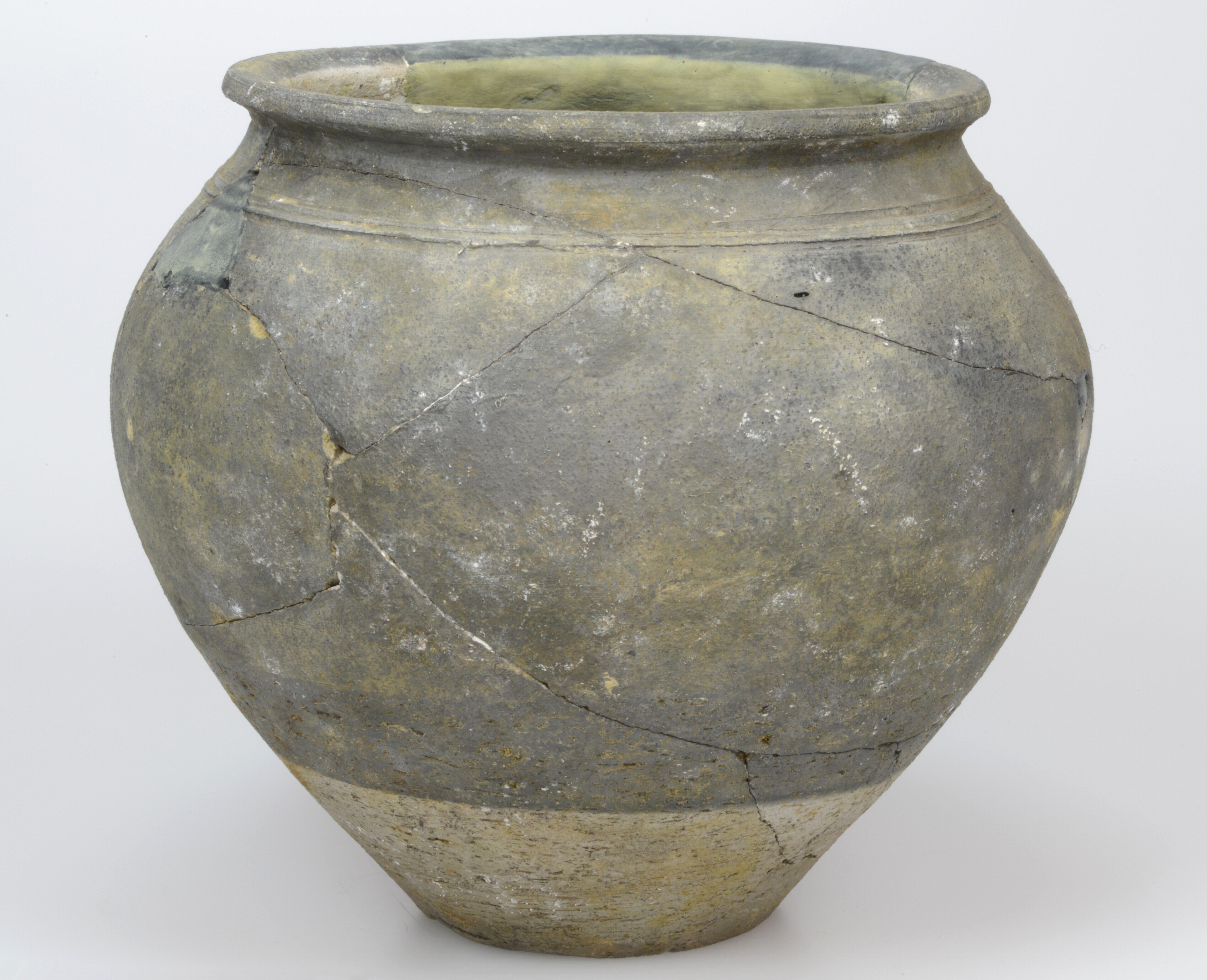 Kookpot; type Stuart 201/Brunsting 1; ruwwandig aardewerk; bolvormige pot met omgeslagen rand en drie horizontale groeven op de schouder onder de hals; standvlak; fijne zand magering; donkergrijs baksel