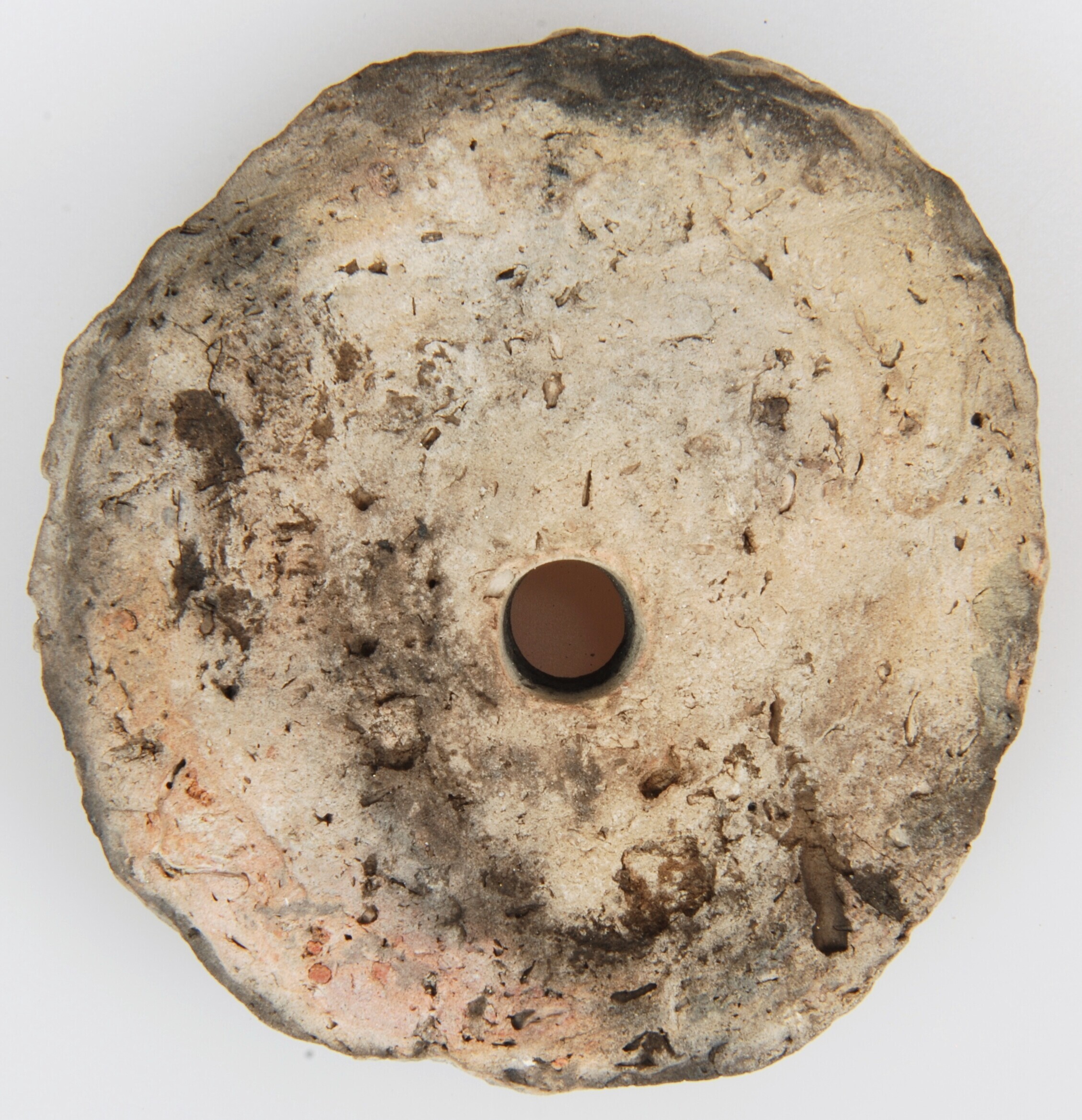 Spinklos; handgevormd aardewerk; vervaardigd uit bodemscherf pot met centrale doorboring; vondstdatum: 11-10-2000