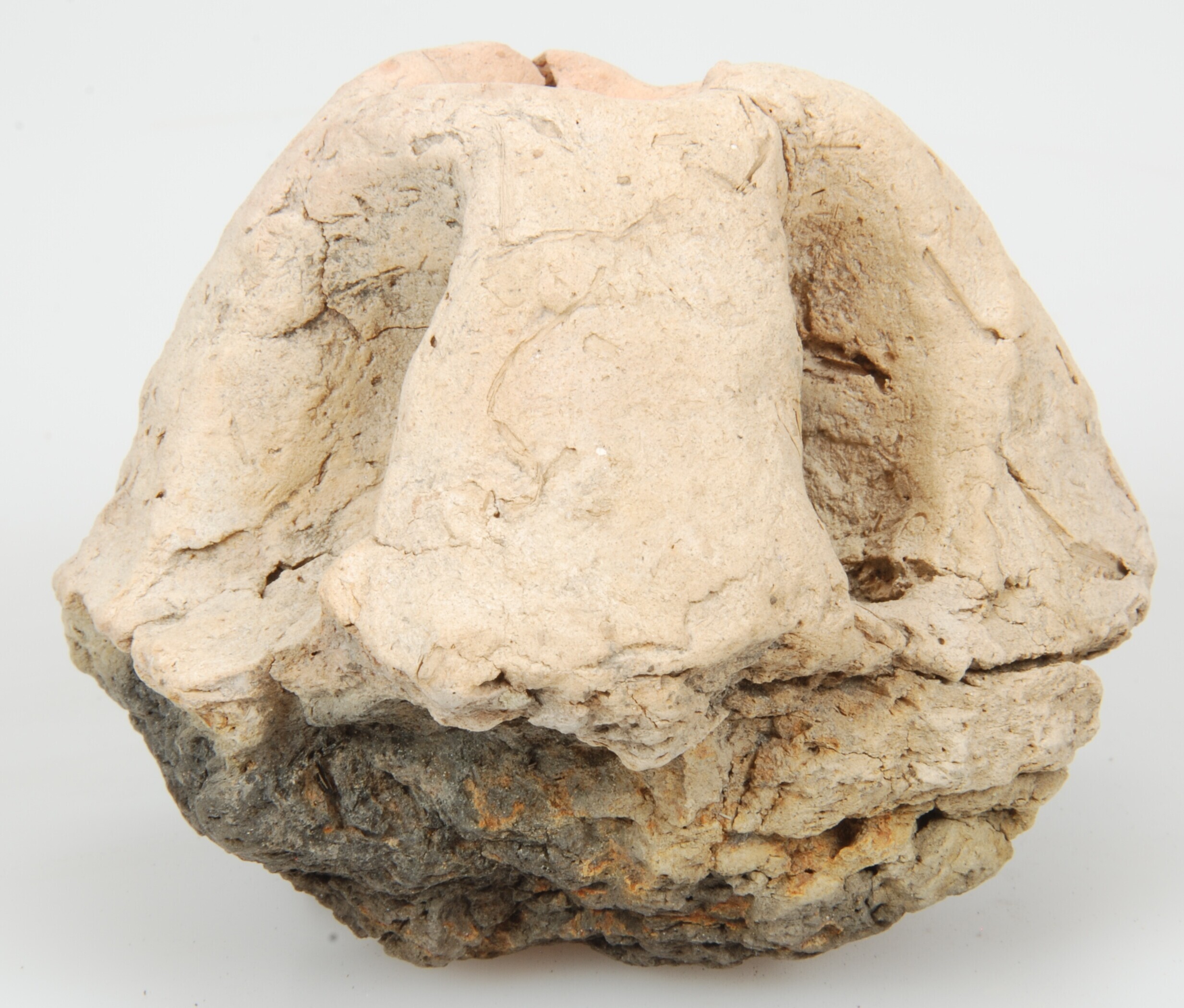 Knop vuurbok; handgevormd aardewerk; stolpvormig met vier uitgespaarde handgrepen; vondstdatum: 6-9-2000