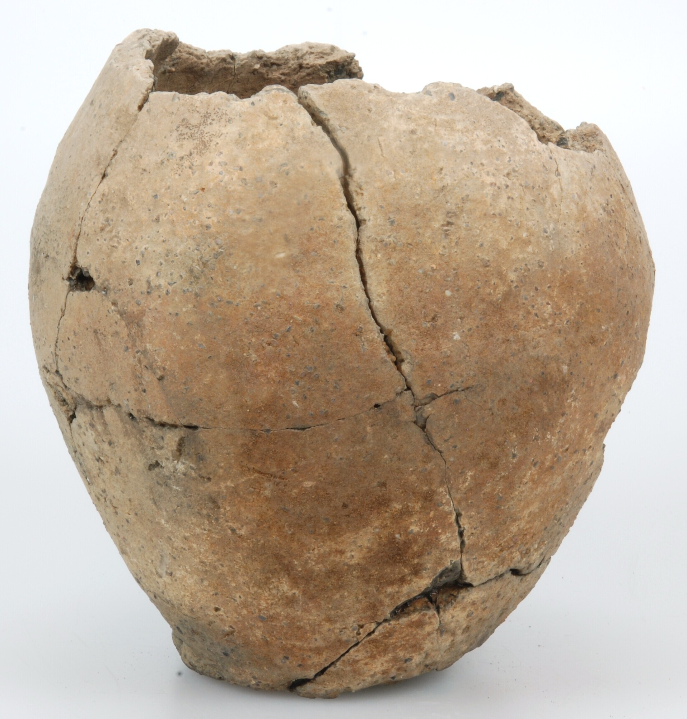 Pot; Ruinen-Wommels type I; driedelige pot met ronde, biconische buik-schouder overgang, rand ontbreekt; standvlak; steengruis magering