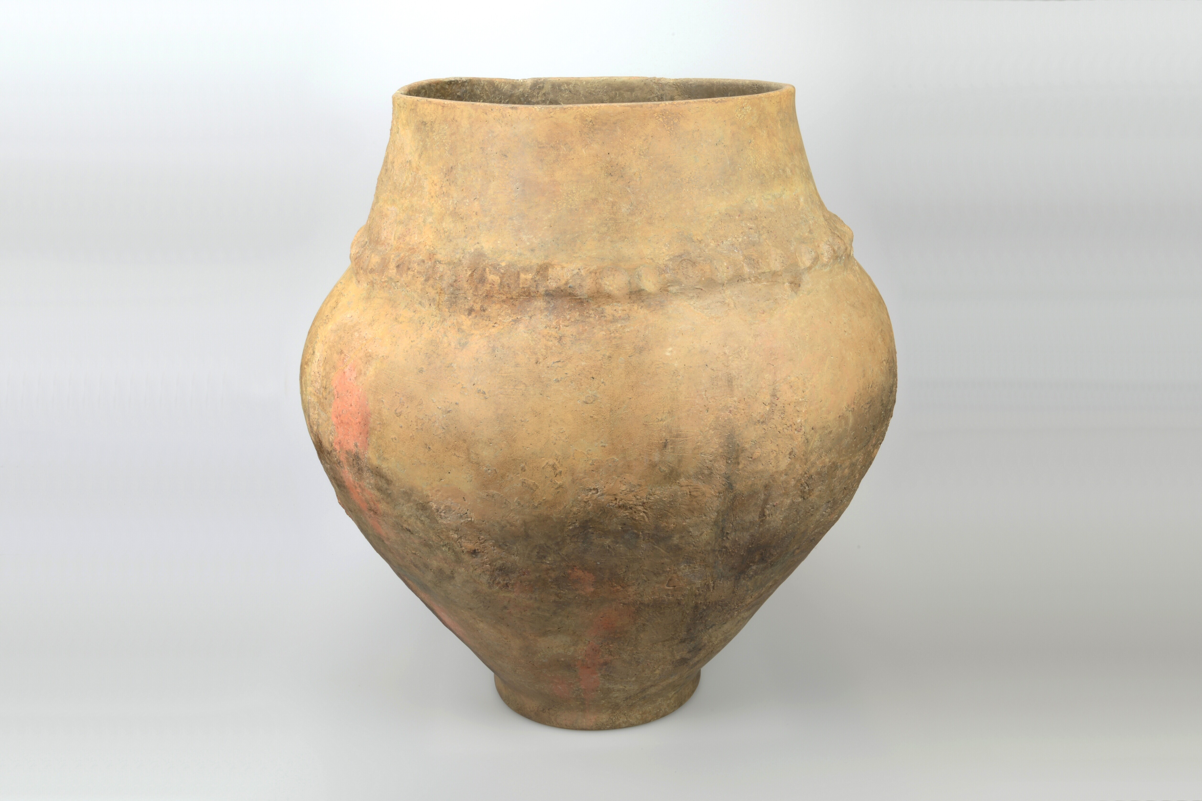 Pot; zeer groot formaat biconische voorraadpot met bolle buik en onregelmatige, niet recht gevormde rand en op standvoet; op de overgang van de wand-schouder is een plastische bandversiering aangebracht die voorzien is van duimindrukken met een tussenruimte van 1.0-1.5 centimeter; de bandversiering heeft een hoogte van gemiddeld 3 centimeter; fijne steengruis magering