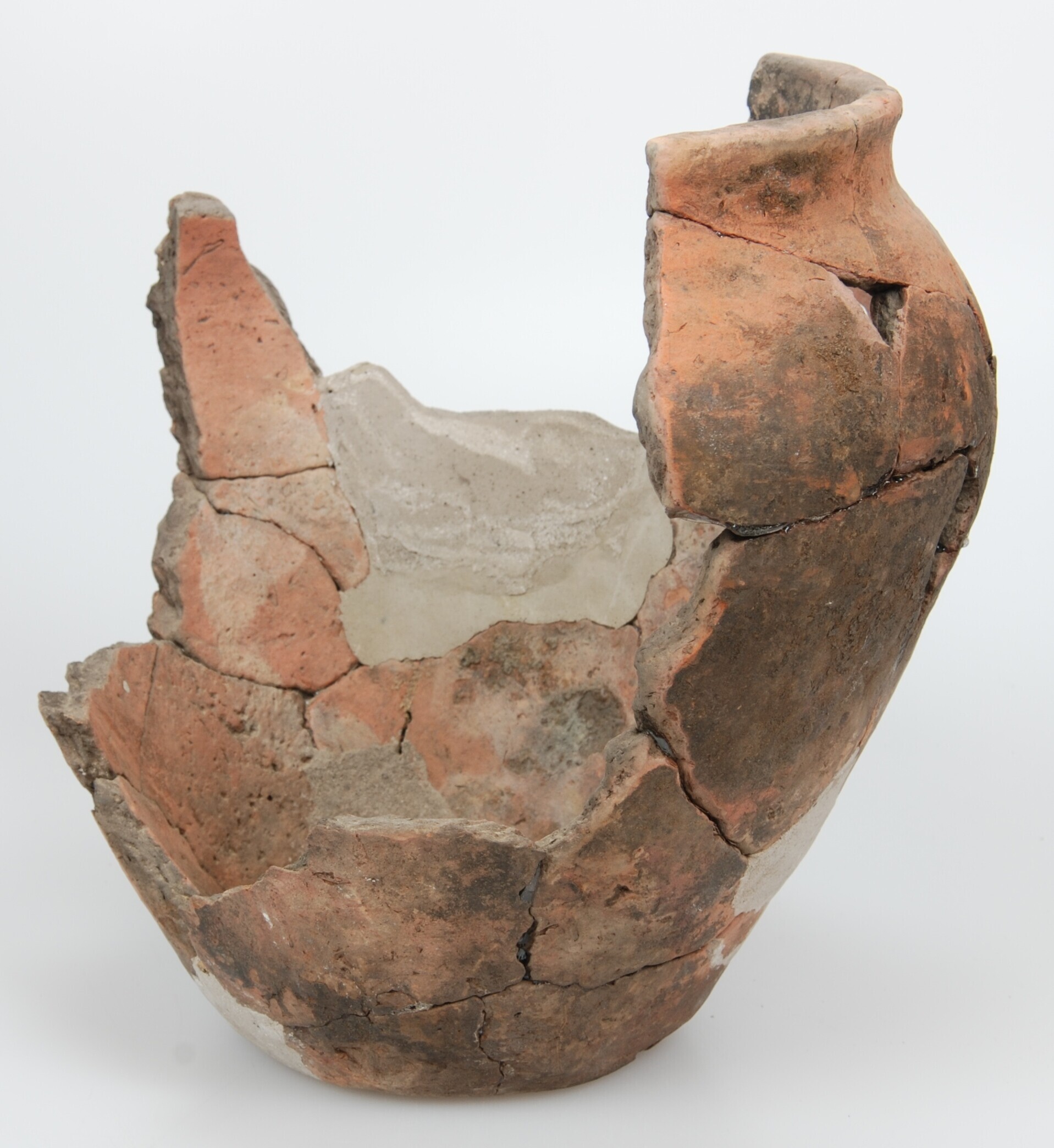 Pot; bolvormig met hoge schouder; verbrede, iets naar buiten staande rand; standvlak