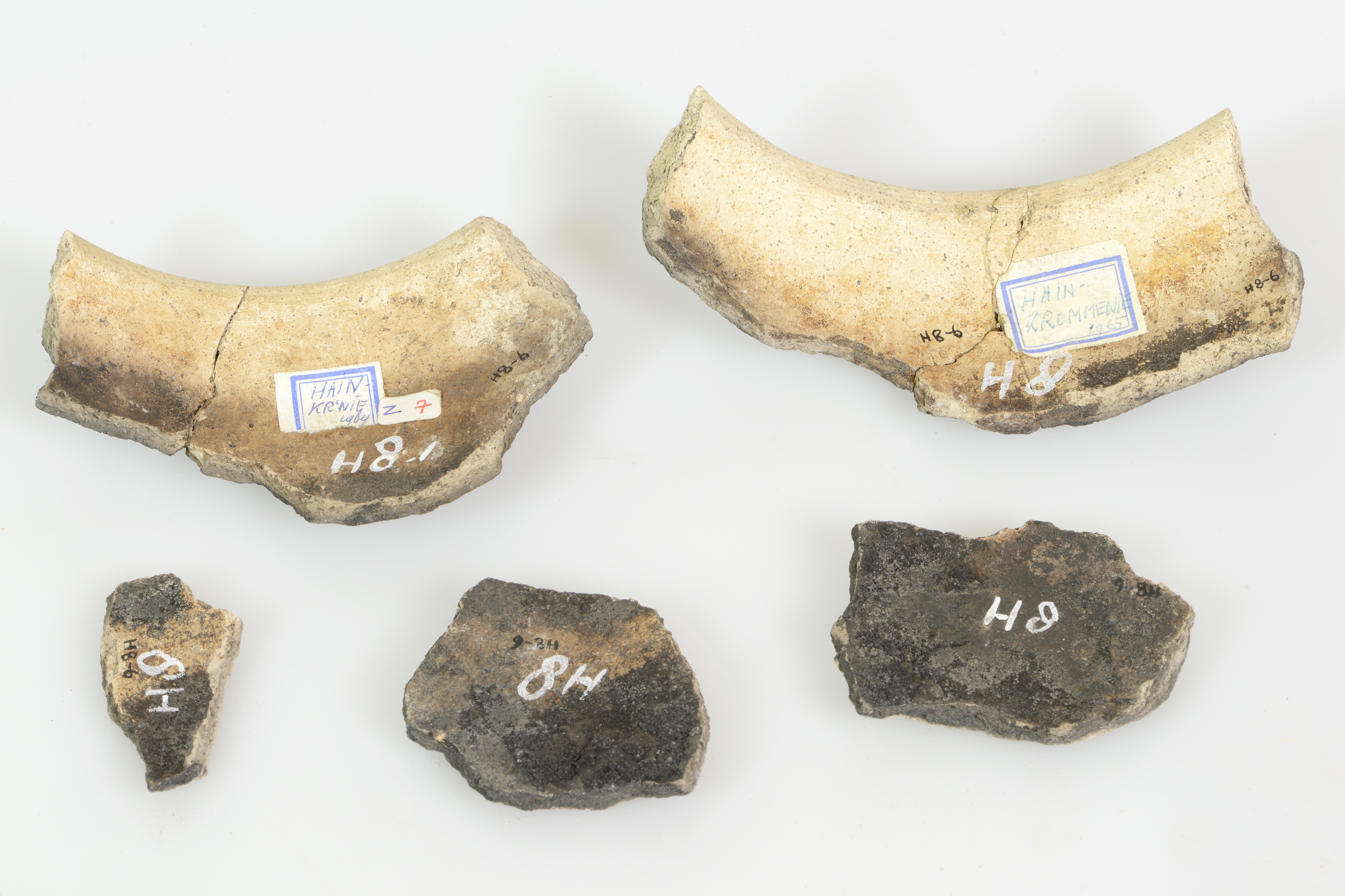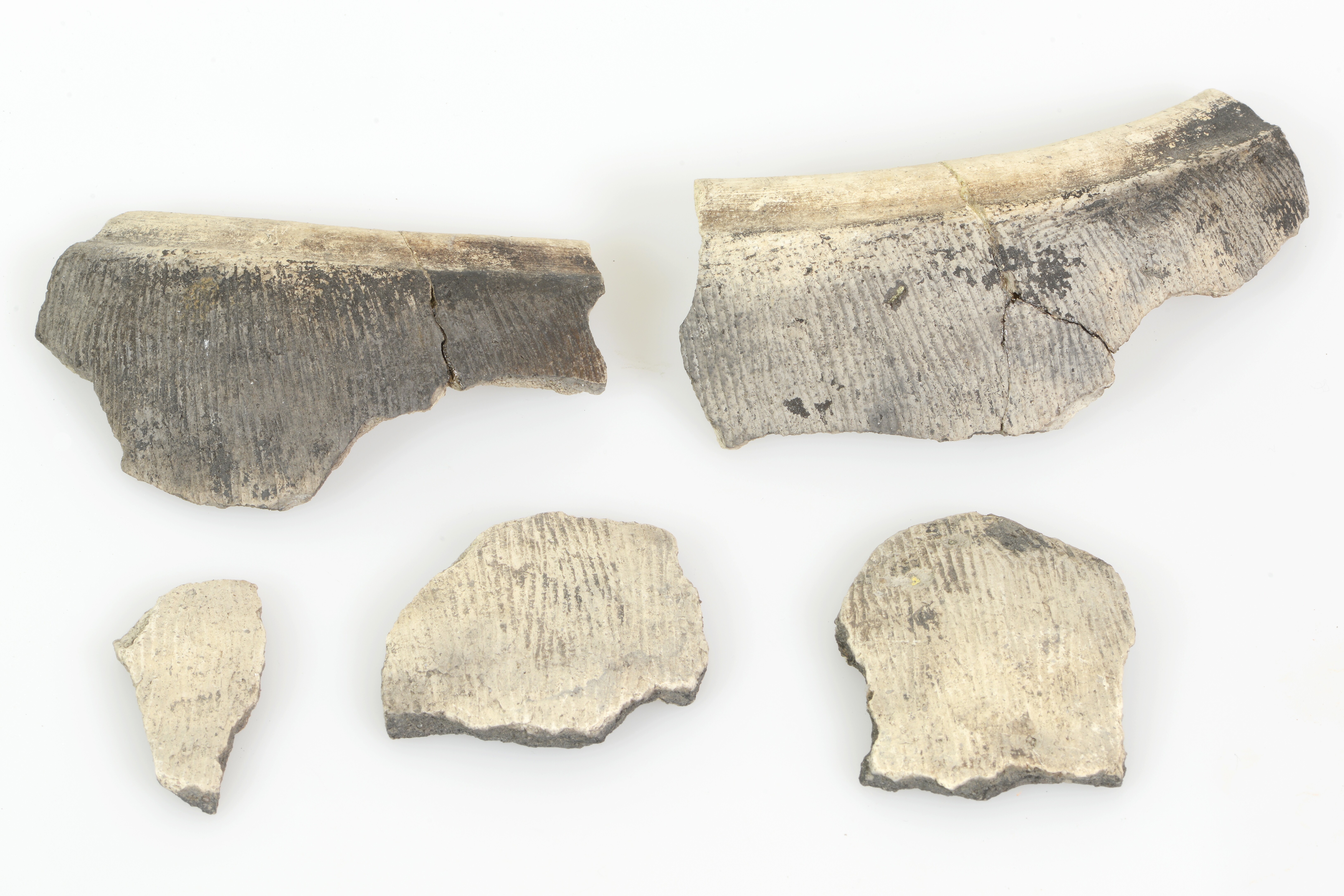 Kurkurn; fragmenten; type HBW 94; lichtgrijs ruwwandig handgevormd (kurkurnachtig) aardewerk met gedraaide rand; verdikte, naar binnen gebogen rand; kamstreekversiering op de wand; zwarte aanslag aan de buitenzijde; kookresten aan de binnenzijde; vondstjaar: 1965