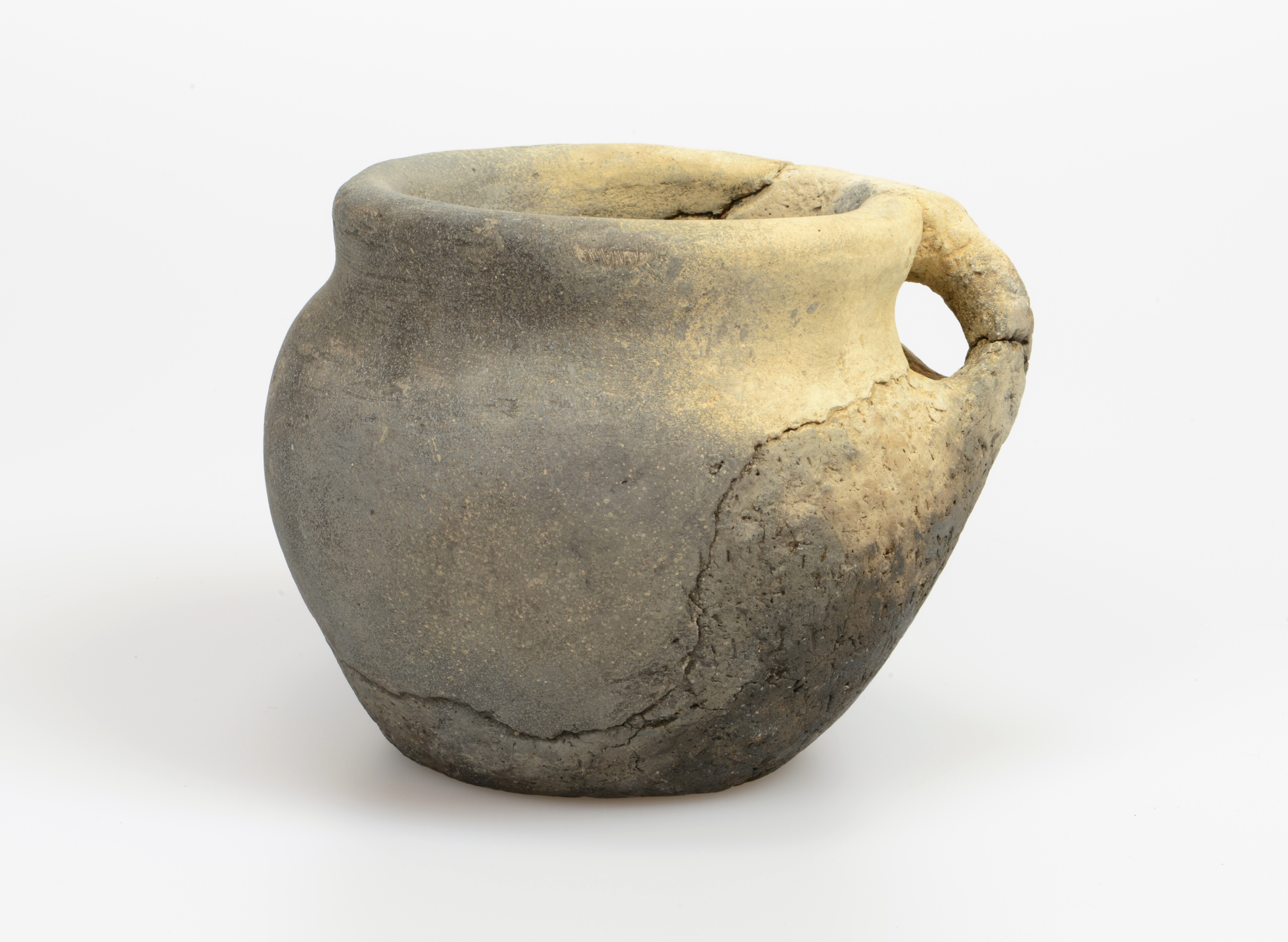 Pot; inheems-Romeins aardewerk; handgevormd; standvlak; besmeten; één verticaal oor; beroet