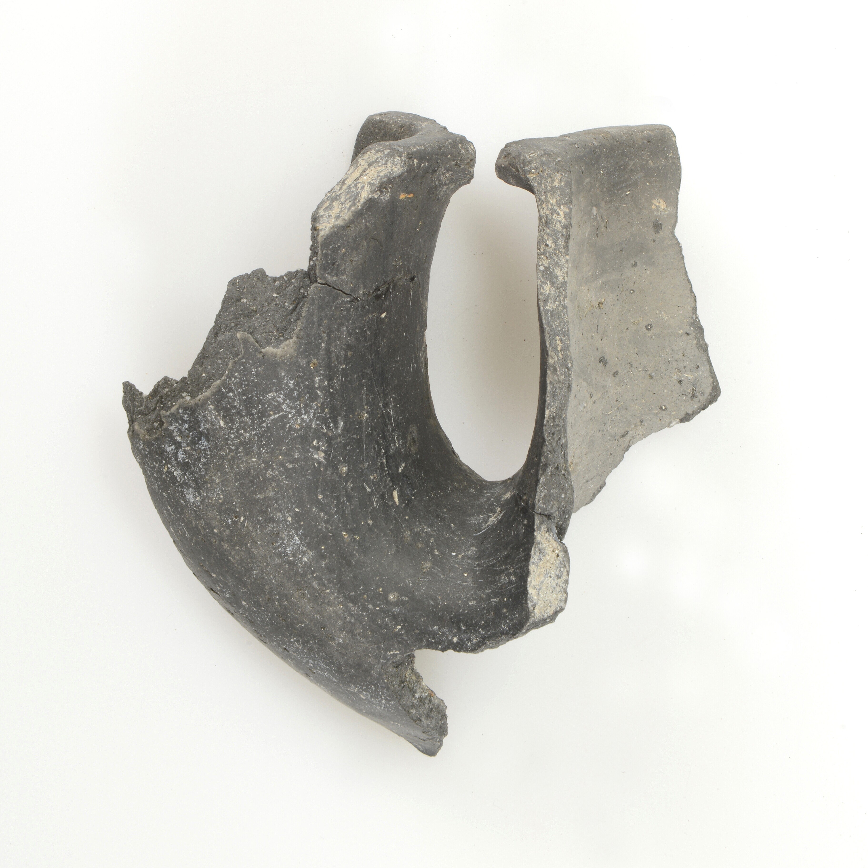 Drinkhoorn?; grijs baksel met fijn zand- en schelpmagering; handgevormd; rondlopend reservoir met twee mondopeningen aan bovenzijde; herkomst midden- Duitsland?