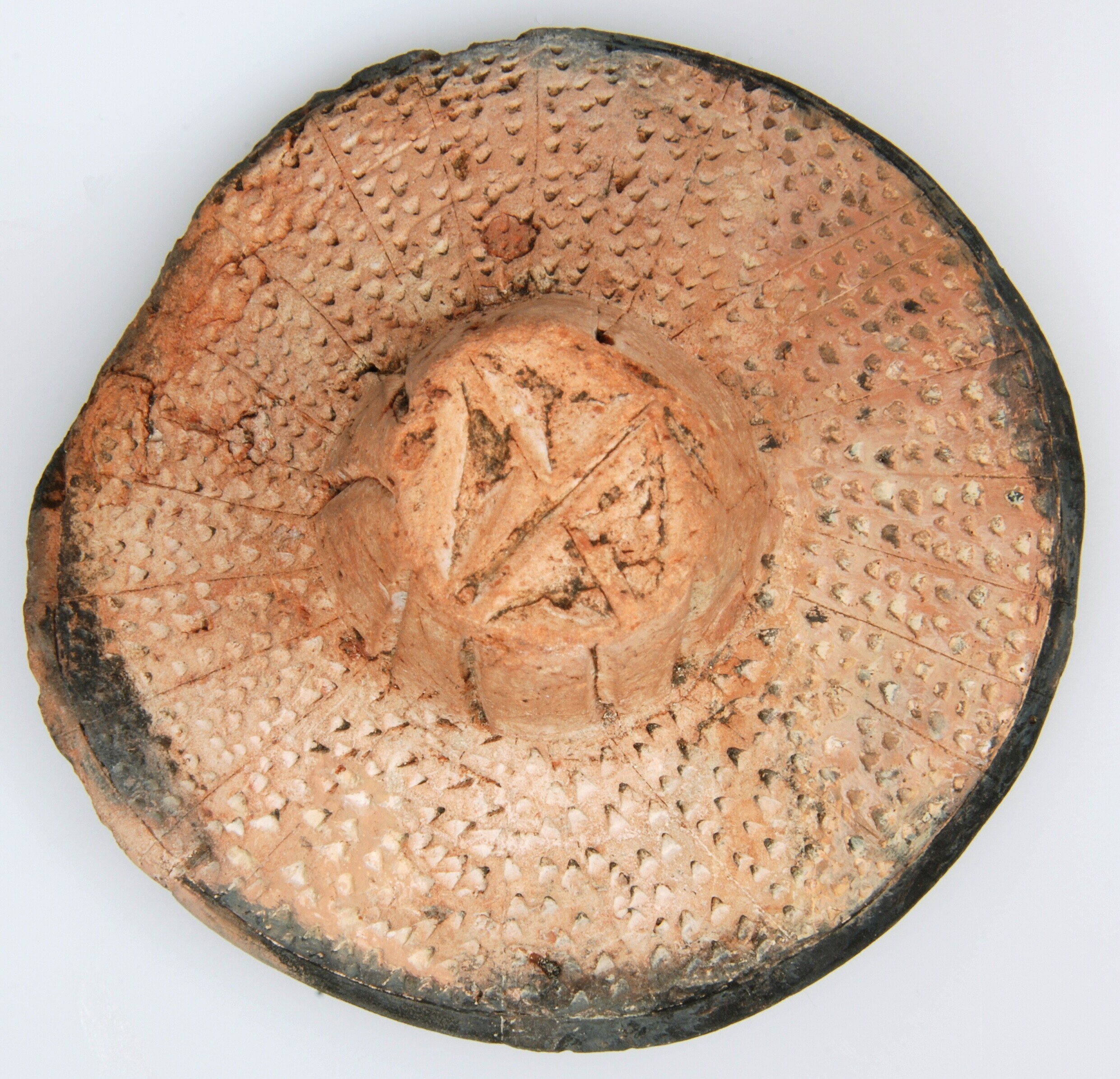 Dover; roodbakkend aardewerk; ongeglazuurd; de ronde knop is ongelijk versierd. Aan de bovenzijde is een diagonaal kruis afgebeeld, evenals op de zijkanten, door inkerving van de naastgelegen driehoeken. De versiering van de bovenzijde van de dover is vrij onregelmatig aangebracht: deels bestaat deze uit straalsgewijze dubbele putjes rijen, gescheiden door een ingekerfde lijn. De rand ...