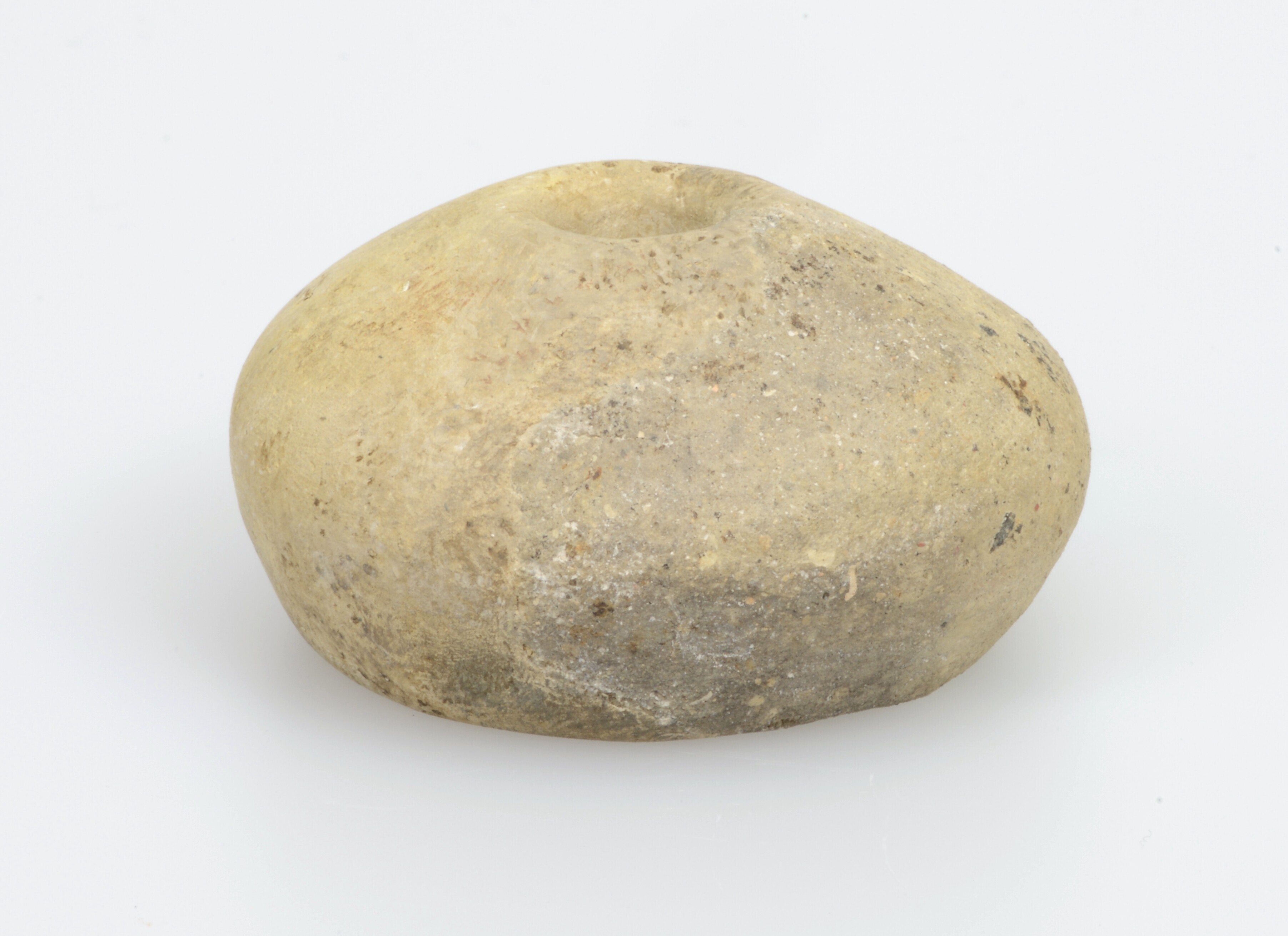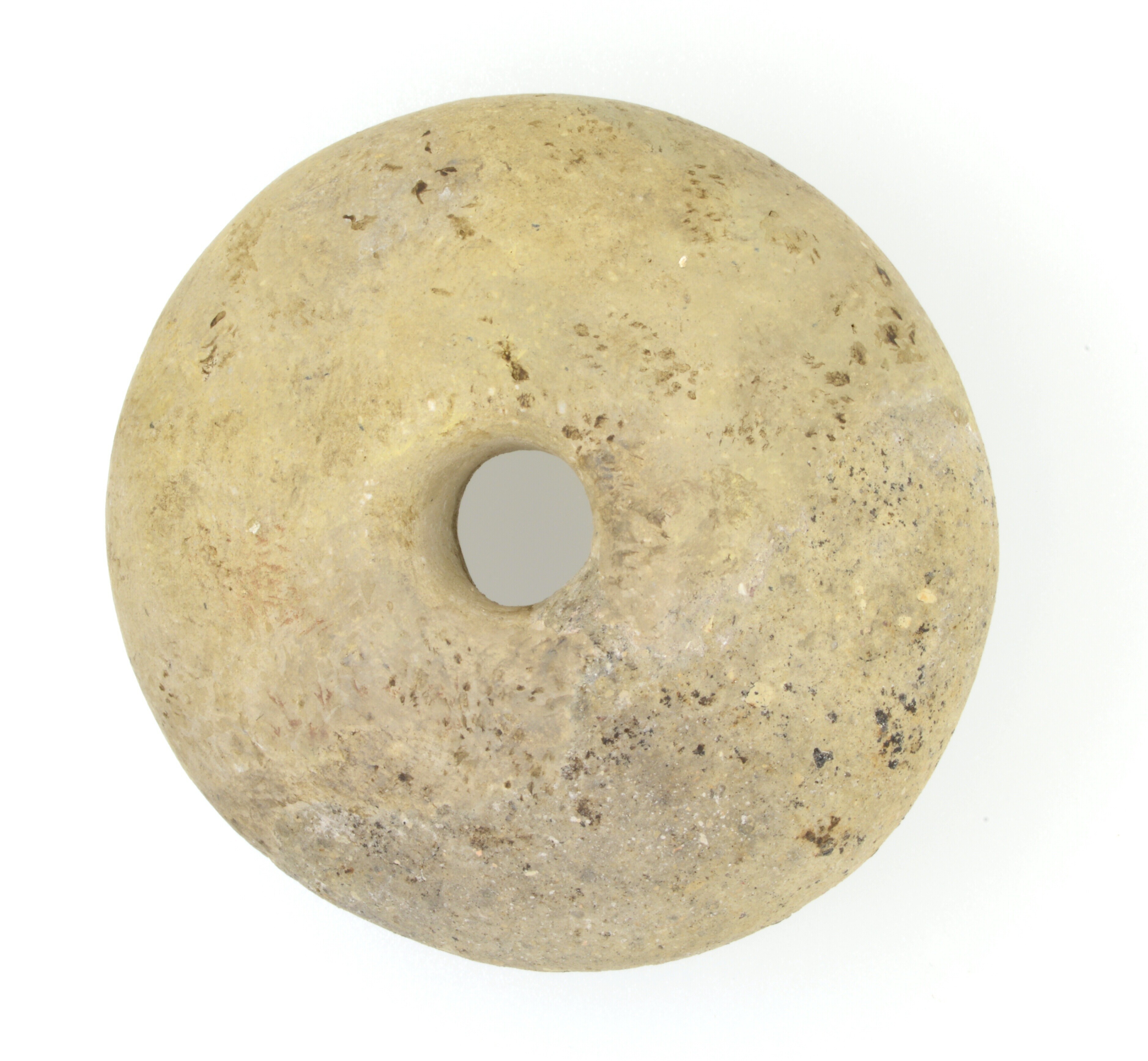 Spinsteen; concave en convexe zijde; centrale doorboring (diameter: 10 mm); steengruismagering; lichtbruin baksel; vondstgegevens: 7:3148, vondstjaar: 1976