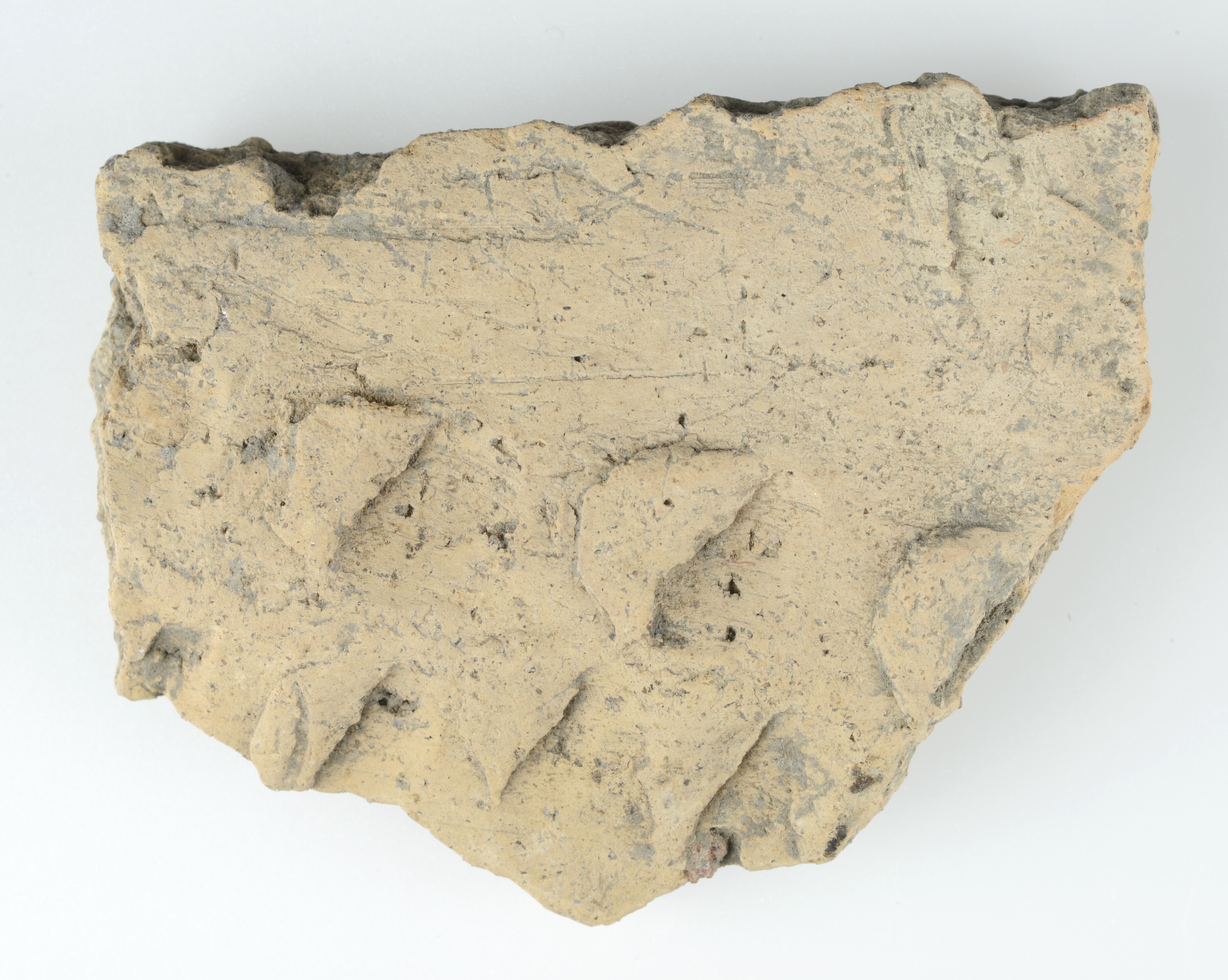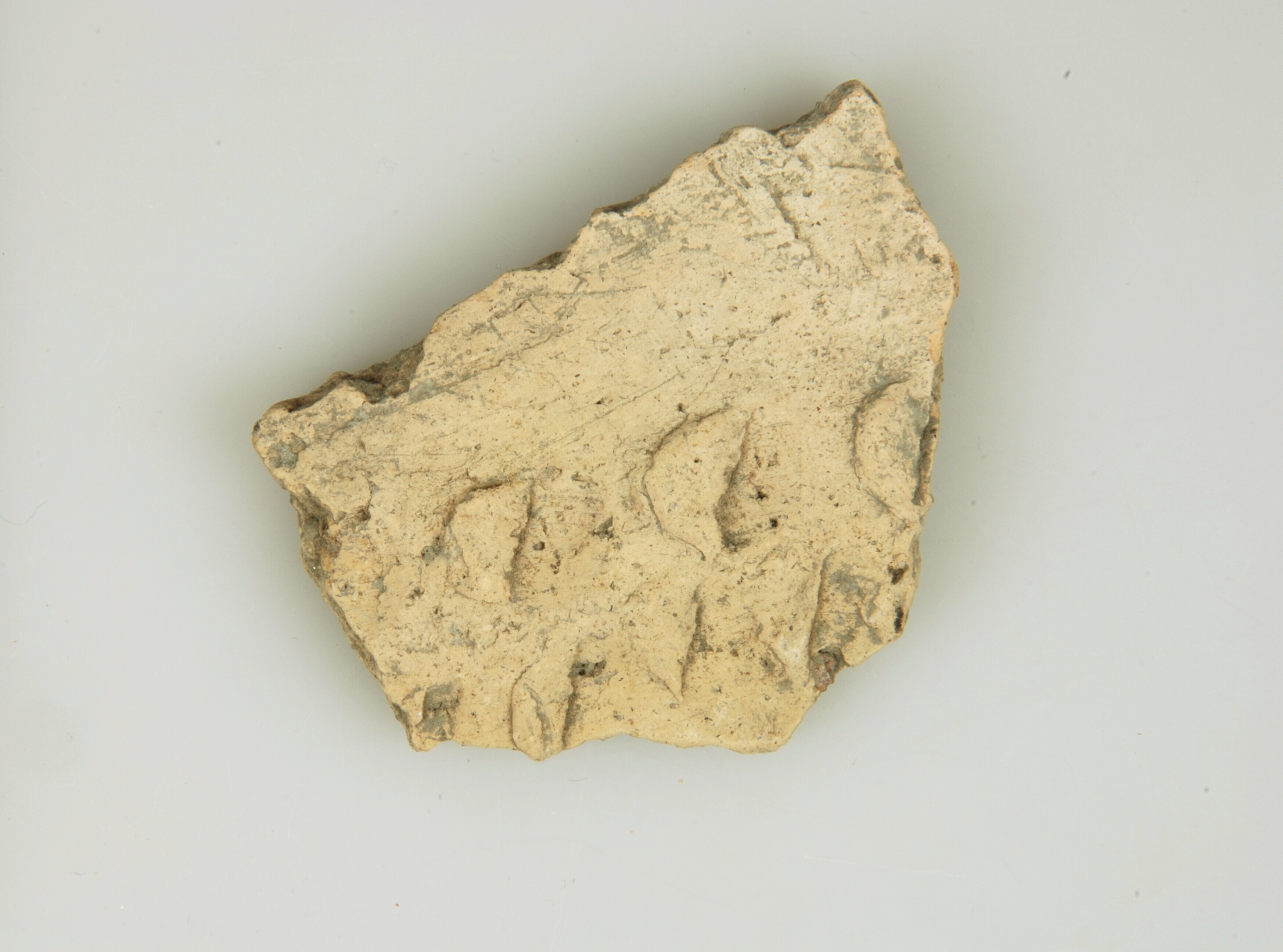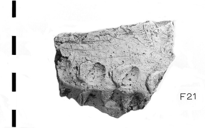 Pot; Hoogkarspel-Jong aardewerk; baksel DD (gladgestreken); wandfragment; versierd met twee rijen nagel- en vingertopindrukken; fijne steengruis magering
