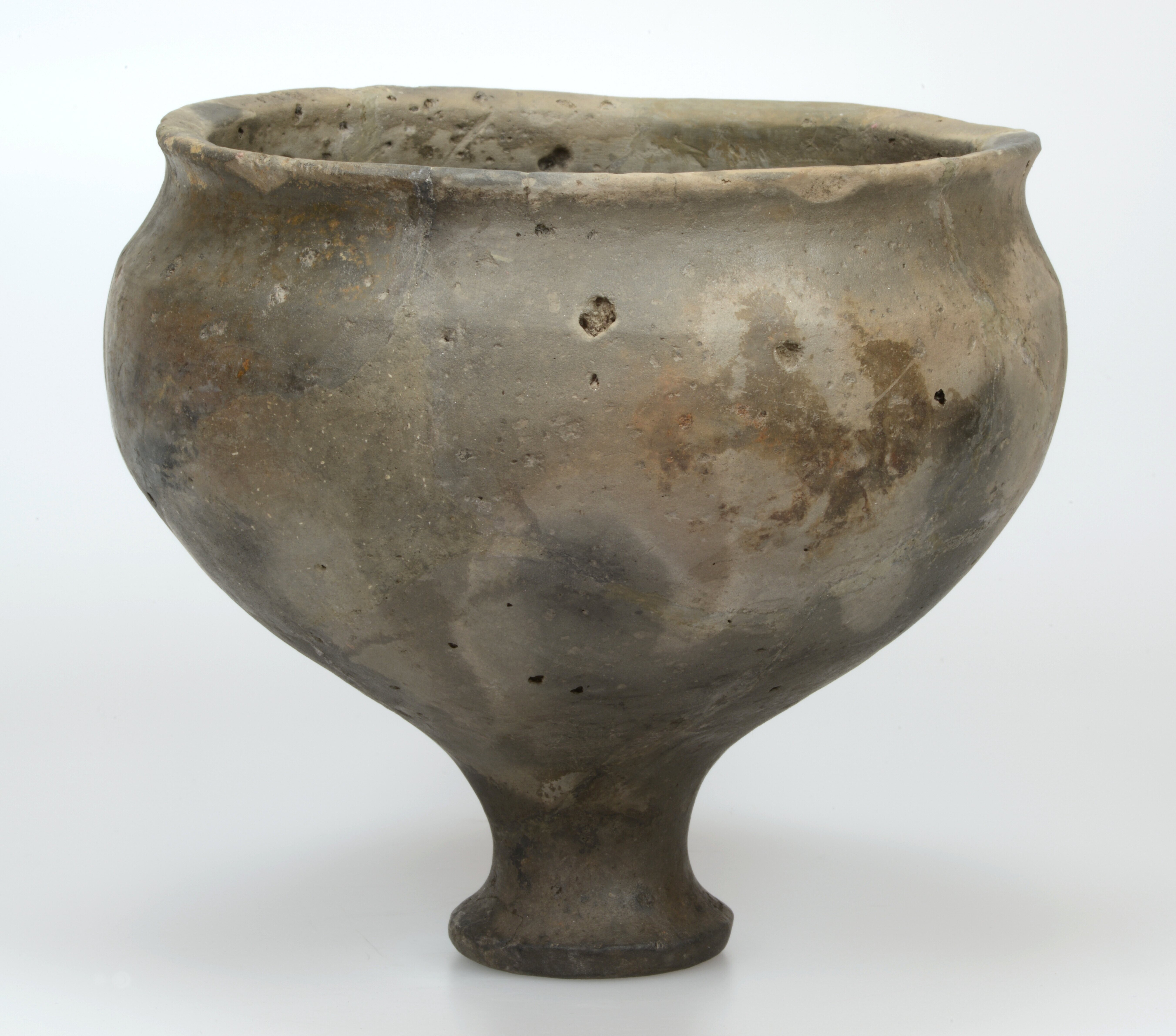 Situla; type Diederik F-V; inheems-romeins aardewerk; wijdmondige bolle pot op een hoge holle standvoet met gefacetteerde A-rand; organische magering