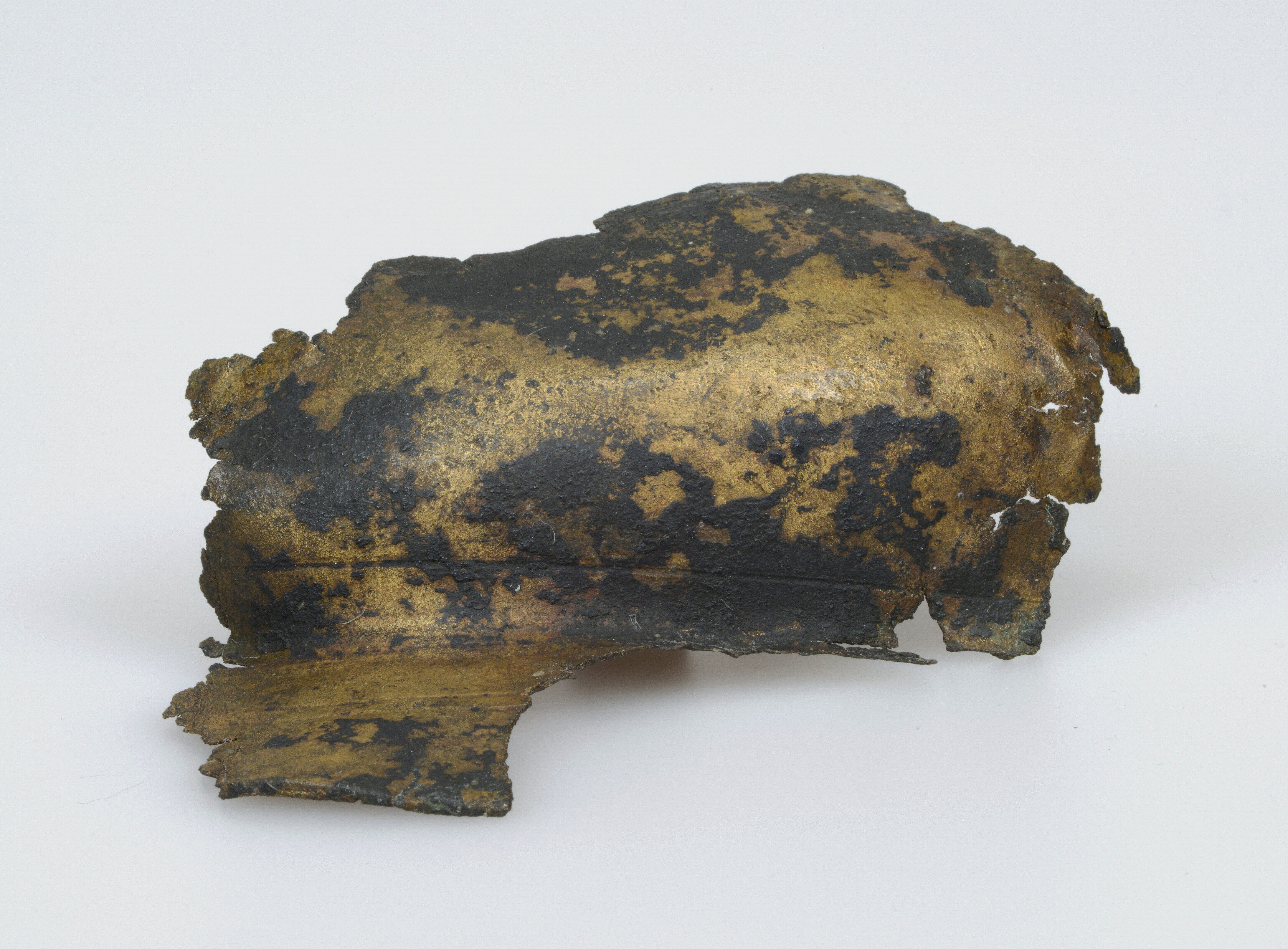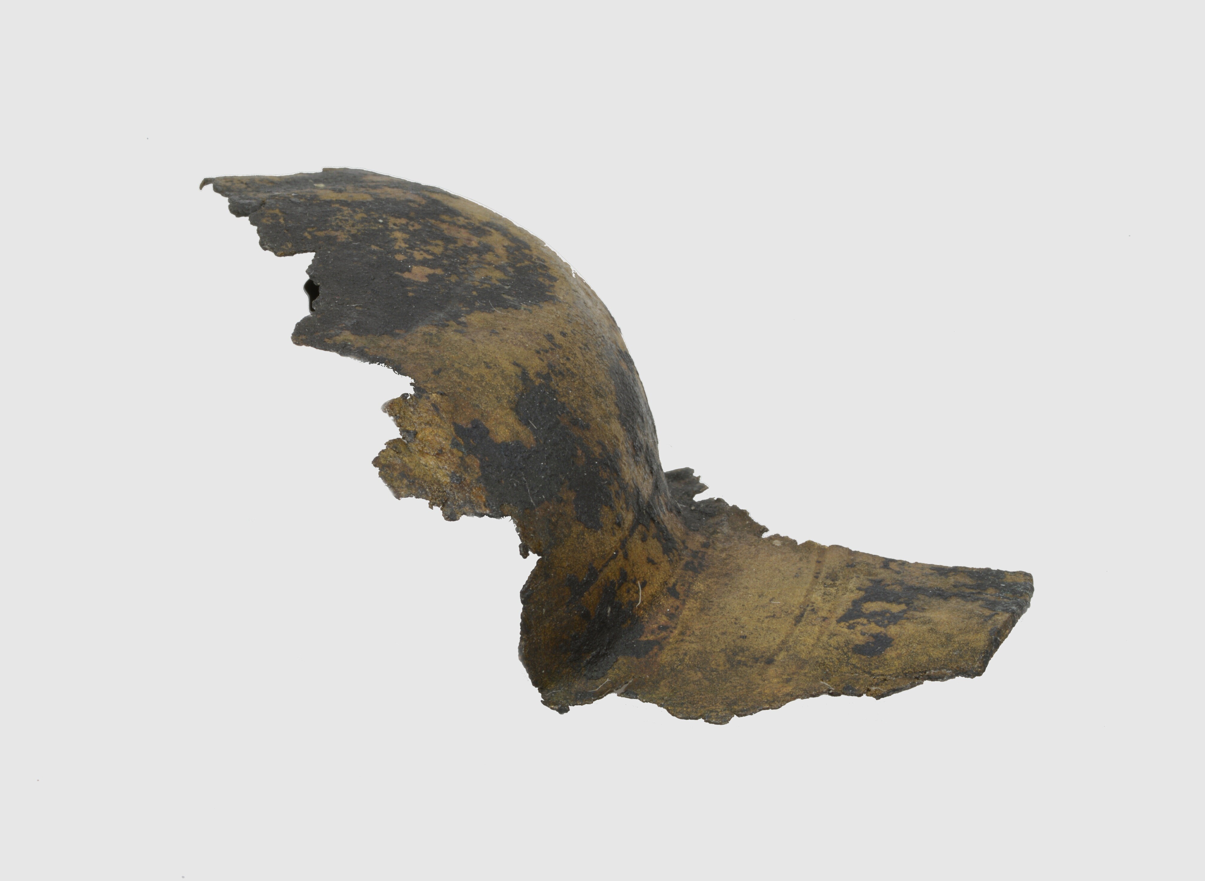 Schildknop/umbo; fragment; op de bol en op de vlakke rand aan de buitenzijde zijn concentrische groeven aangebracht
