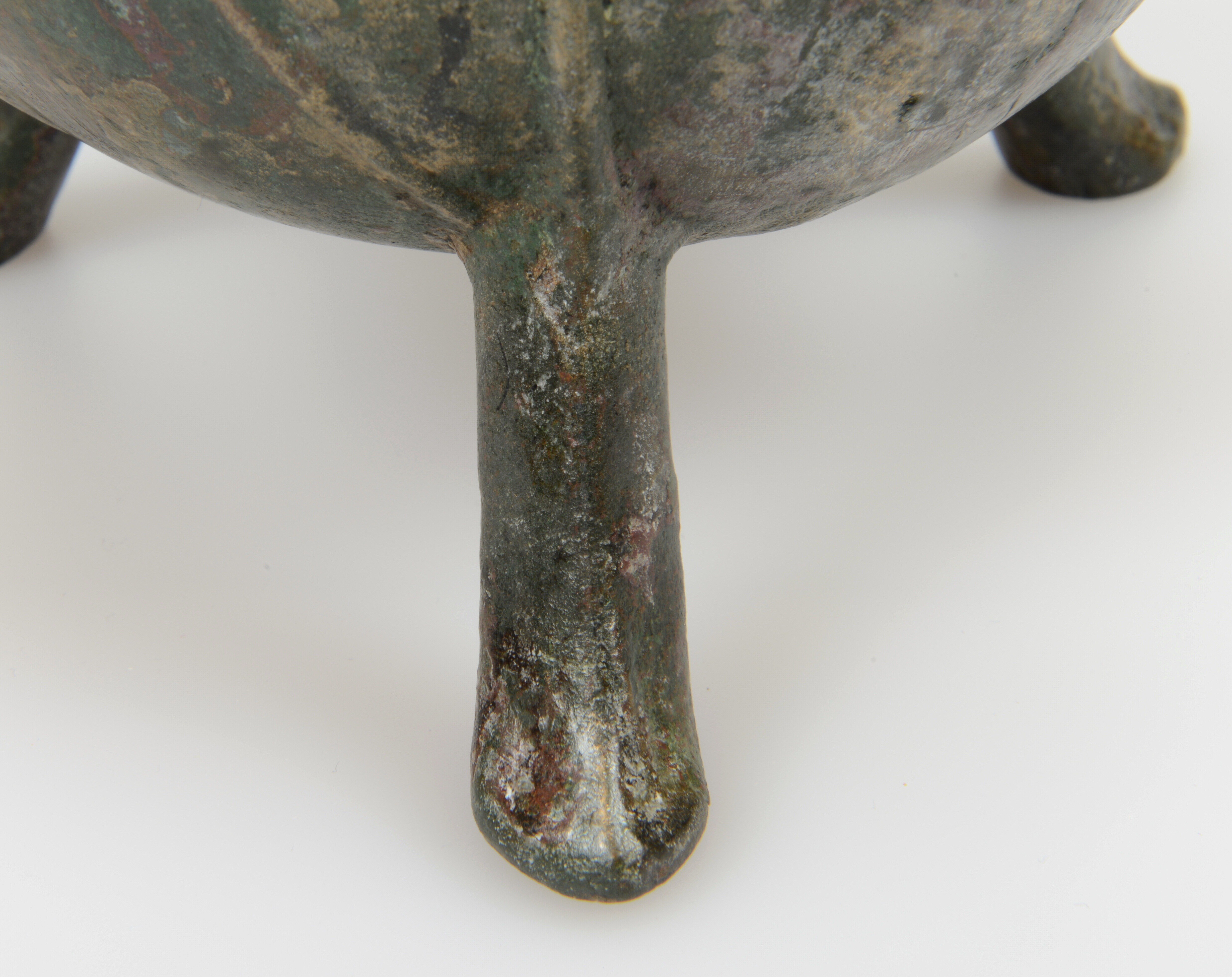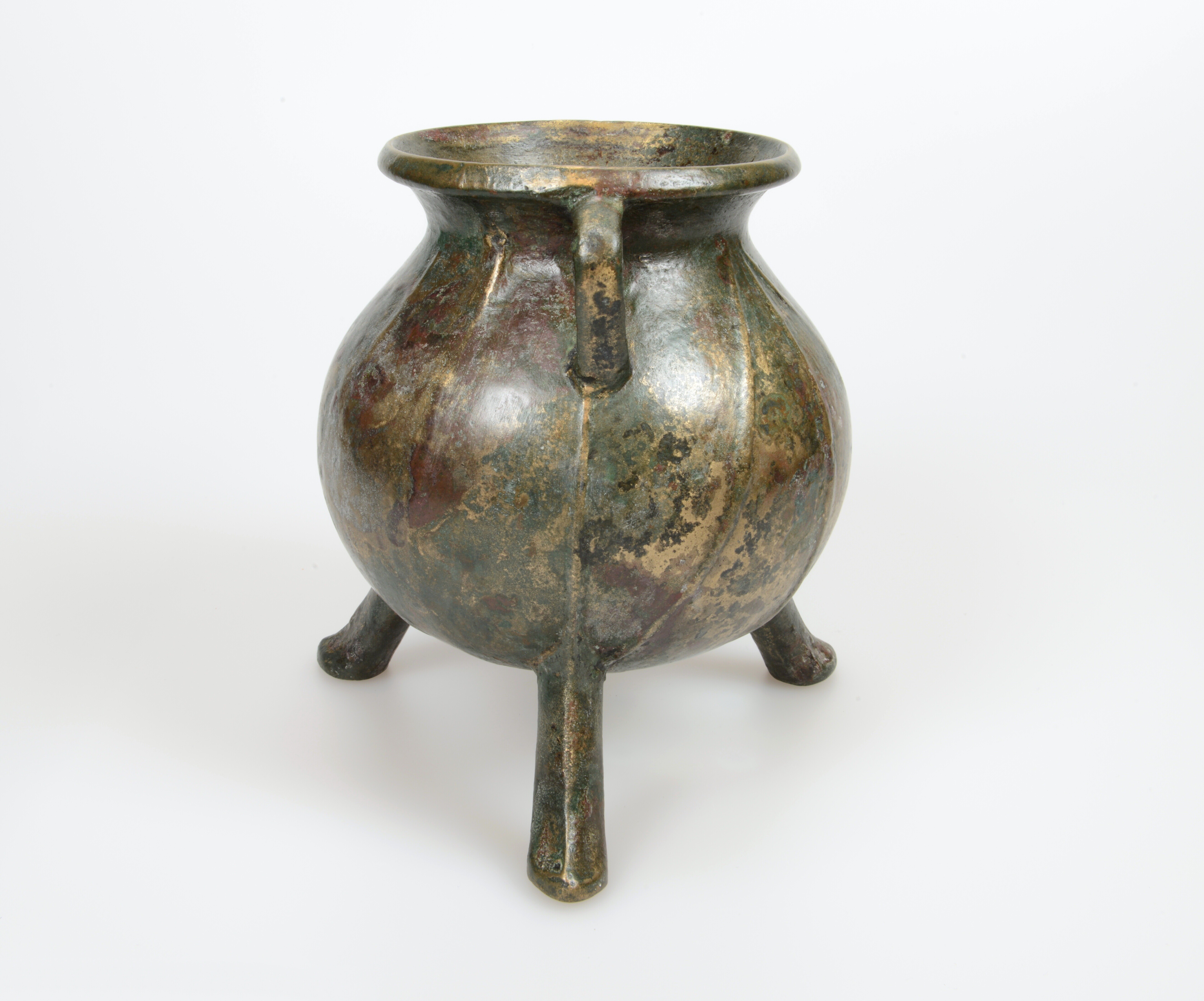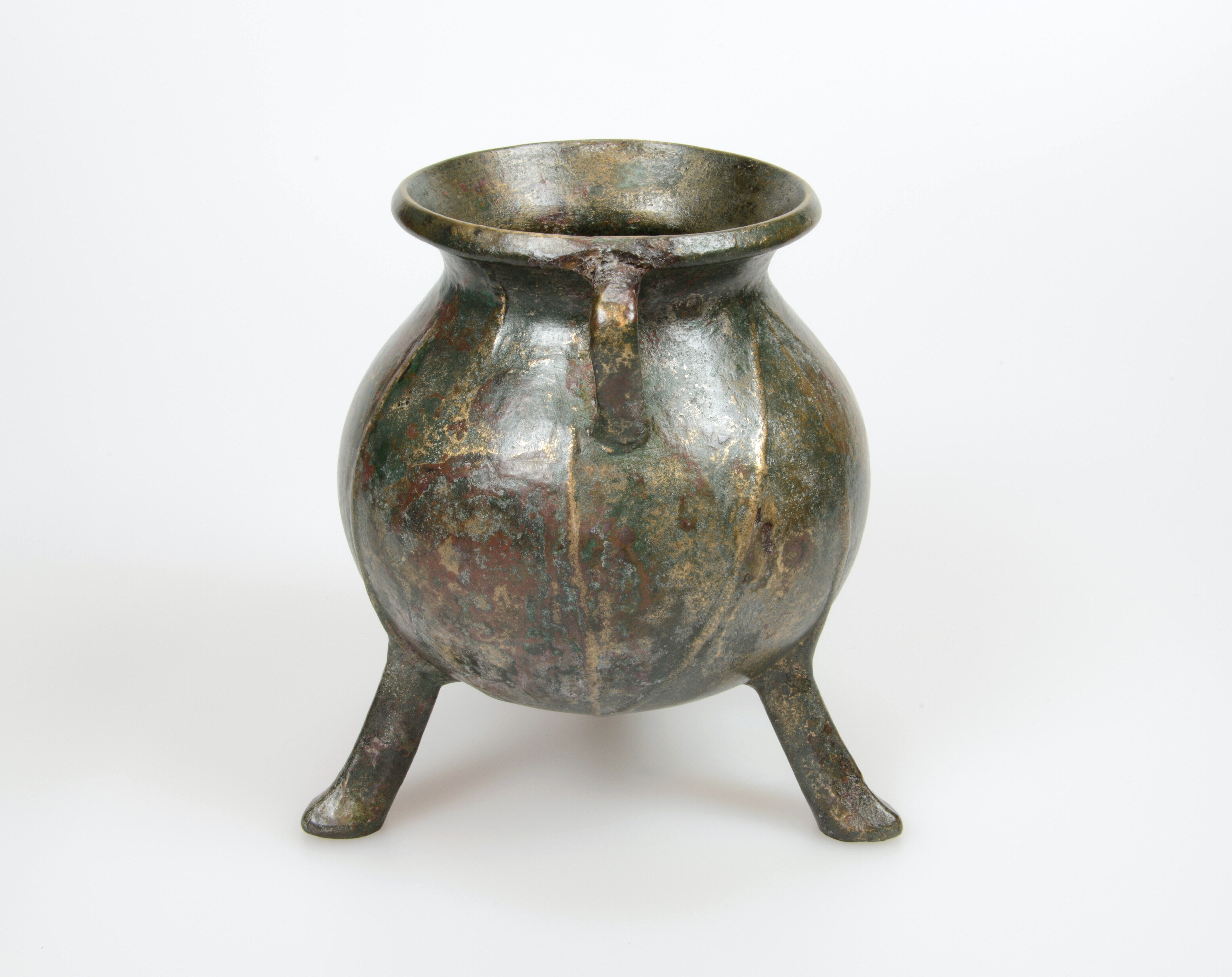 Grape; kogelvormige romp met vloeiende overgang van romp naar hals en afgeronde verdikte rand, drie poten met uitstekende voeten, twee afgeronde haakoren vlak onder de rand; decoratie: verticale en diagonale lijnen in reliëf op de buik