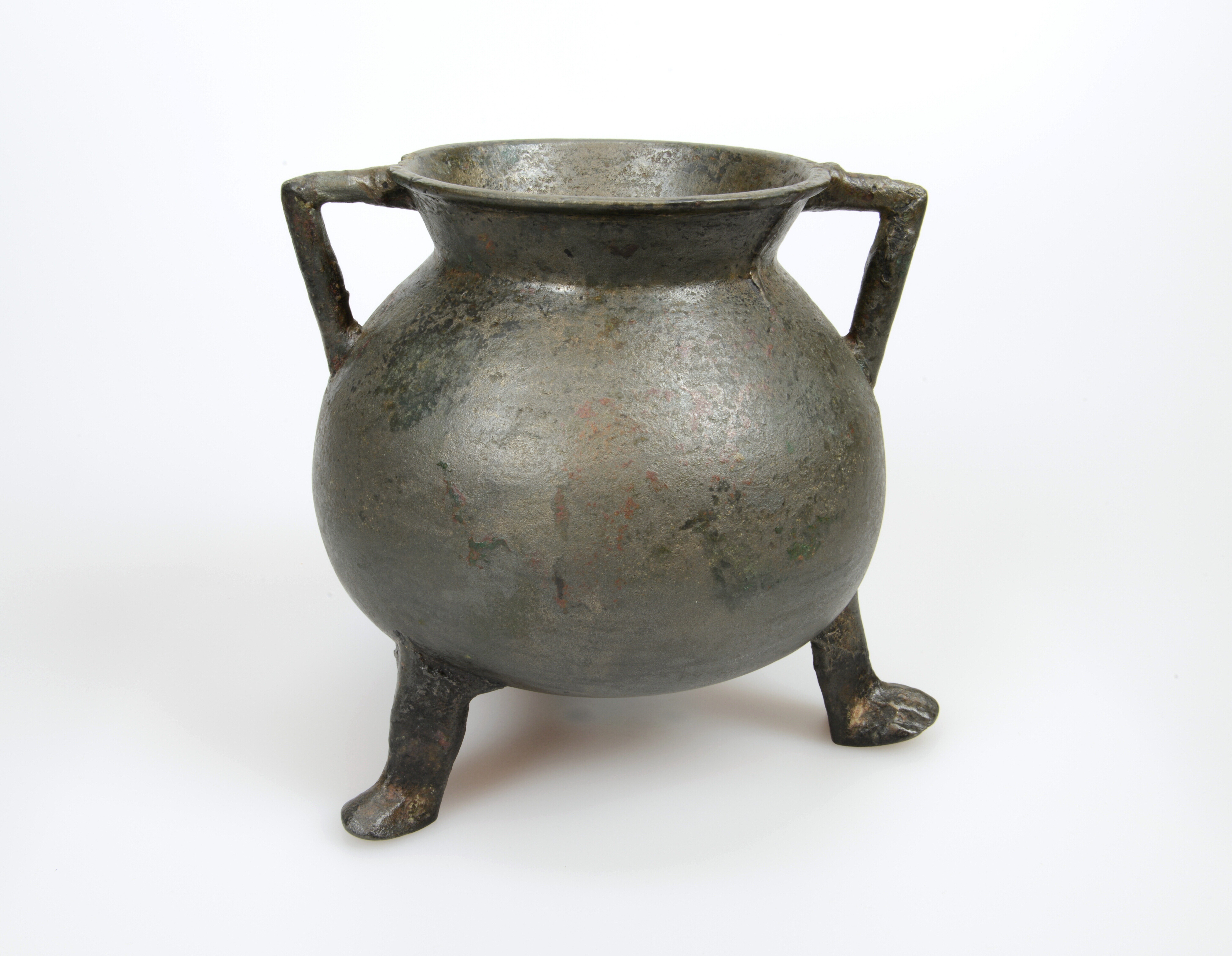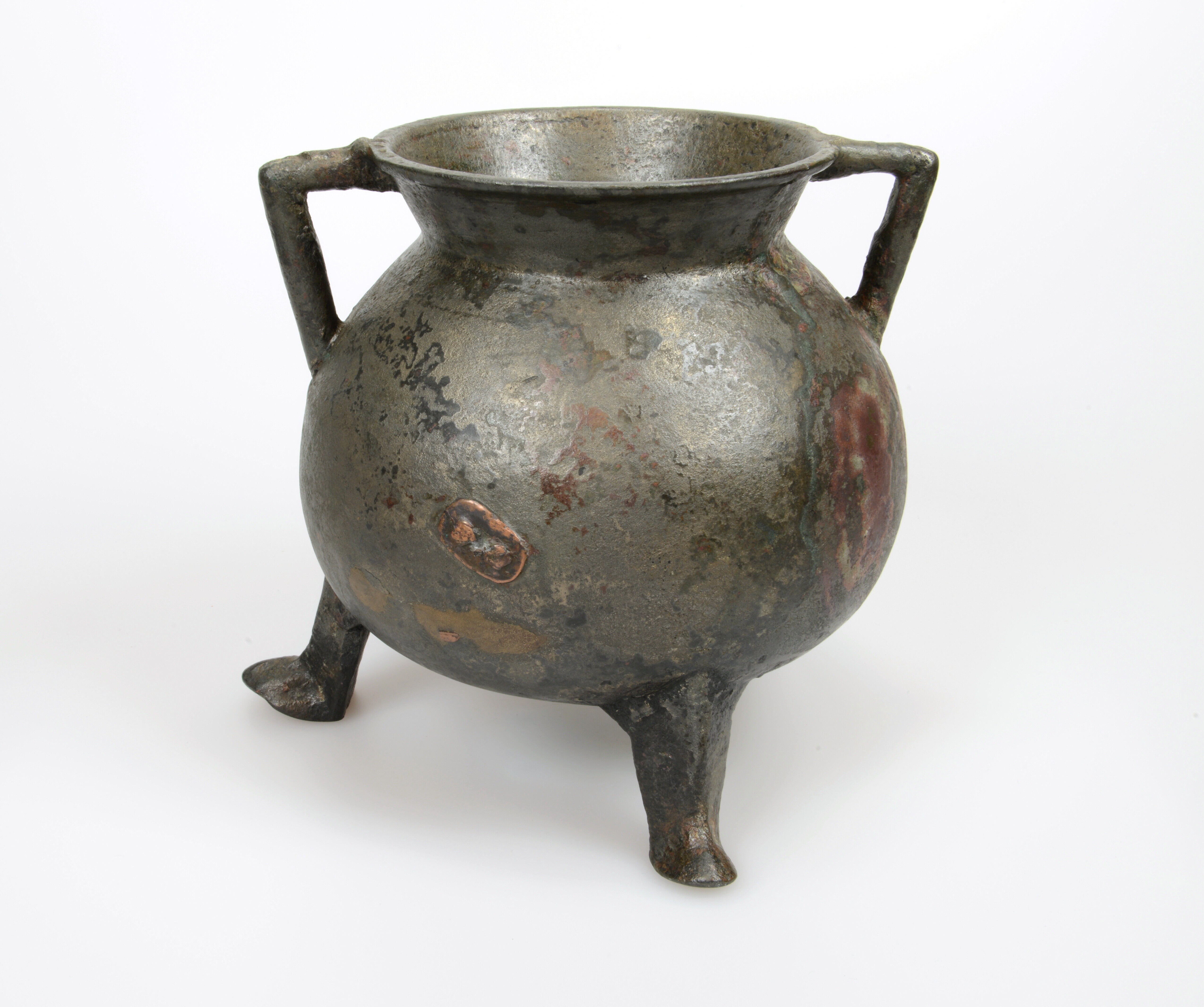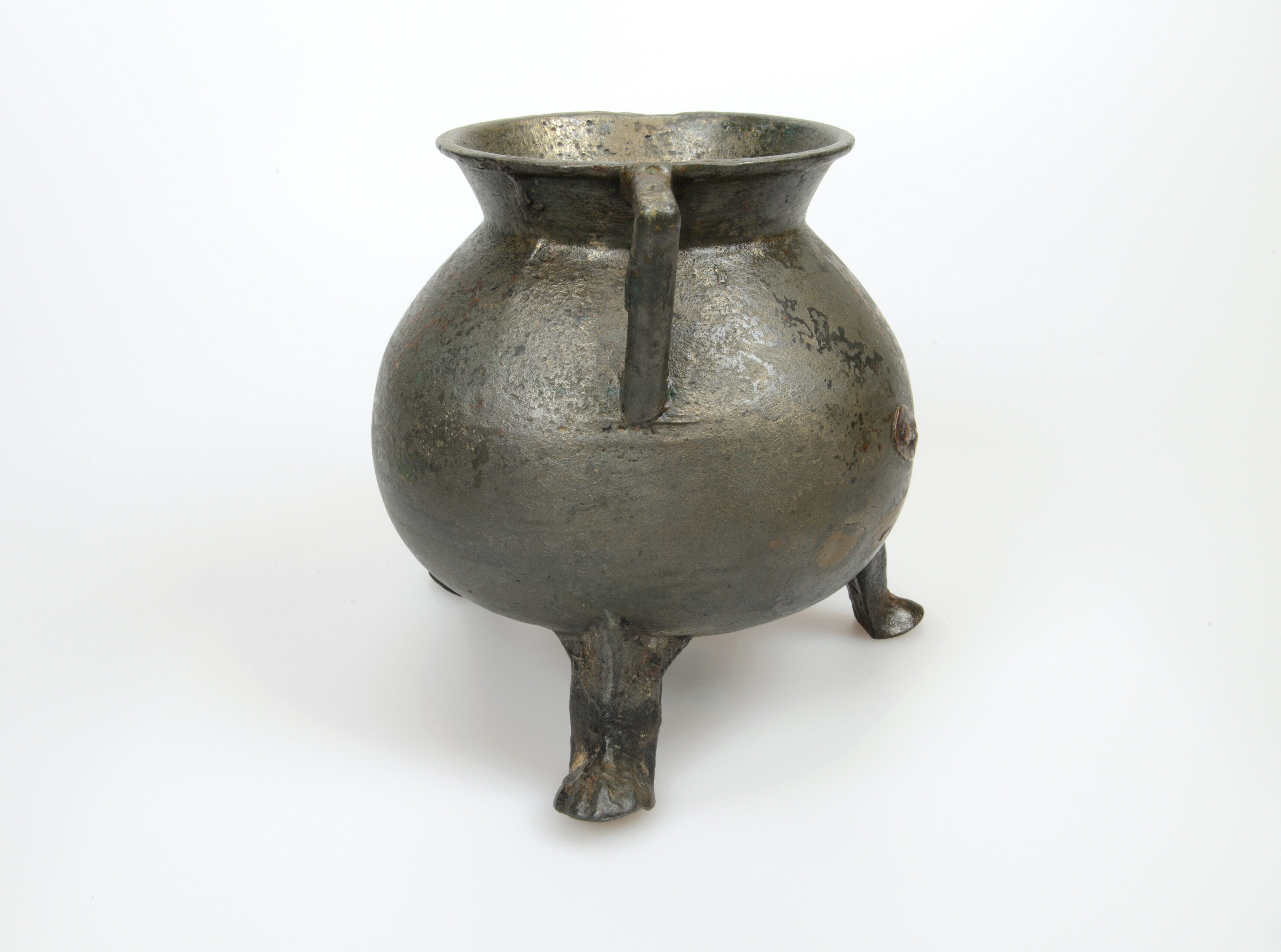 Grape; kogelvormige romp waarbij de overgang van romp naar hals vloeiend verloopt en de liprand rond is. Twee haakoren en de grape staat op drie klauwpoten. De buik bevat een oude reparatie van een klinkplaatje dat bevestigd zit met twee klinknagels
