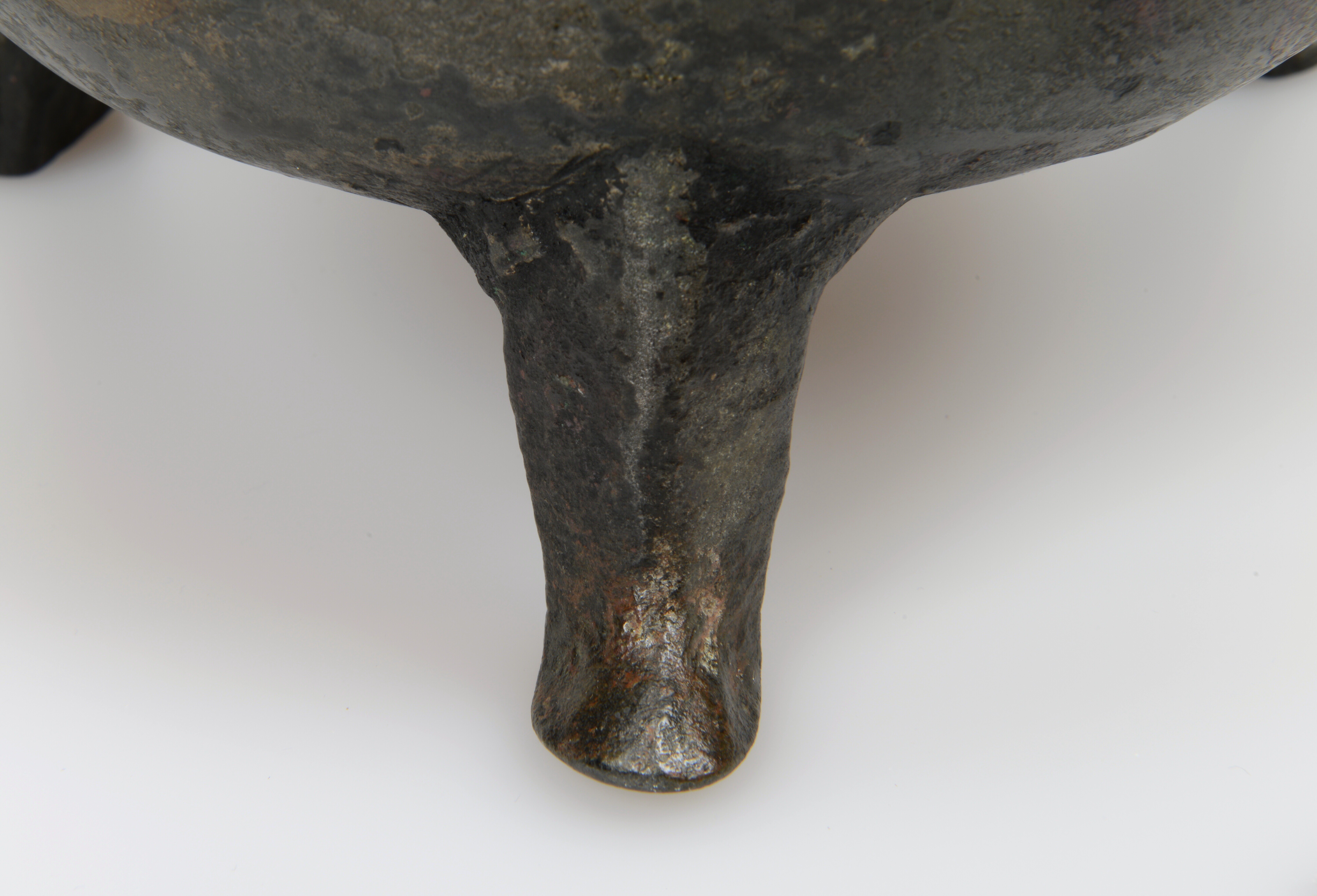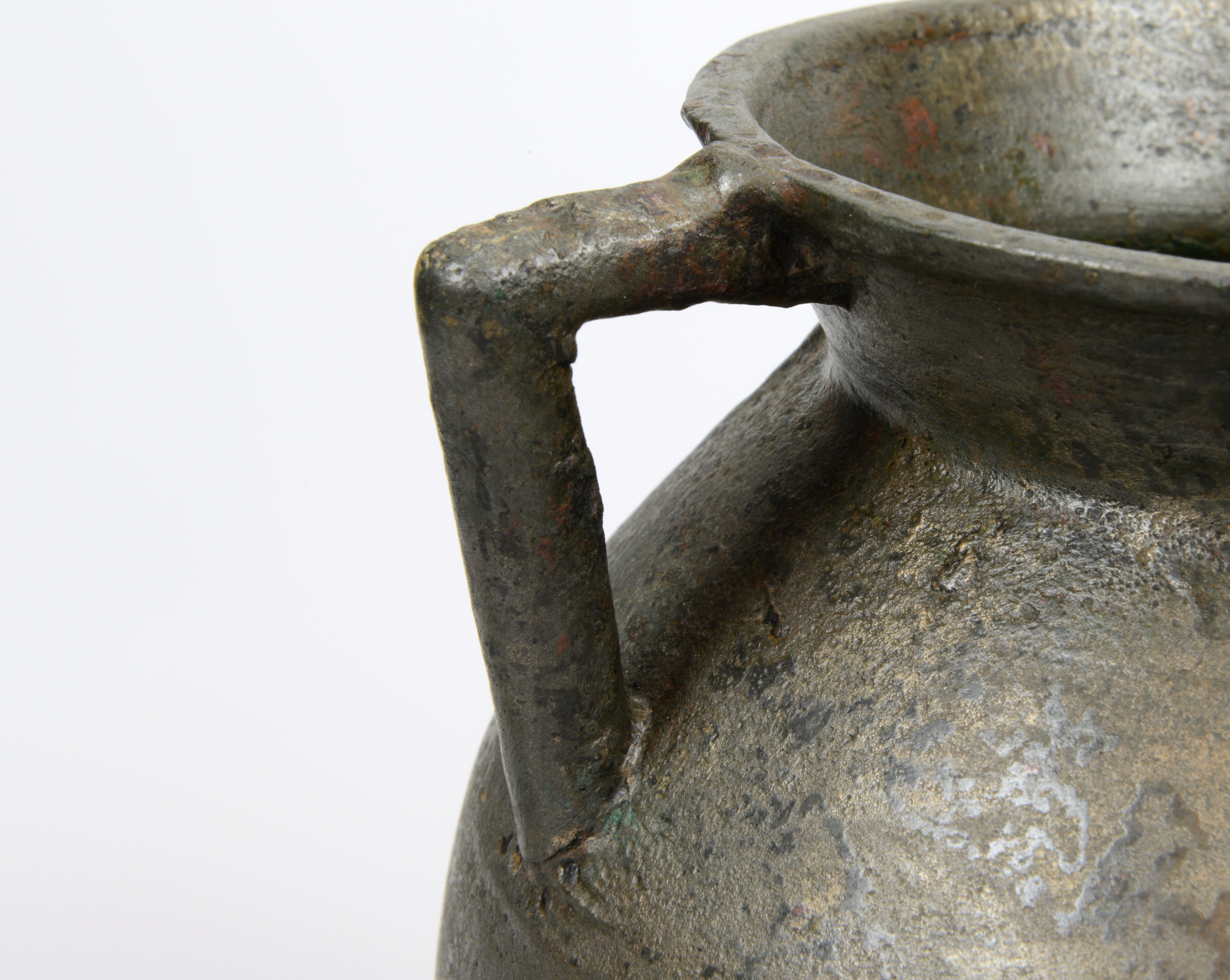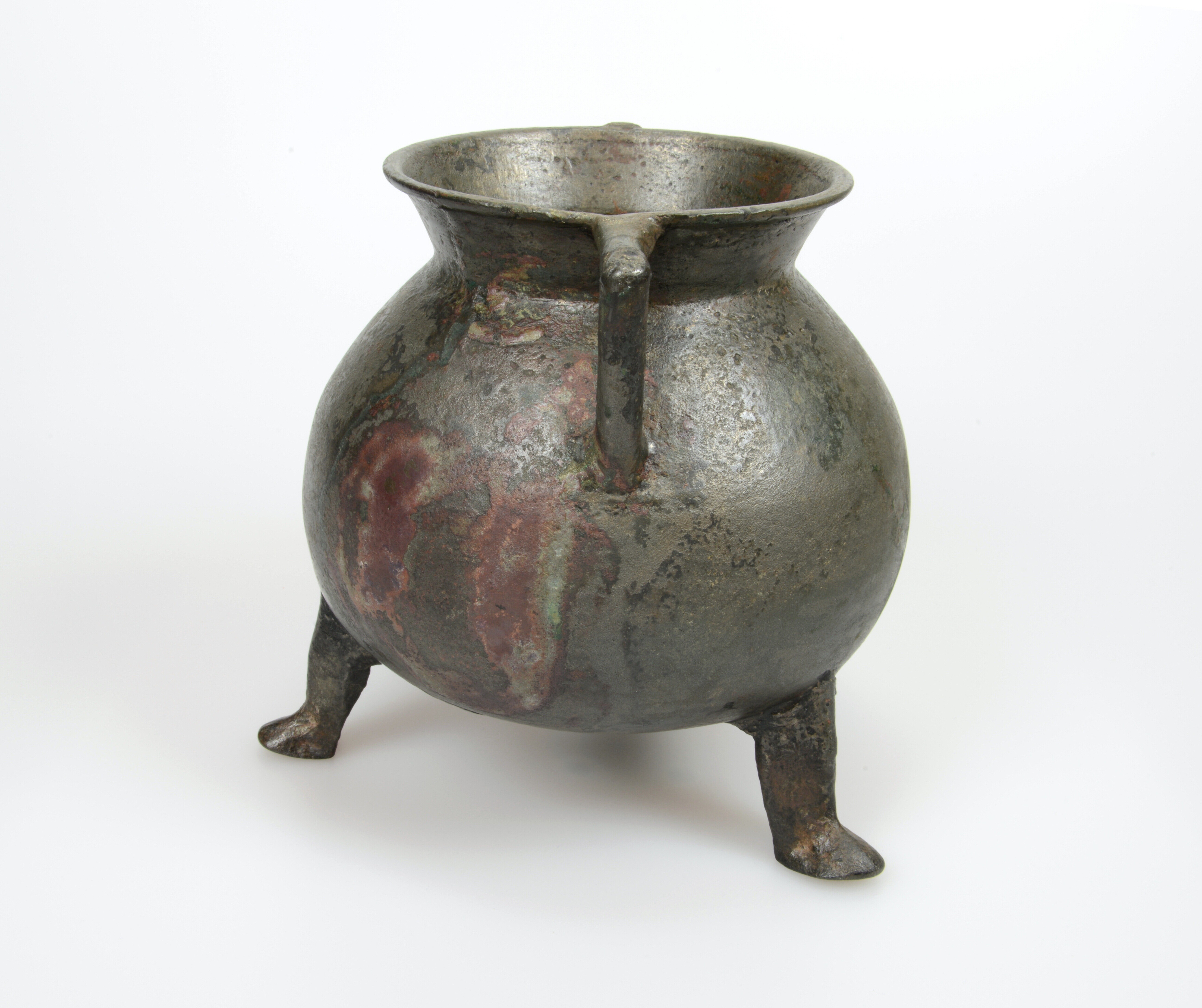 Grape; kogelvormige romp waarbij de overgang van romp naar hals vloeiend verloopt en de liprand rond is. Twee haakoren en de grape staat op drie klauwpoten. De buik bevat een oude reparatie van een klinkplaatje dat bevestigd zit met twee klinknagels