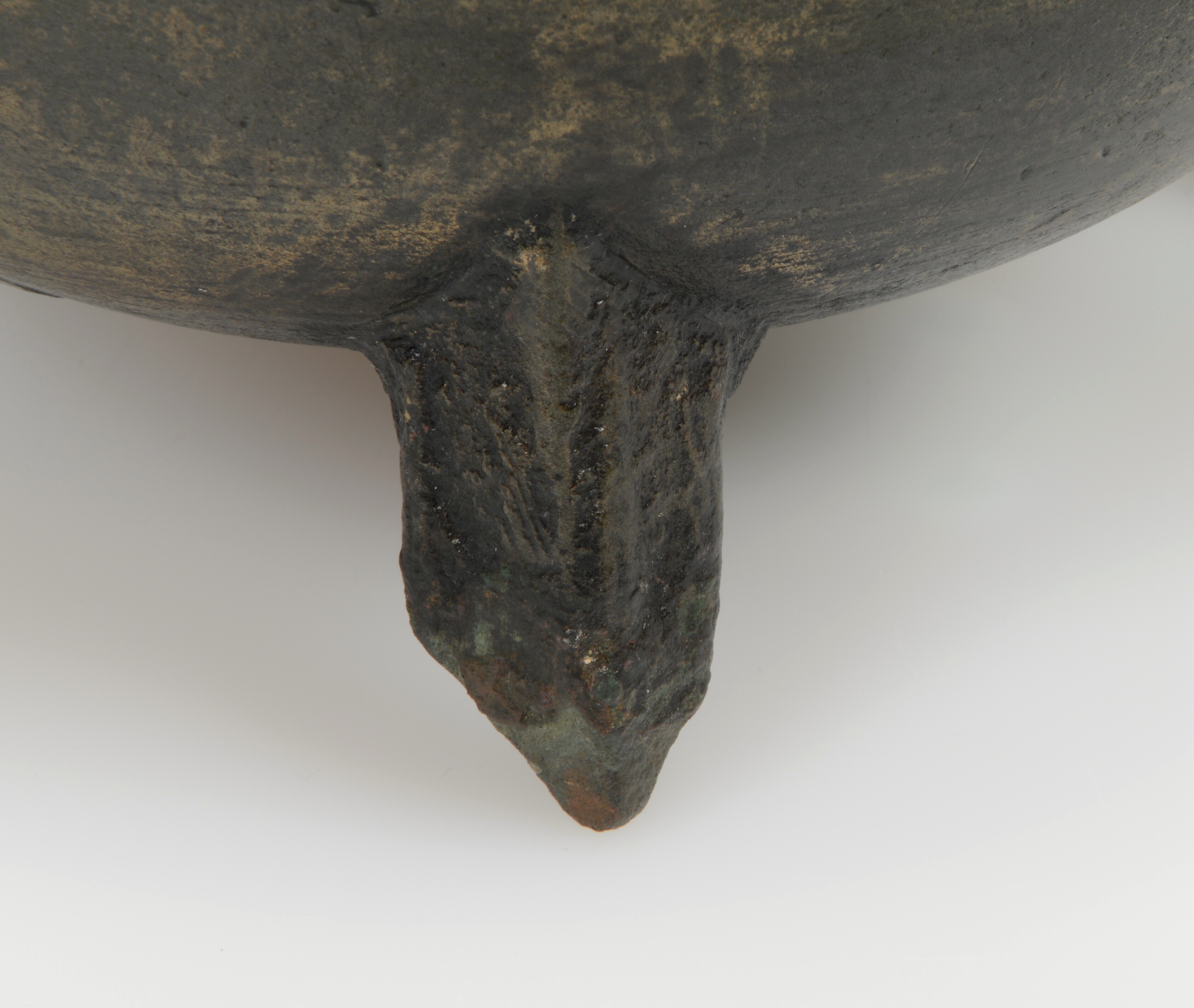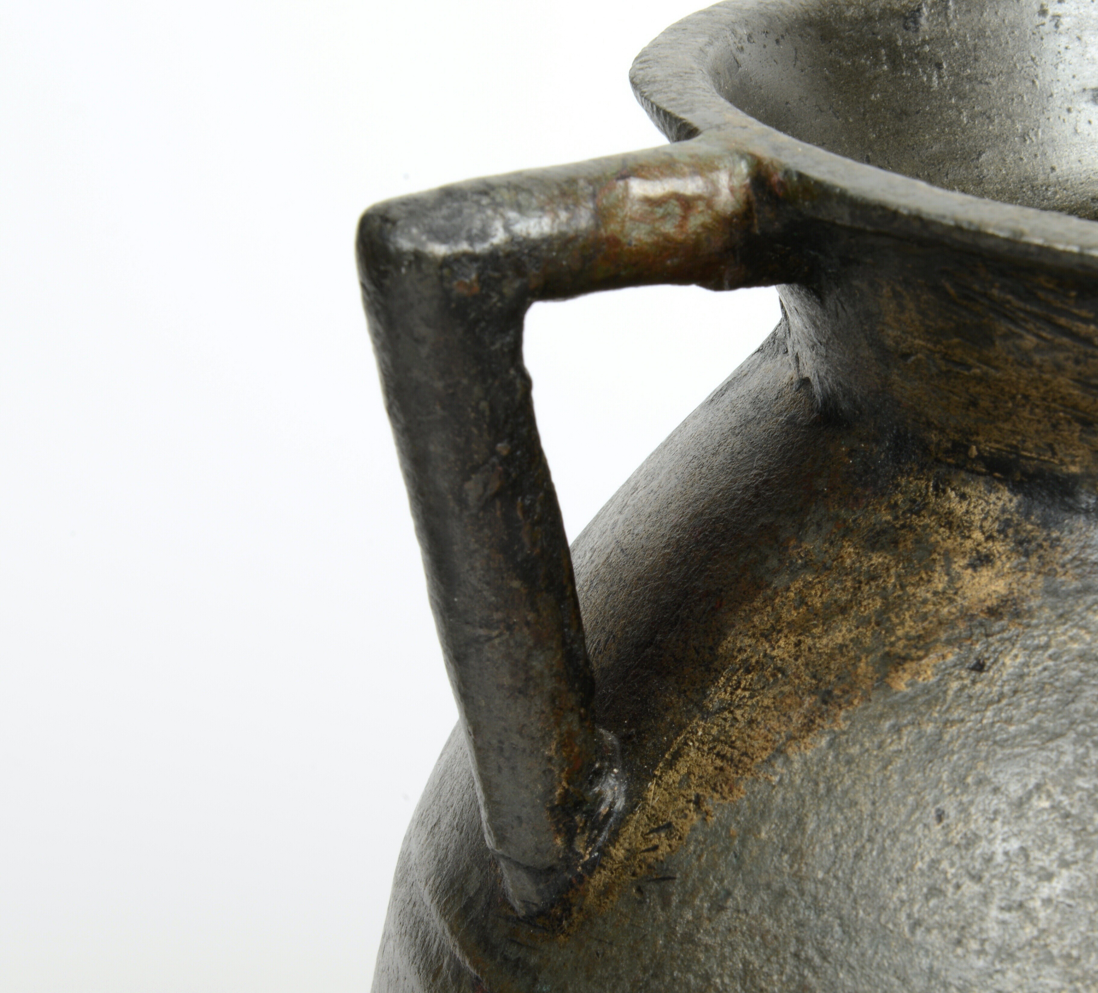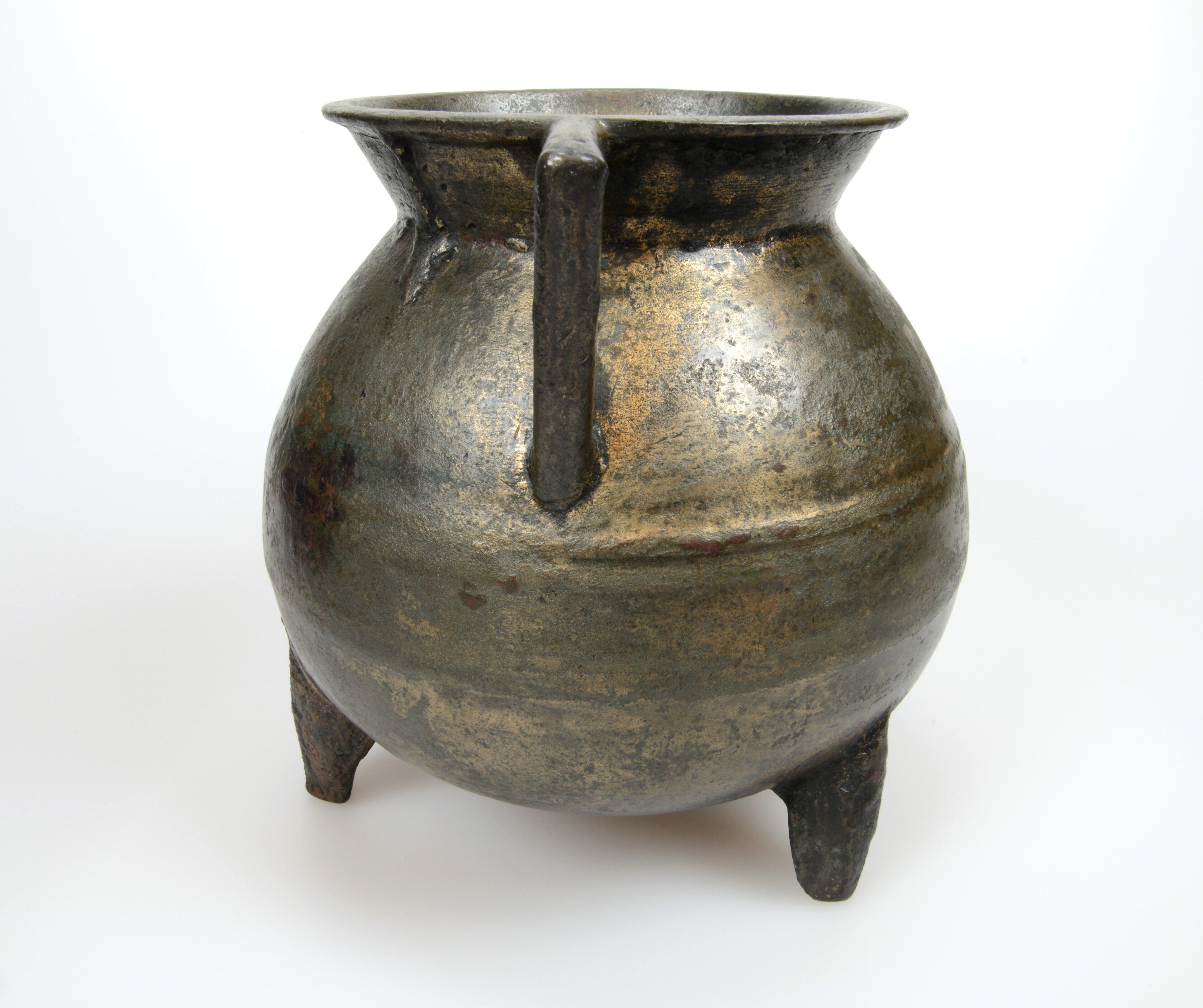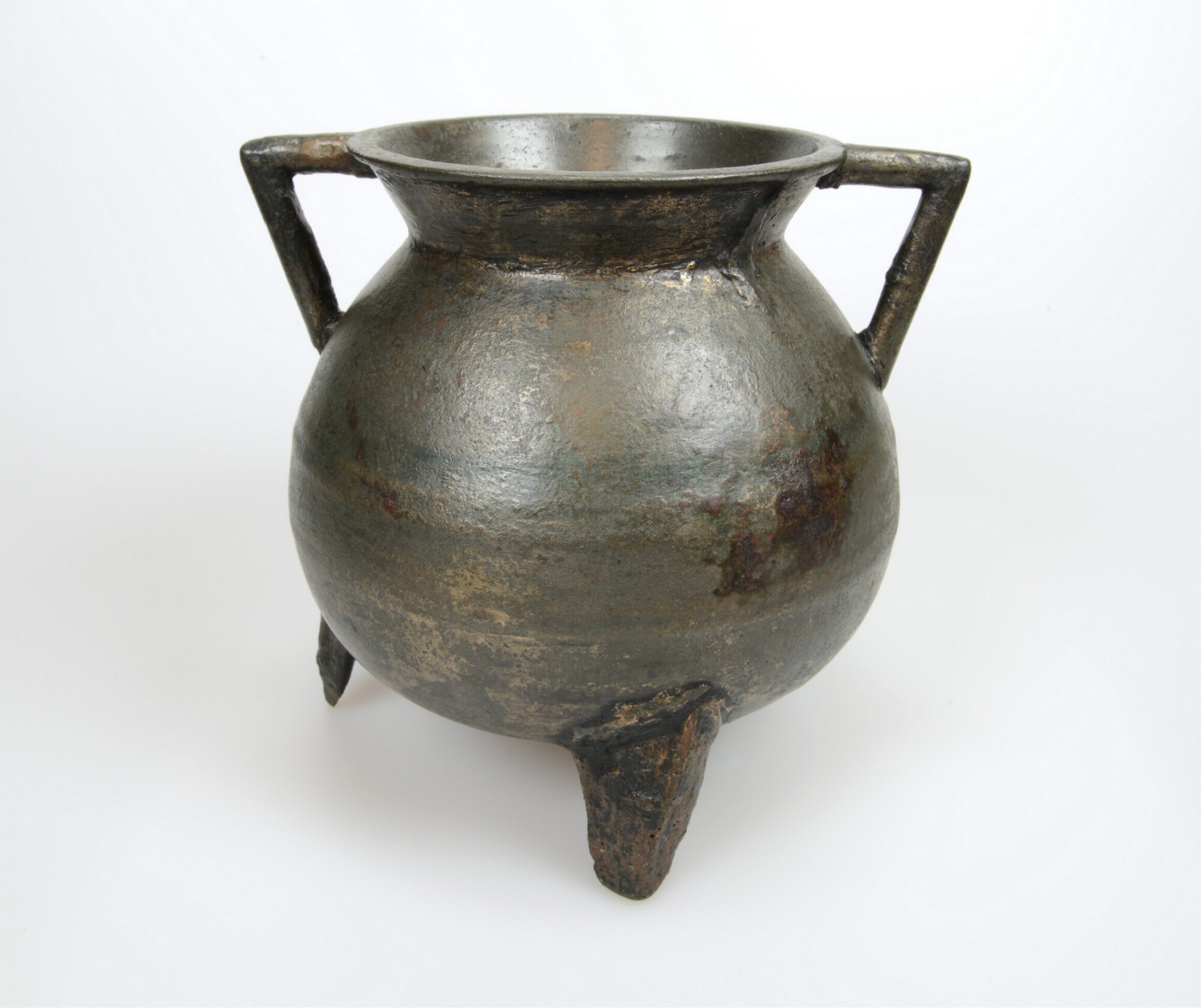 Grape; kogelvormige romp waarbij de overgang van romp naar hals vloeiend verloopt en de liprand rond is. Twee haakoren en de grape staat op drie poten die in doorsnede driehoekig zijn