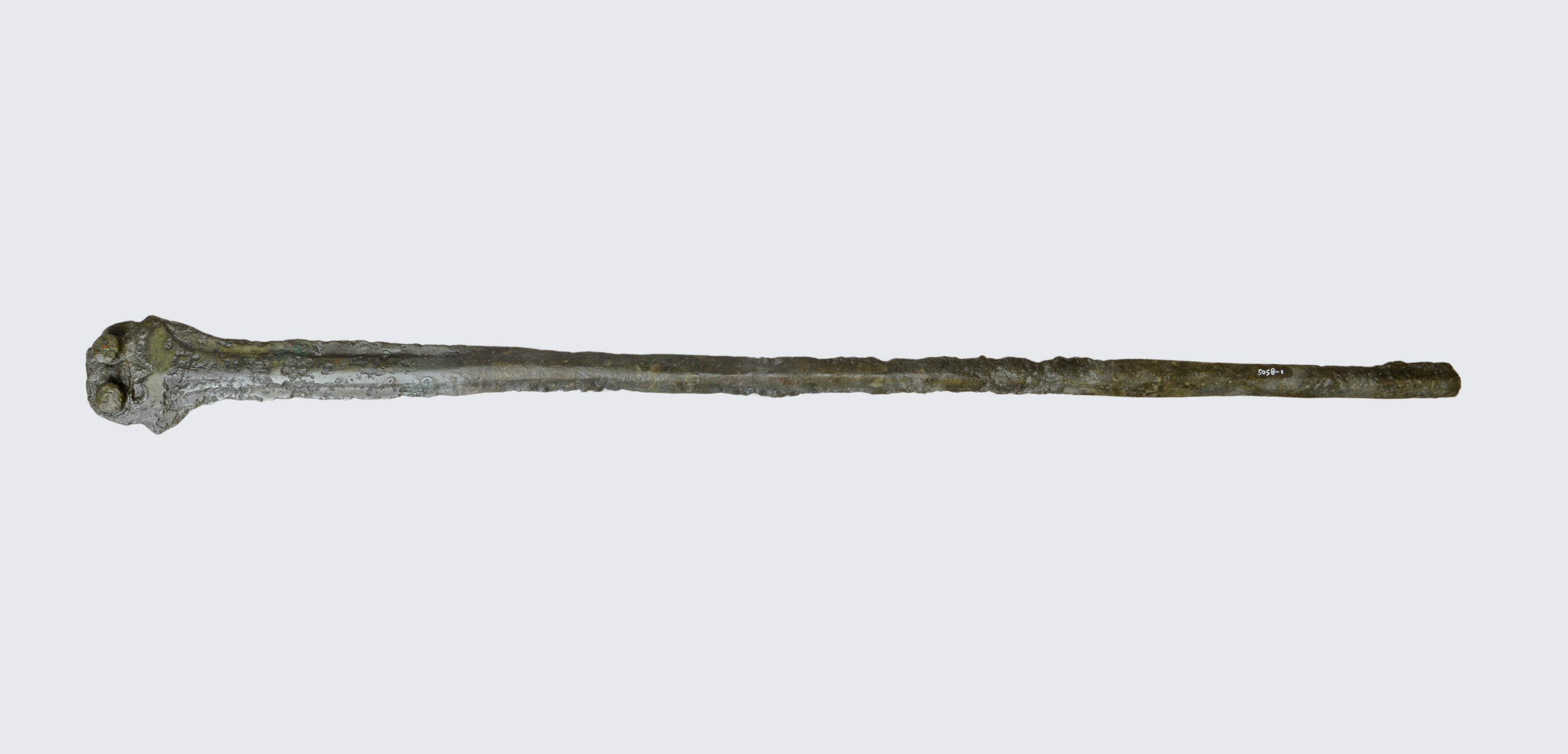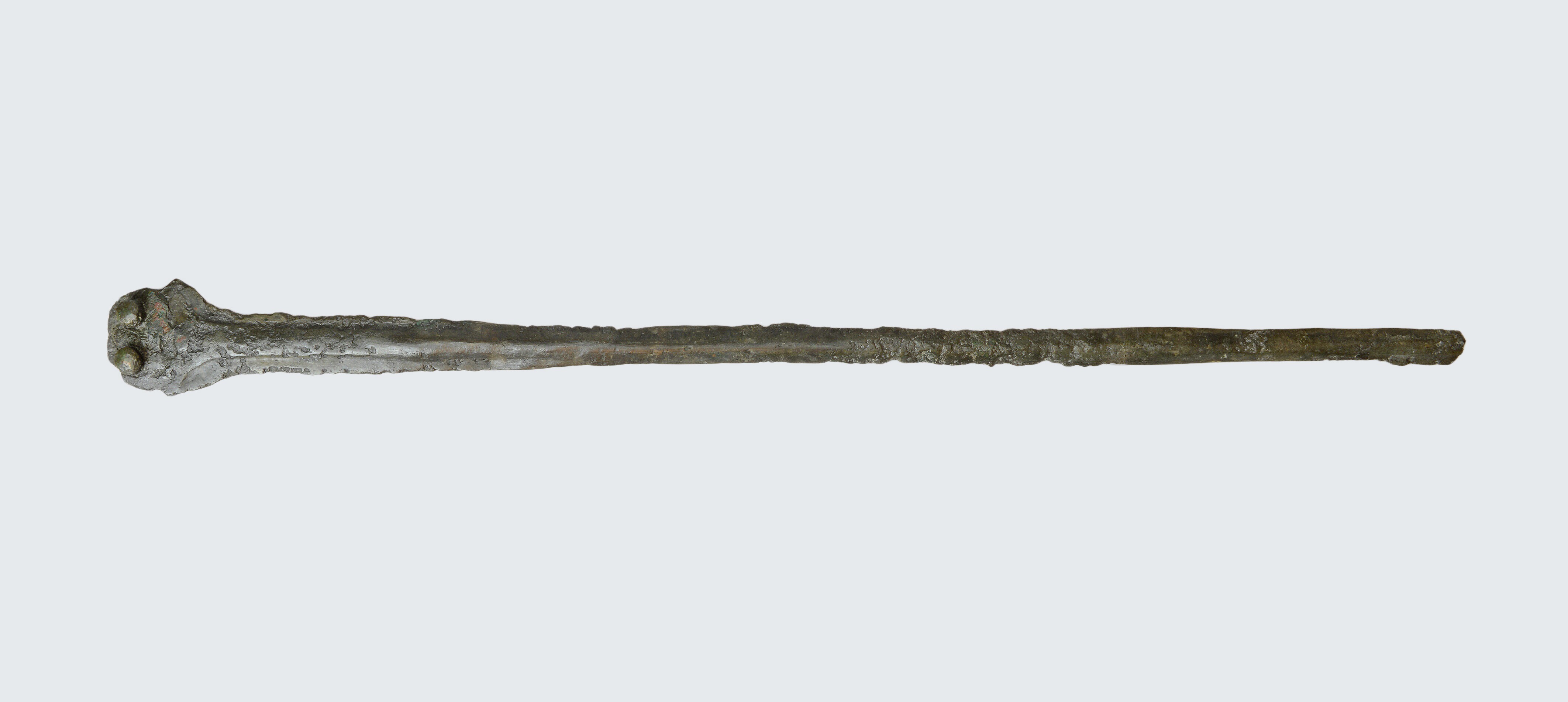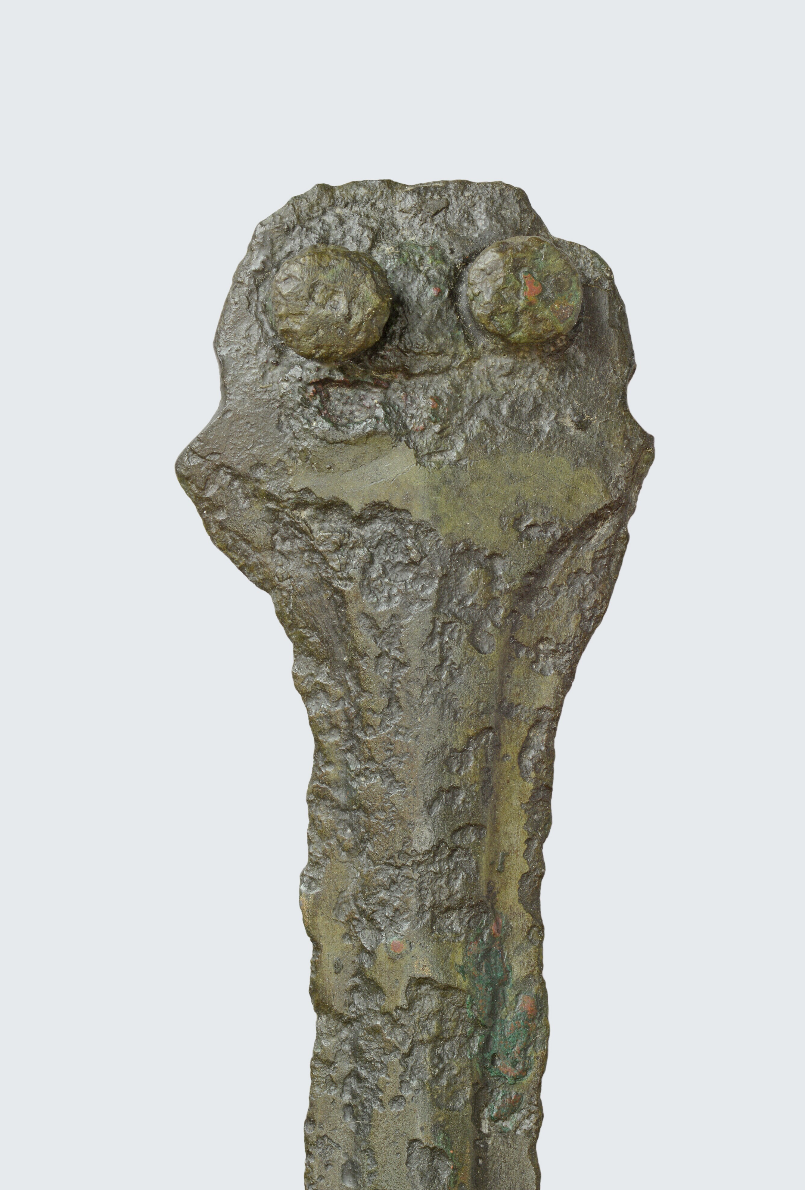 Rapier; trapeziumvorminge gevestplaat met twee bevestigingsnietjes en twee kleinere gaten waar eveneens nietjes gezeten hebben; herkomst: Zuid-Duitsland?