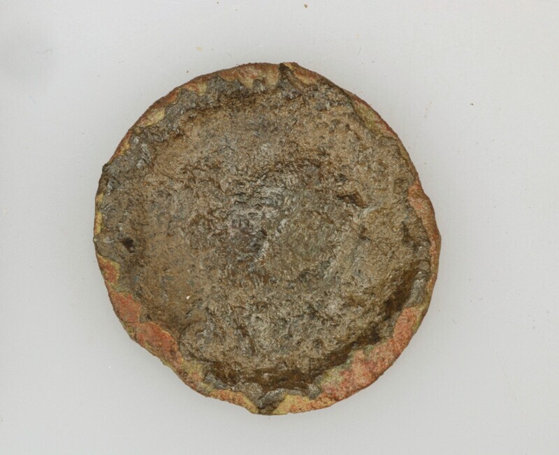 Pseudo-muntfibula; type Frick 1.3; parelrand en drie bevestigingshaken (?) aan onderzijde; gewicht: 3.02 gram
