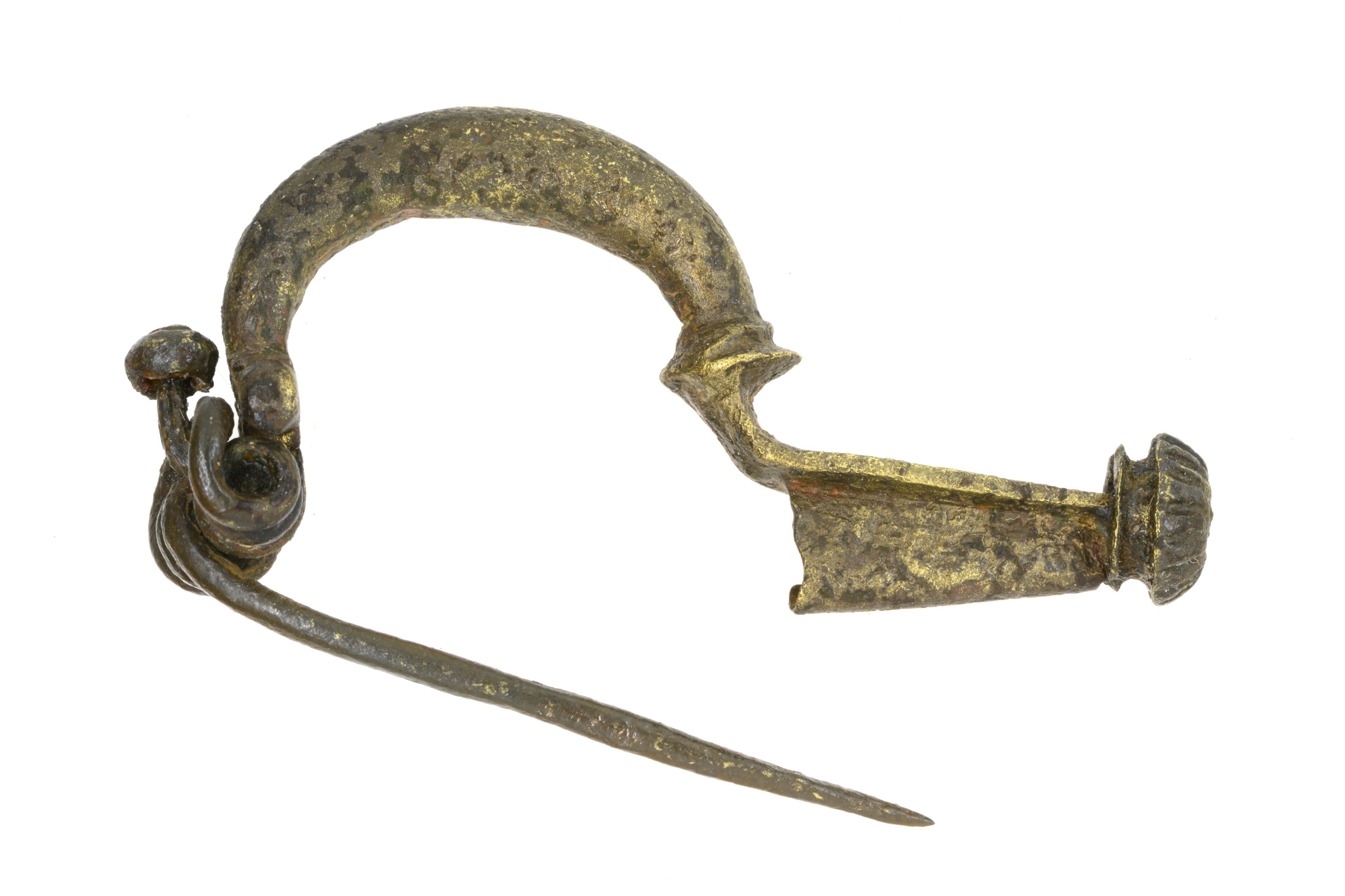 Boogfibula; veerhaak en gladde steunplaten. Beugel versierd met een lijn en de voet eindigt in een geprofileerde knop