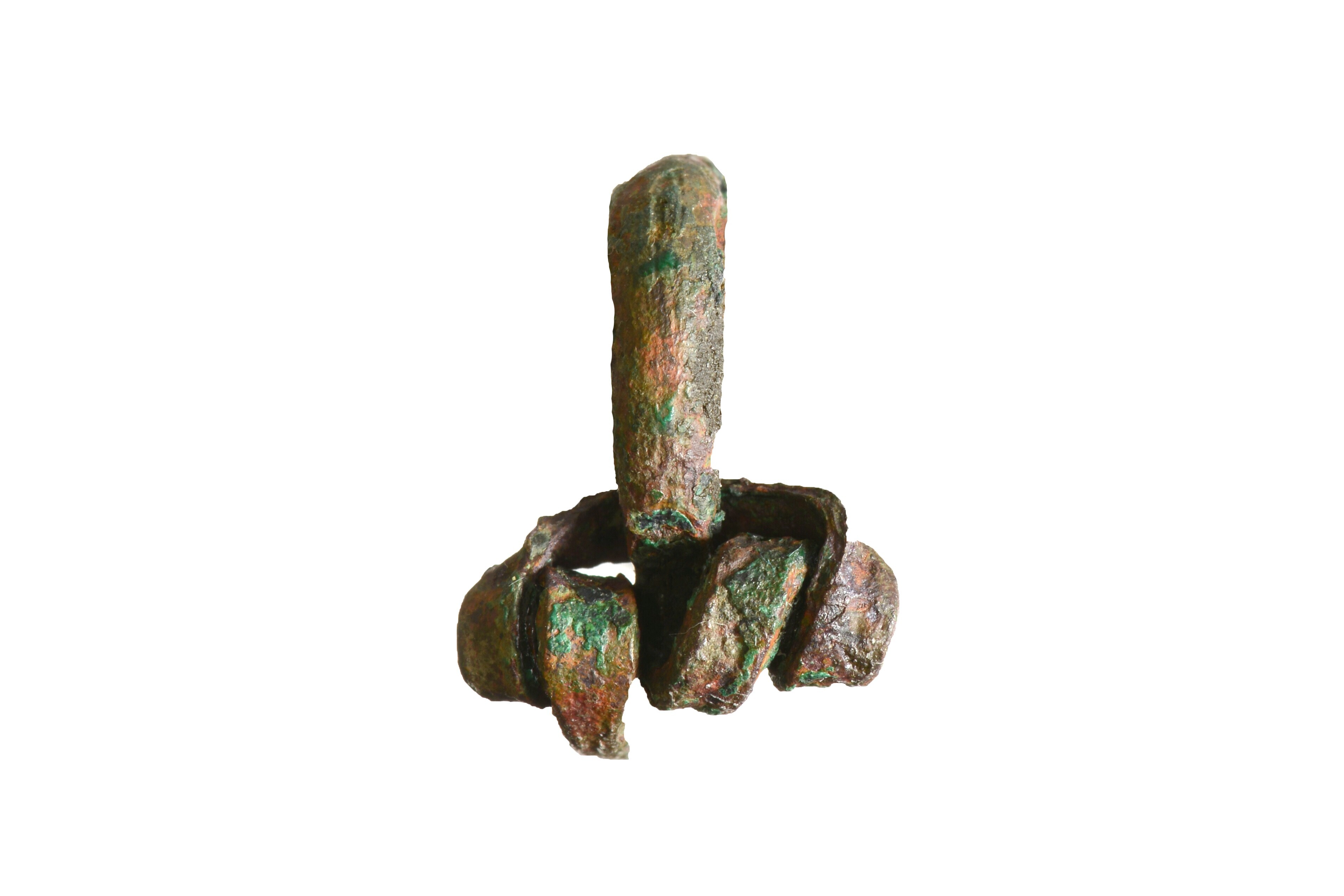Fibula; type Heeren/Van der Feijst 45?; hoekig gebogen draadfibula?; onderdraadse fibula met vier windingen van de spiraal, hoekig gebogen beugel