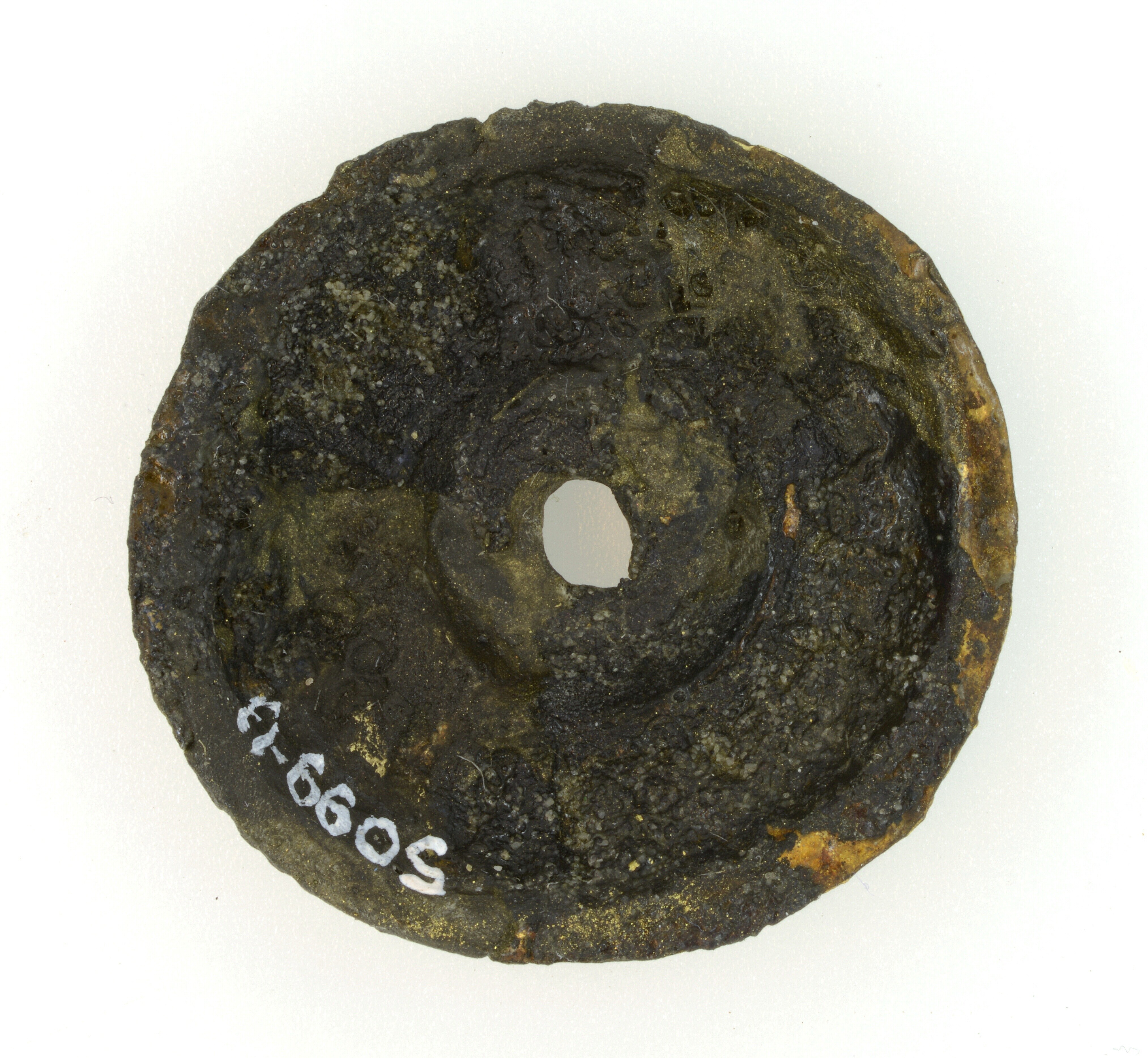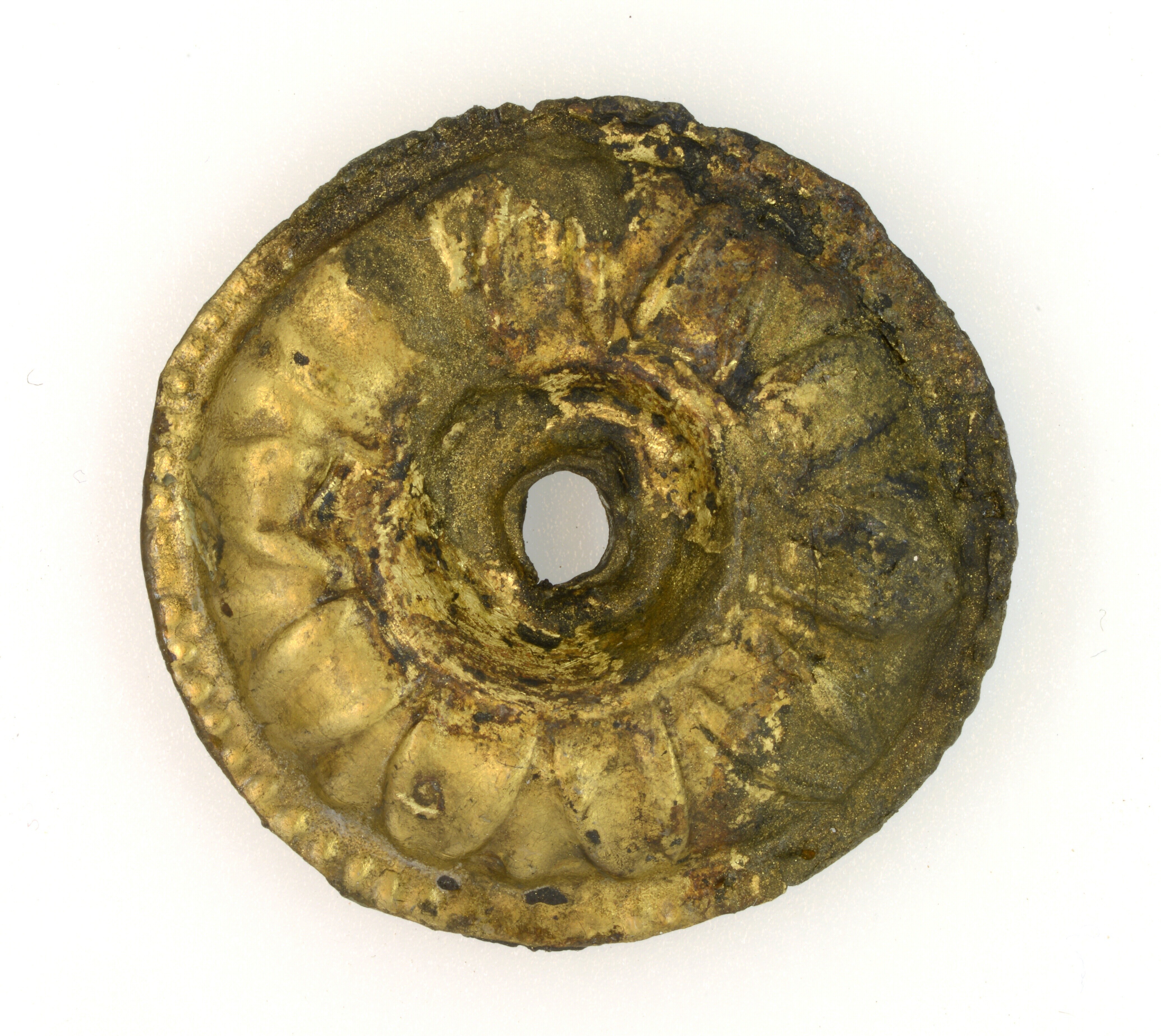 Beslagknop; lorica segmentata; type 1; bevestigd op blik. gestileerd bloemmotief