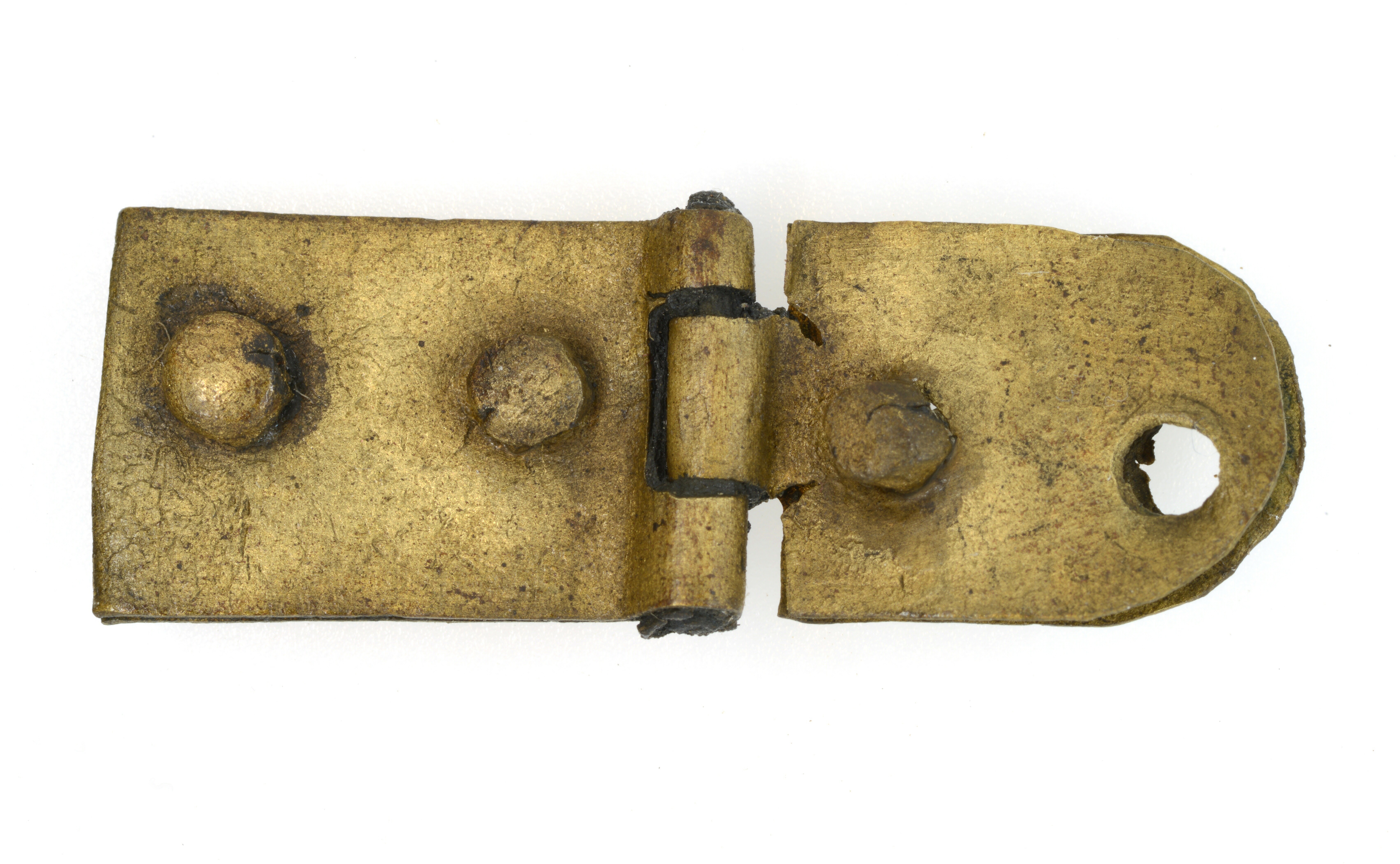 Riemscharnier; onderdeel Cingulum-beslag lorica segmentata; twee scharnierende plaatjes met klinknagels