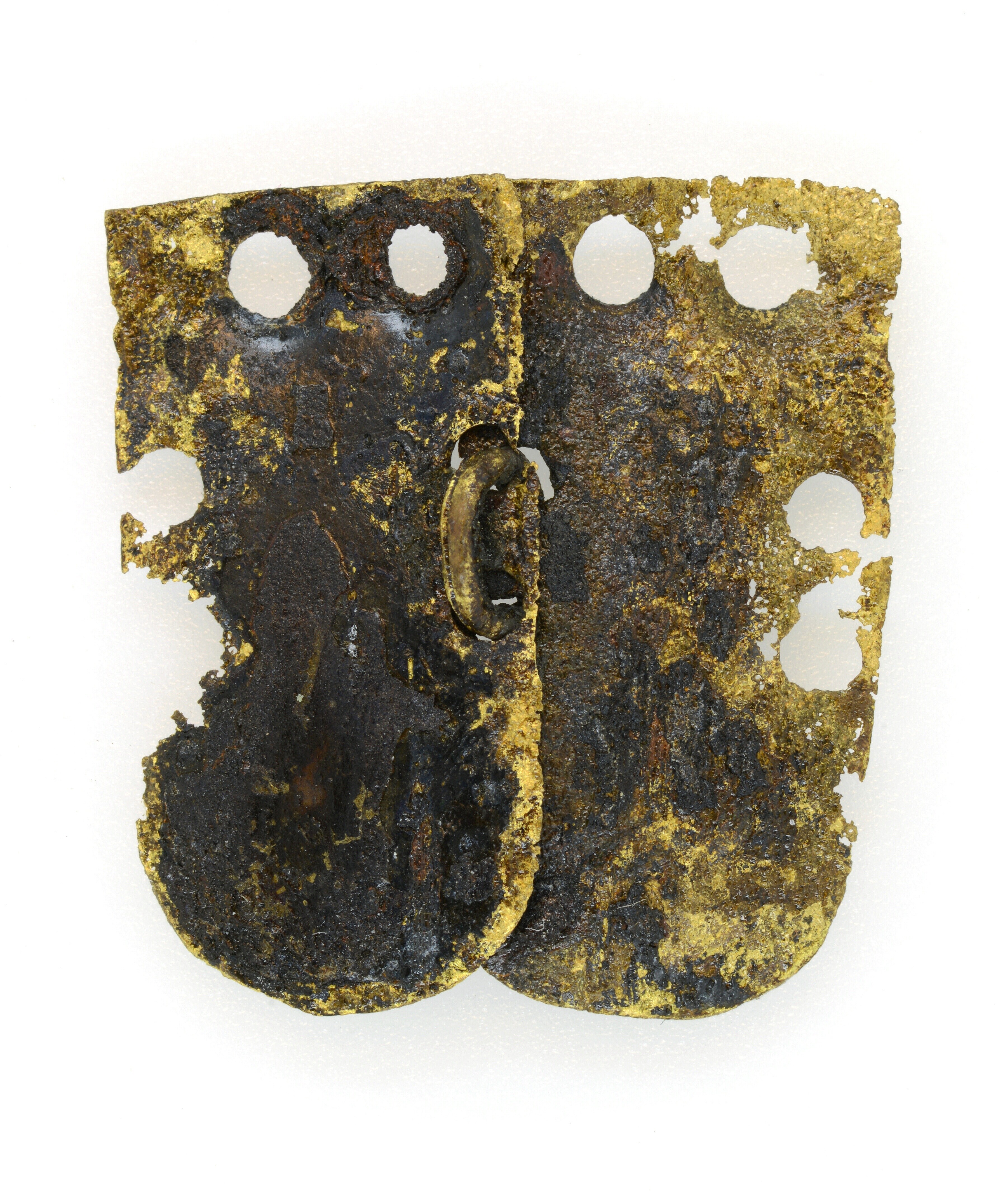 Lorica squamata/schubpantser; twee rechthoekige harnasplaatjes met afgeronde zijde en bevestigingsgaten; vondstgegevens: bl 270296; 176,7 meter Noord uit ijsb.sl. ; 1219 (vondstnummer ?)