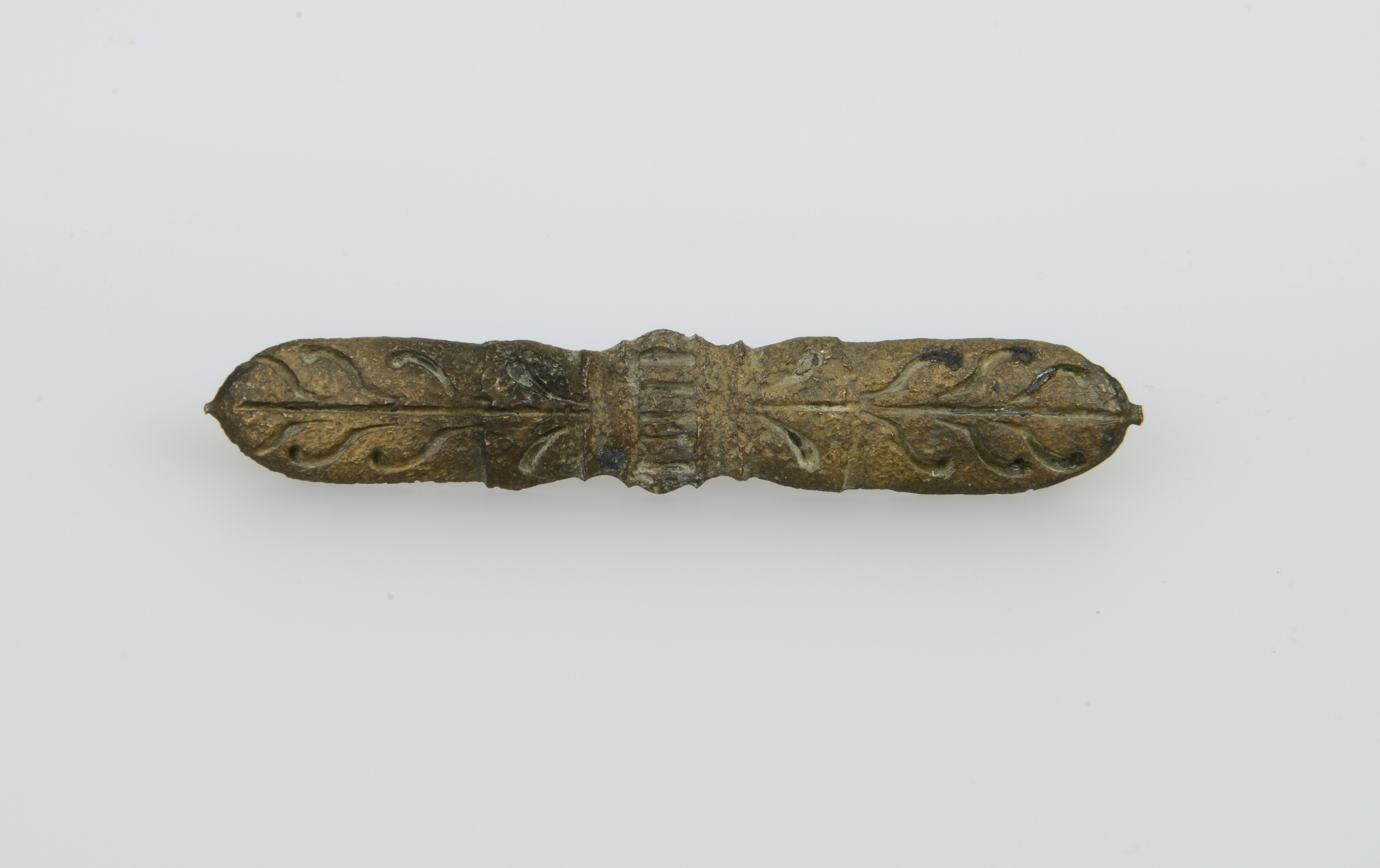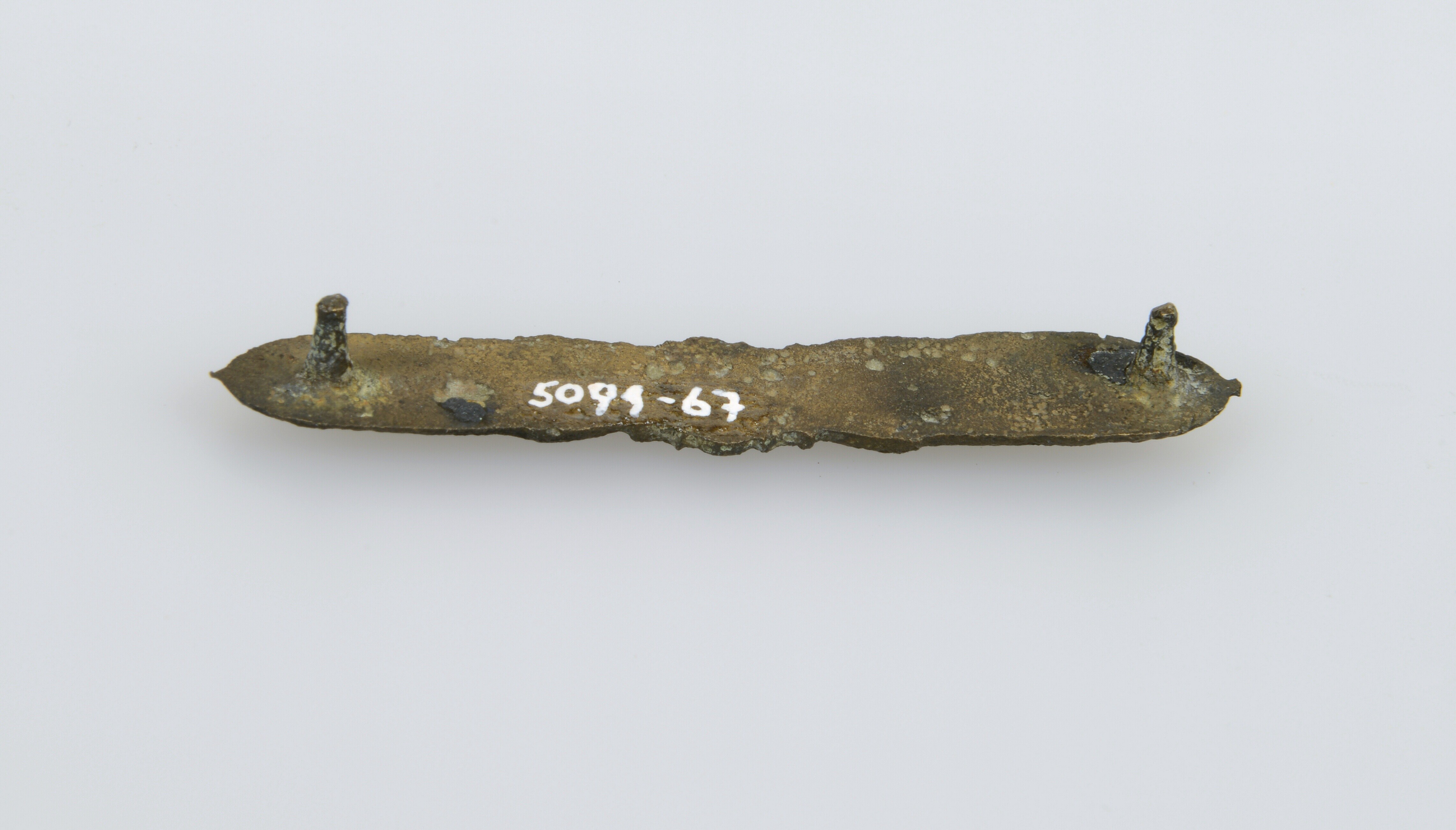Beslagplaat; type Bishop strap mount 4d; oorspronkelijk met niëllo-inleg; rechthoekig met afgeronde hoeken en een geometrisch motief op de voorzijde. Aan de achterzijde bevinden zich twee klinknagels