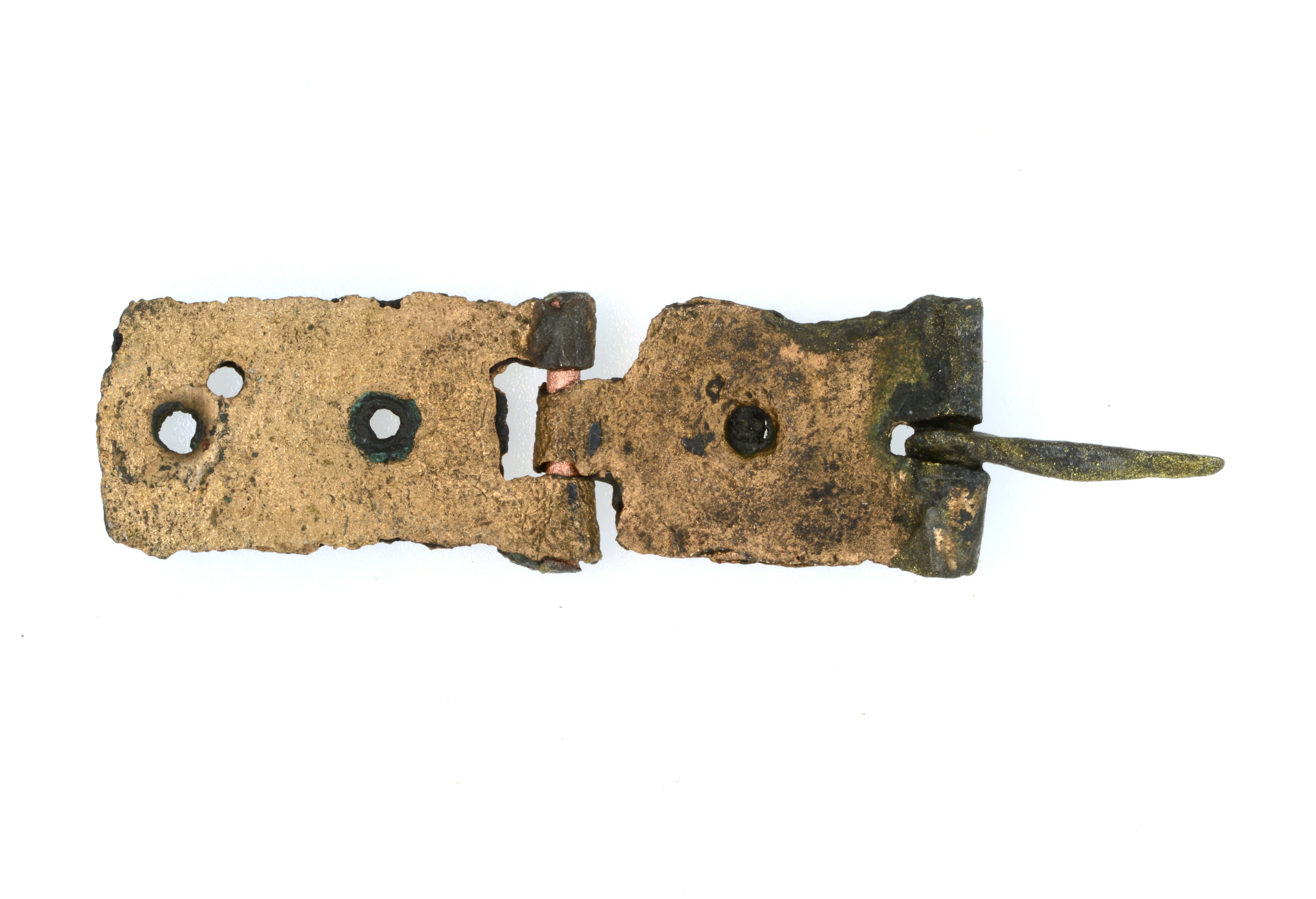 Pantsergesp; onderdeel cingulumbeslag; twee scharnierende plaatjes en een halfronde gesp