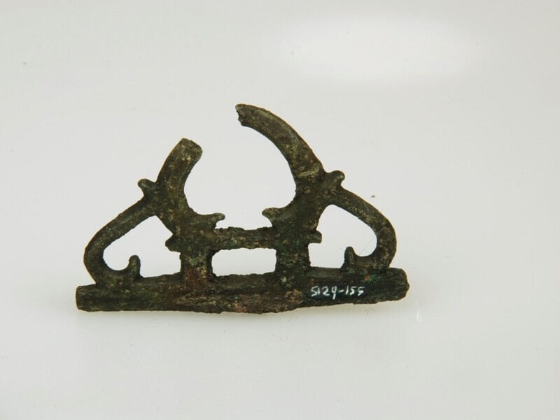 Beslag; opengewerkt balteus-beslag; klein deel van versiering afgebroken; punt versiering op de voorzijde vondstdatum: 10-4; vondstomstandigheden: detector na verwijdering bovengrond.