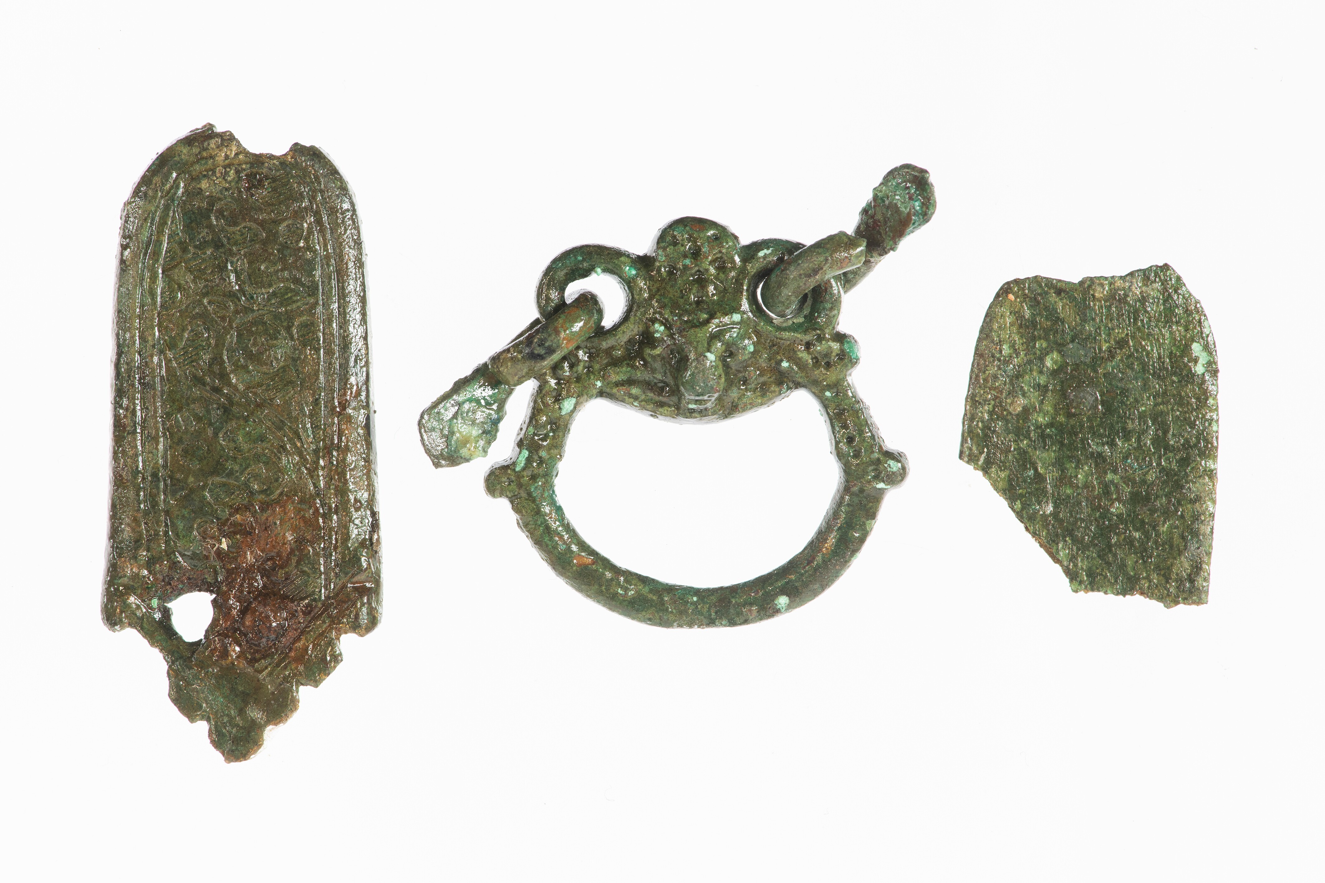 Riemverdeler; twee fragmenten van versierde riemtongen met verdeler