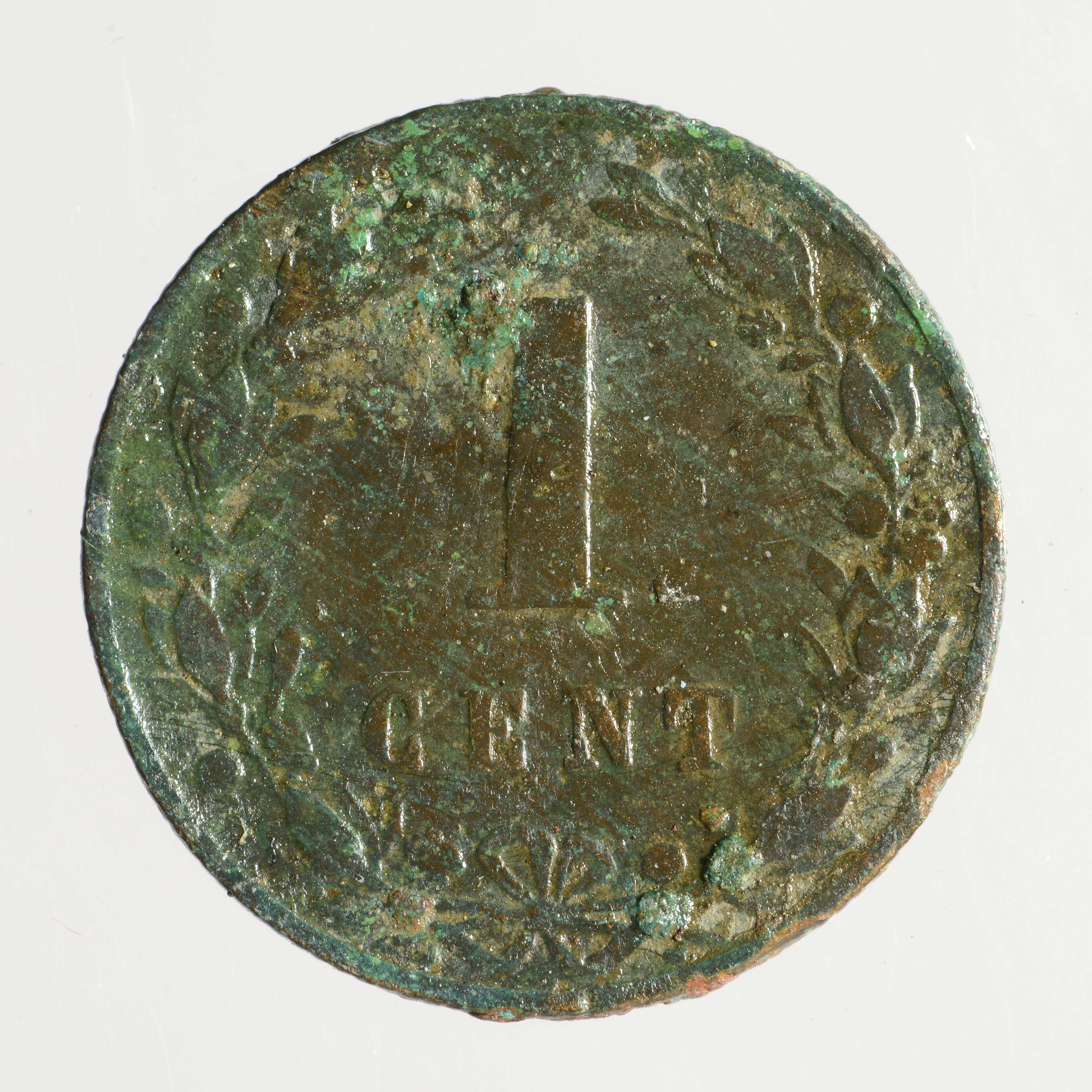 Cent; Nederland Koninkrijk (1813-heden); Willem III (1849-1890); vz.: klimmende leeuw naar links met zwaard en pijlenbundel binnen parelcirkel, met omschrift (bijl) KONINGRIJK DER NEDERLANDEN (mercuriusstaf) 1882; kz.: binnen een krans van twee samengebonden oranjetakken in twee regels: 1 / CENT; muntplaats: Utrecht; gewicht: 2.36 gram