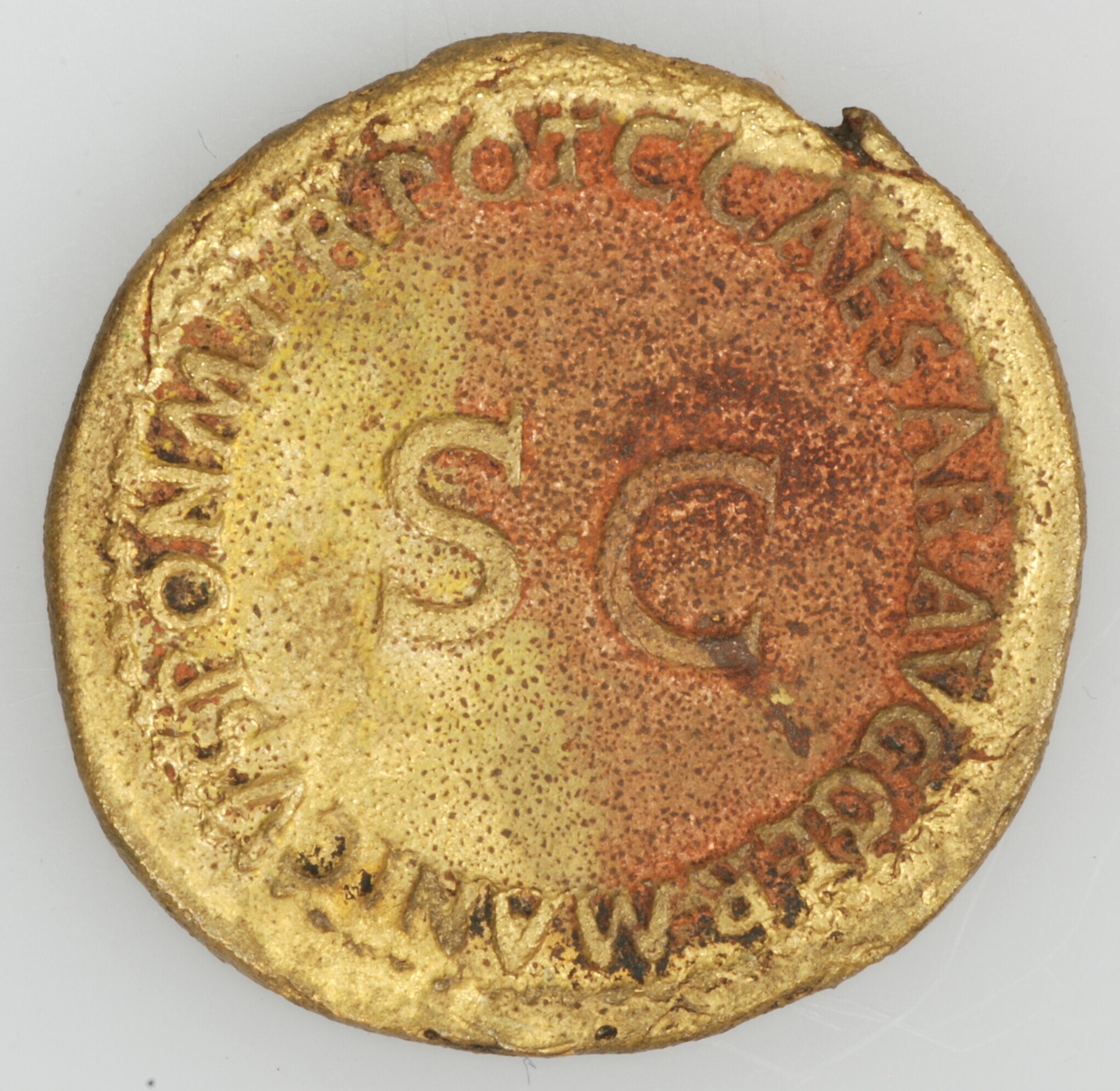 Dupondius Caligua; RIC2 34, BMC 44; vz.: de broers op twee paarden naar rechts met omschrift ''NERO ET DRVSVS CAESARES''; kz.: in het midden staat ''SC'' met het omschrift ''C.CAESAR.AVG.GERMANICVS.PON.M.TR.POT; gewicht: 12.49 gram
