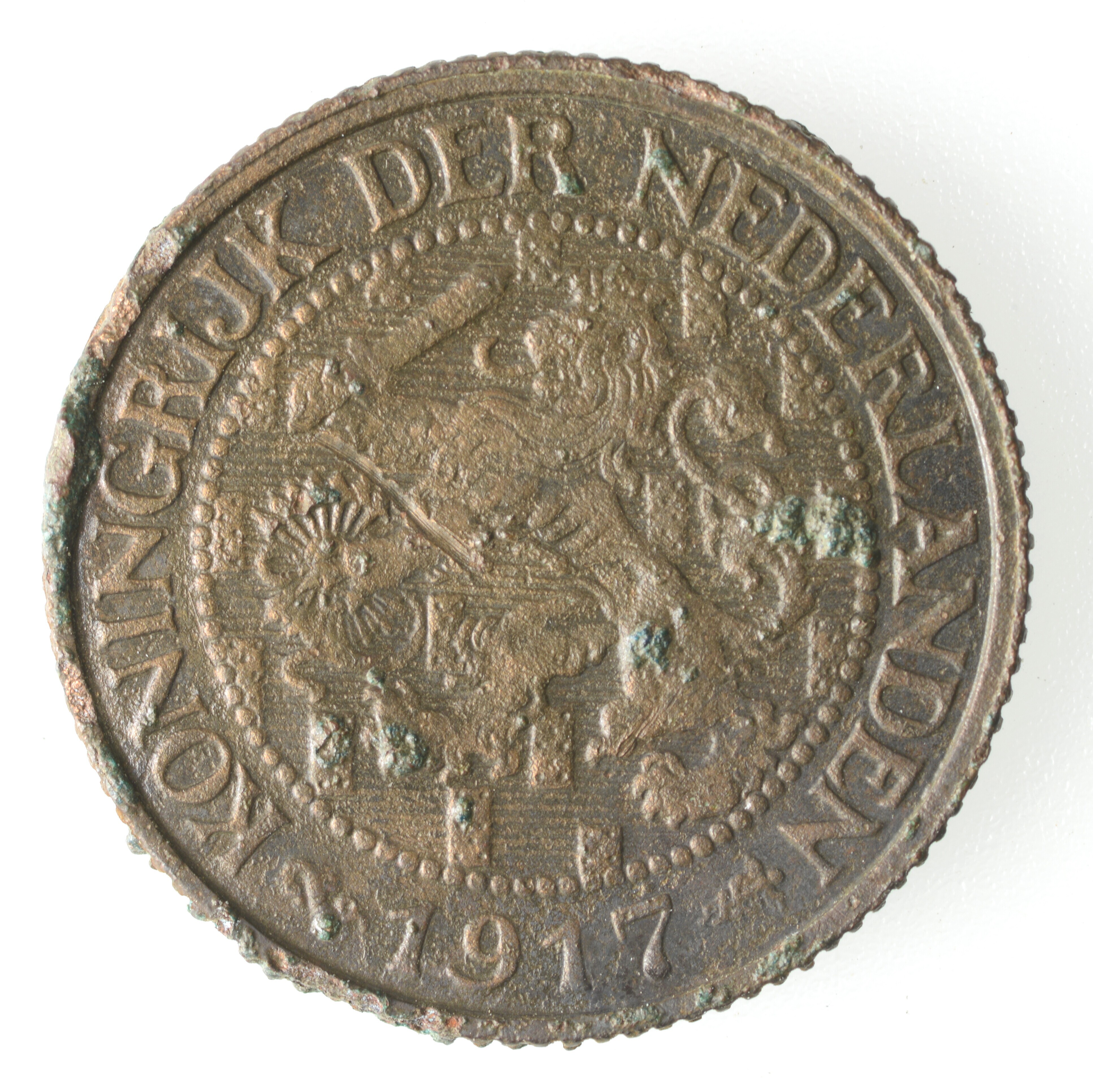 1 Cent Nederland Koninkrijk (1813-heden); Wilhelmina (1890-1948); vz.: klimmende leeuw naar links met zwaard en pijlenbundel op een veld van azuur met zeventien blokken binnen parelcirkel, met omschrift (zeepaardje) KONINGRIJK DER NEDERLANDEN (mercuriusstaf) 1917; kz.: binnen een krans van twee samengebonden oranjetakken in twee regels: 1 / CENT; muntplaats: Utrecht; gewicht: 2.45 gram