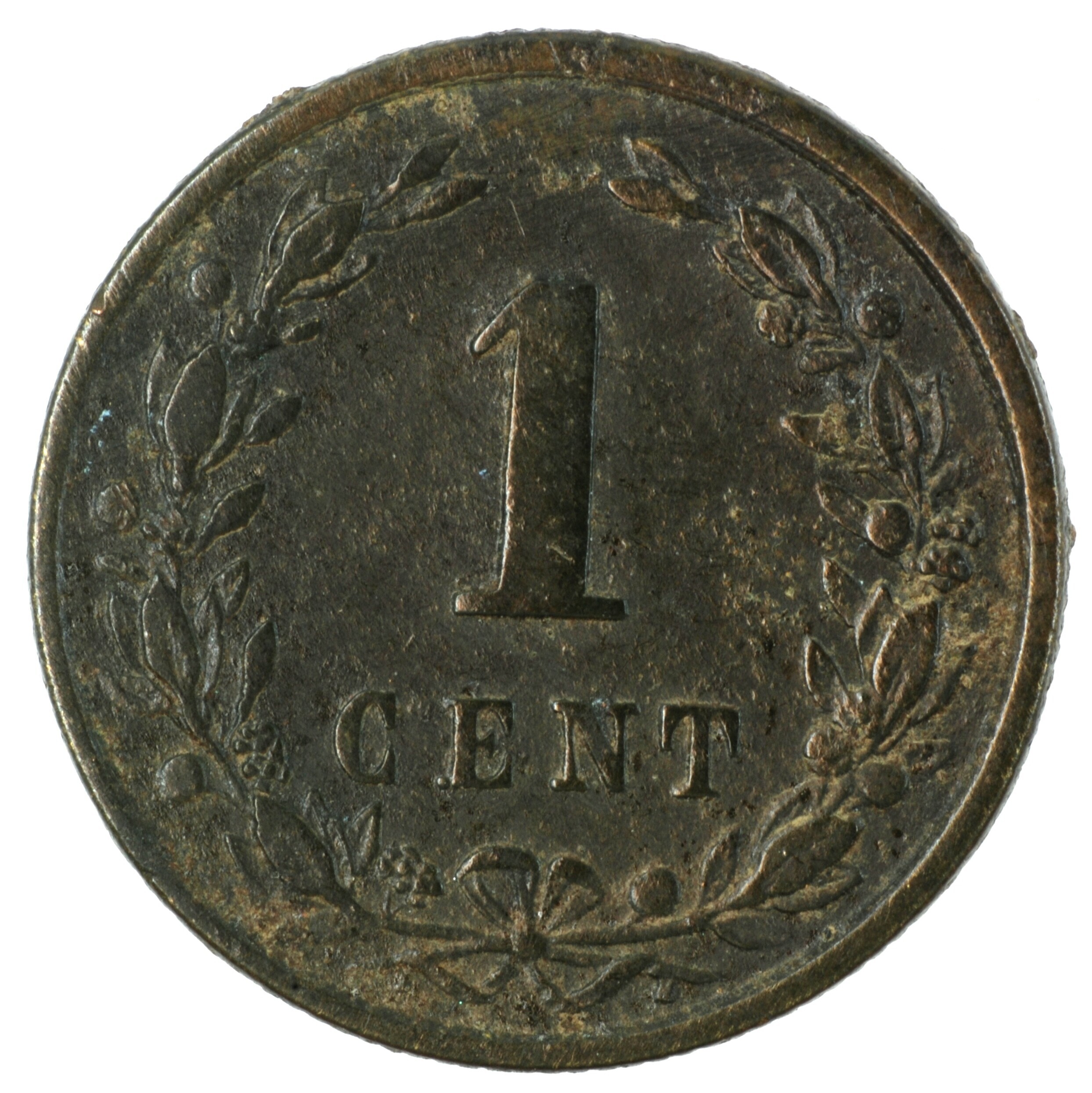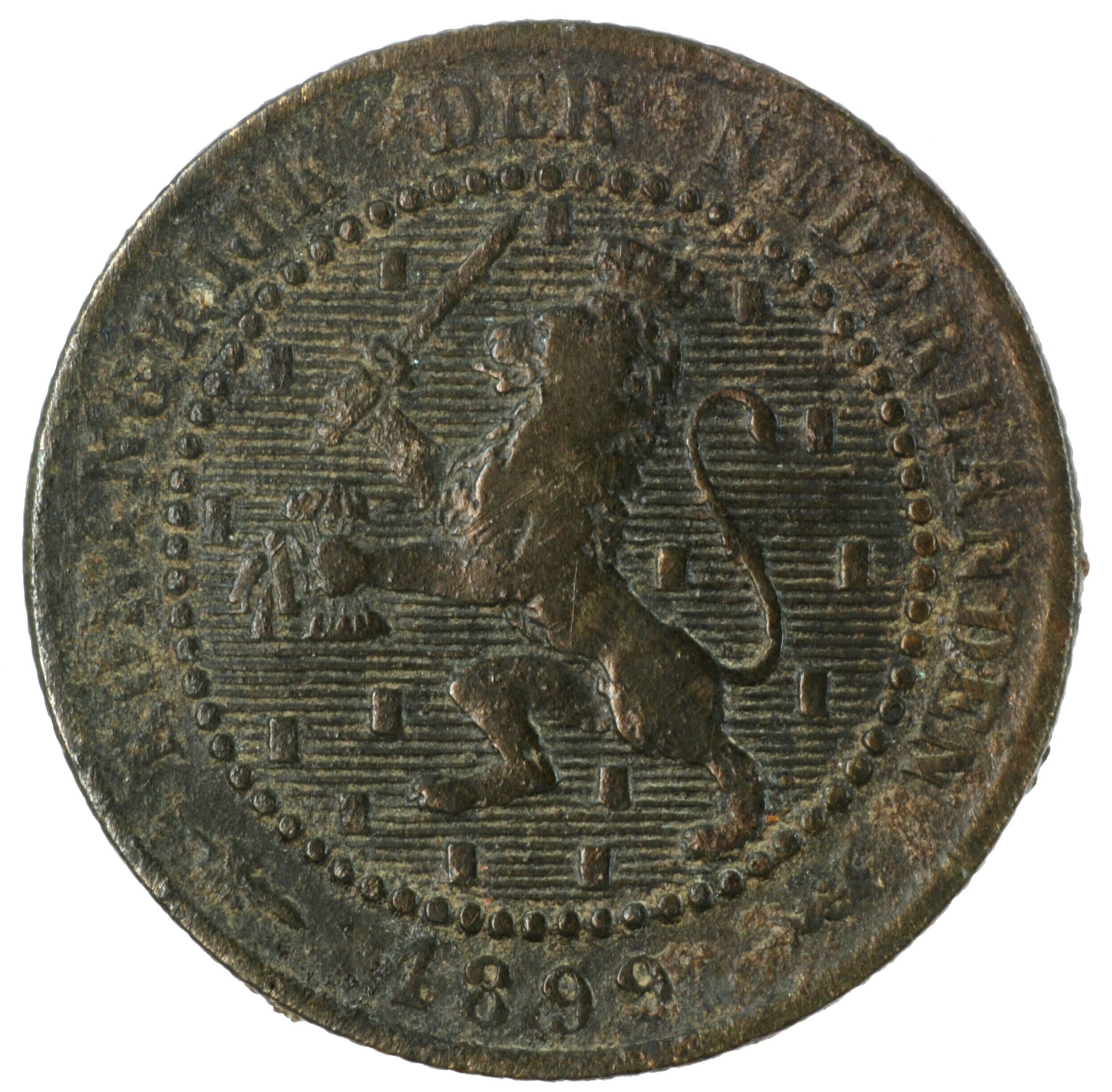 Cent; Nederland Koninkrijk (1813-heden); Wilhelmina (1890-1948); vz.: klimmende leeuw naar links met zwaard en pijlenbundel op een veld van azuur met zeventien blokken binnen parelcirkel, met omschrift (hellebaard) KONINGRIJK DER NEDERLANDEN (mercuriusstaf) 1899; kz.: binnen een krans van twee samengebonden oranjetakken in twee regels: 1 / CENT; muntplaats: Utrecht; gewicht: 2.42 gram; referentie: Schulman 967