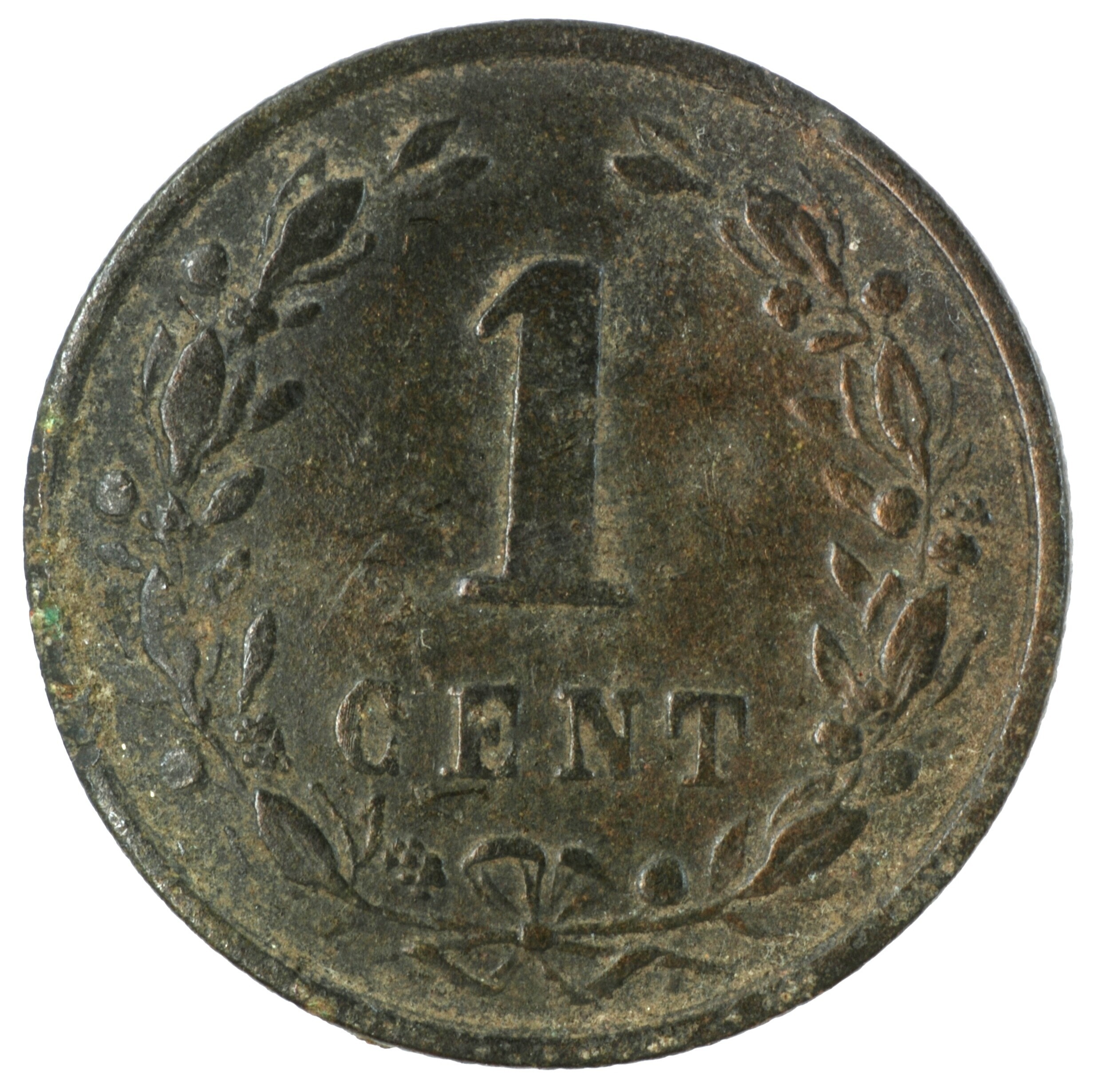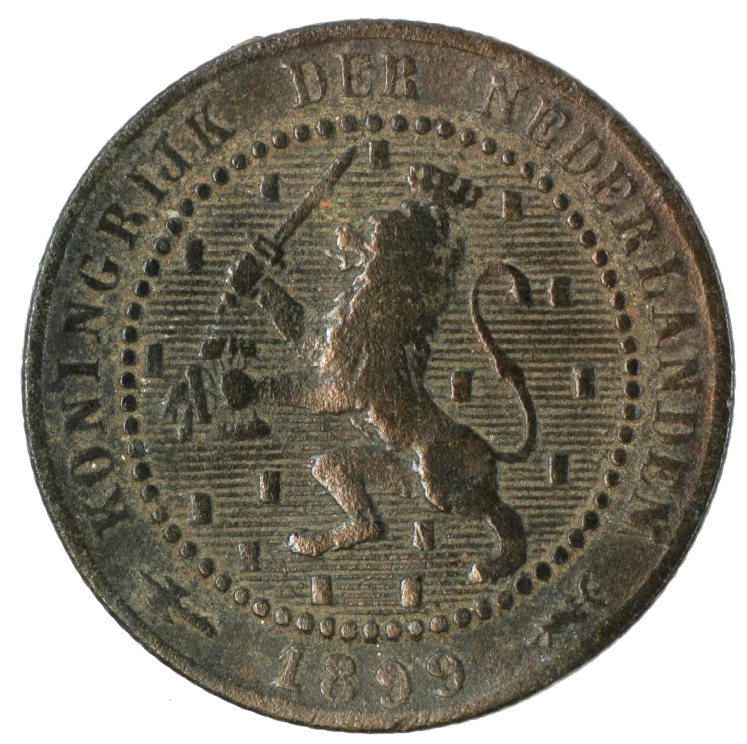 Cent; Nederland Koninkrijk (1813-heden); Wilhelmina (1890-1948); vz.: klimmende leeuw naar links met zwaard en pijlenbundel op een veld van azuur met zeventien blokken binnen parelcirkel, met omschrift (hellebaard) KONINGRIJK DER NEDERLANDEN (mercuriusstaf) 1899; kz.: binnen een krans van twee samengebonden oranjetakken in twee regels: 1 / CENT; muntplaats: Utrecht; gewicht: 2.34 gram; referentie: Schulman 967